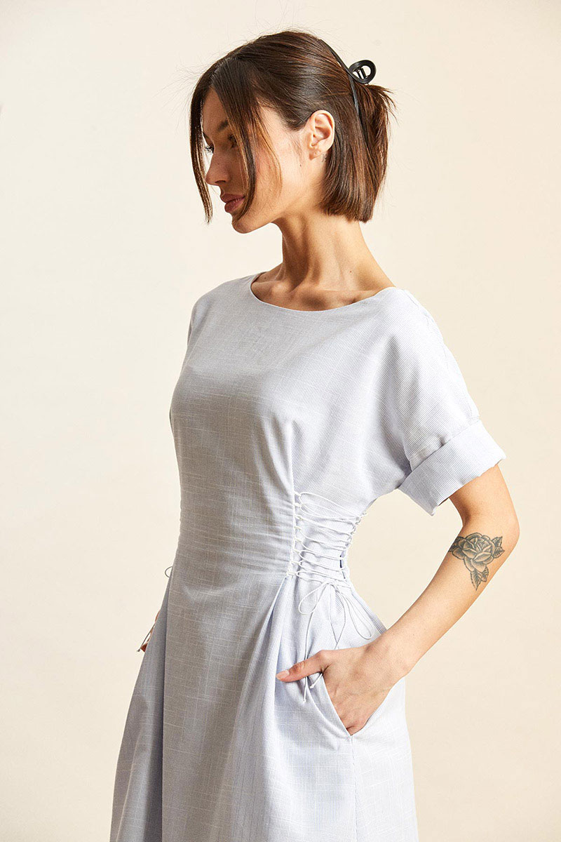 - спереди и сзади на талии рельефы, в каждый вставлено по 8 петель, через которые по бокам сделана эластичная шнуровка.