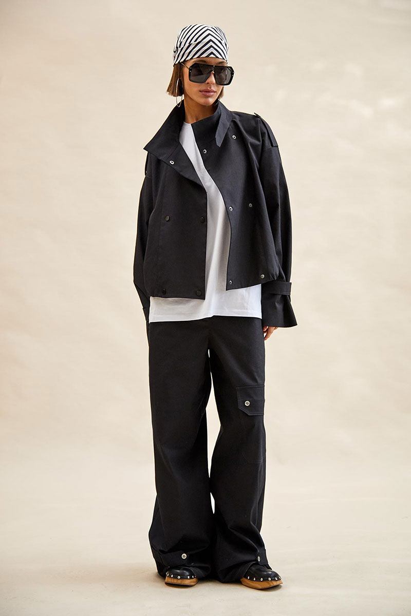 - застежка спереди на молнию и три потайных кнопки на поясе;