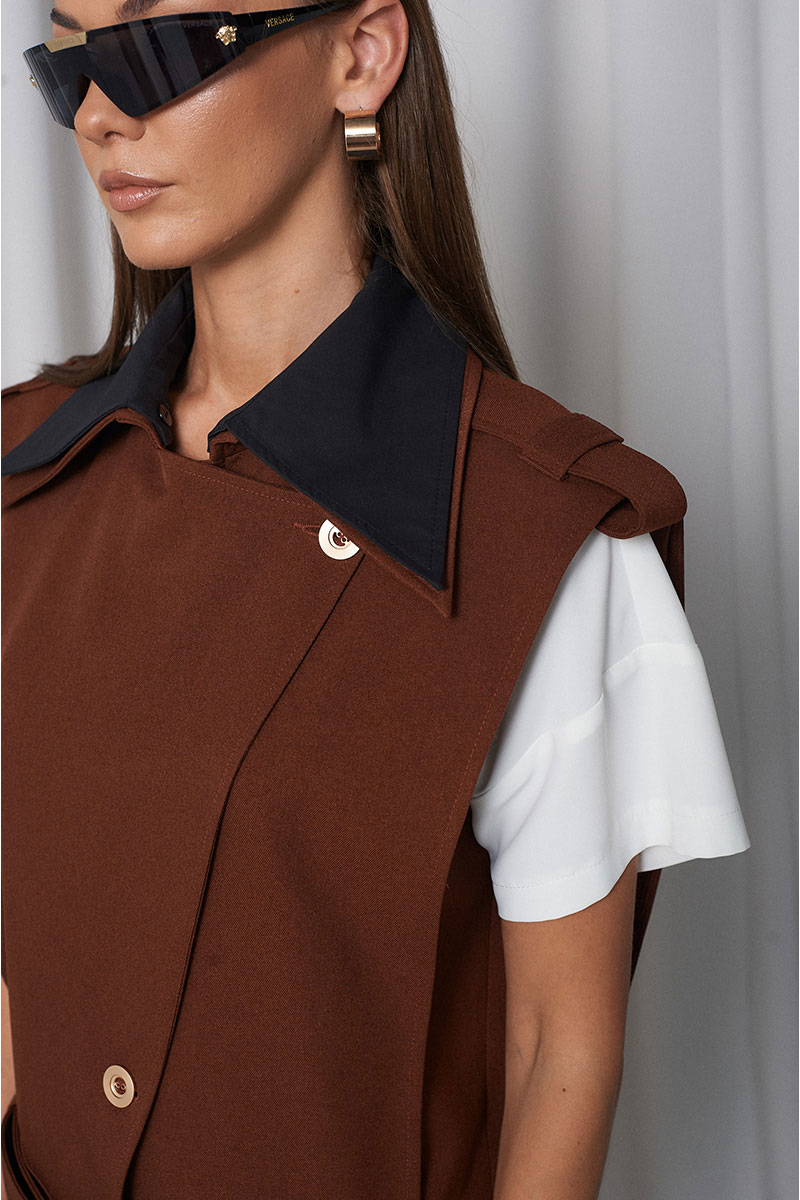 Воротник отложной, двойной! Верхний (чёрный) воротник съёмный на пуговицах. На переде изделия расположена асимметричная застёжка на пуговицы. По плечам расположены декоративные