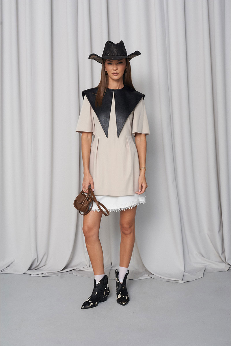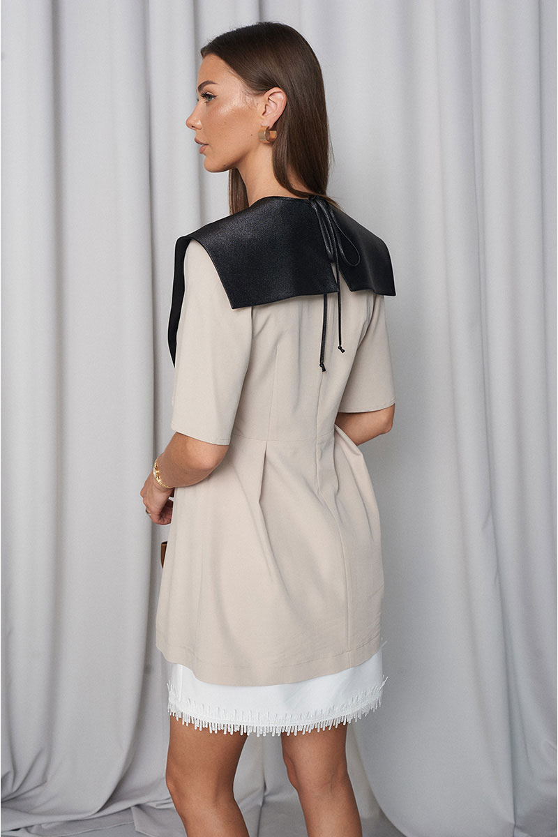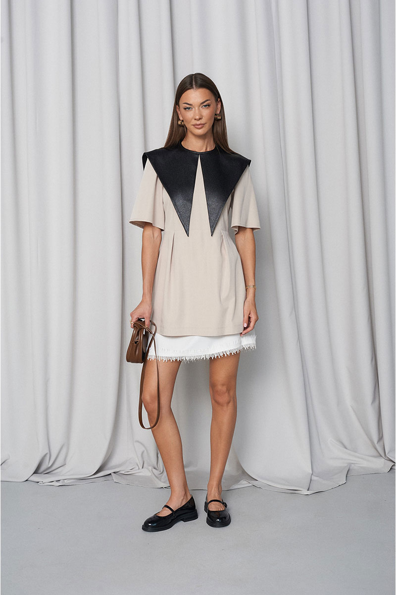 Короткое платье с эффектными съёмными воротниками (в комплекте к платью идёт чёрный и молочный воротник). Платье с завышенной линией талии, приталенное. Рукав втачной, короткий со