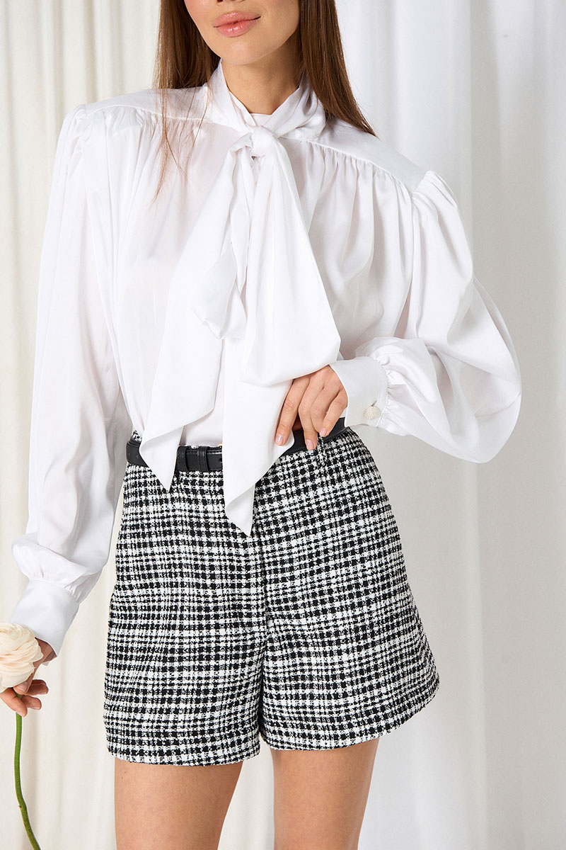 Шорты женские, слегка расширенные к низу. На поясе расположены шлёвки. На задних половинах шорт накладные карманы. Пояс в комплекте не идет.