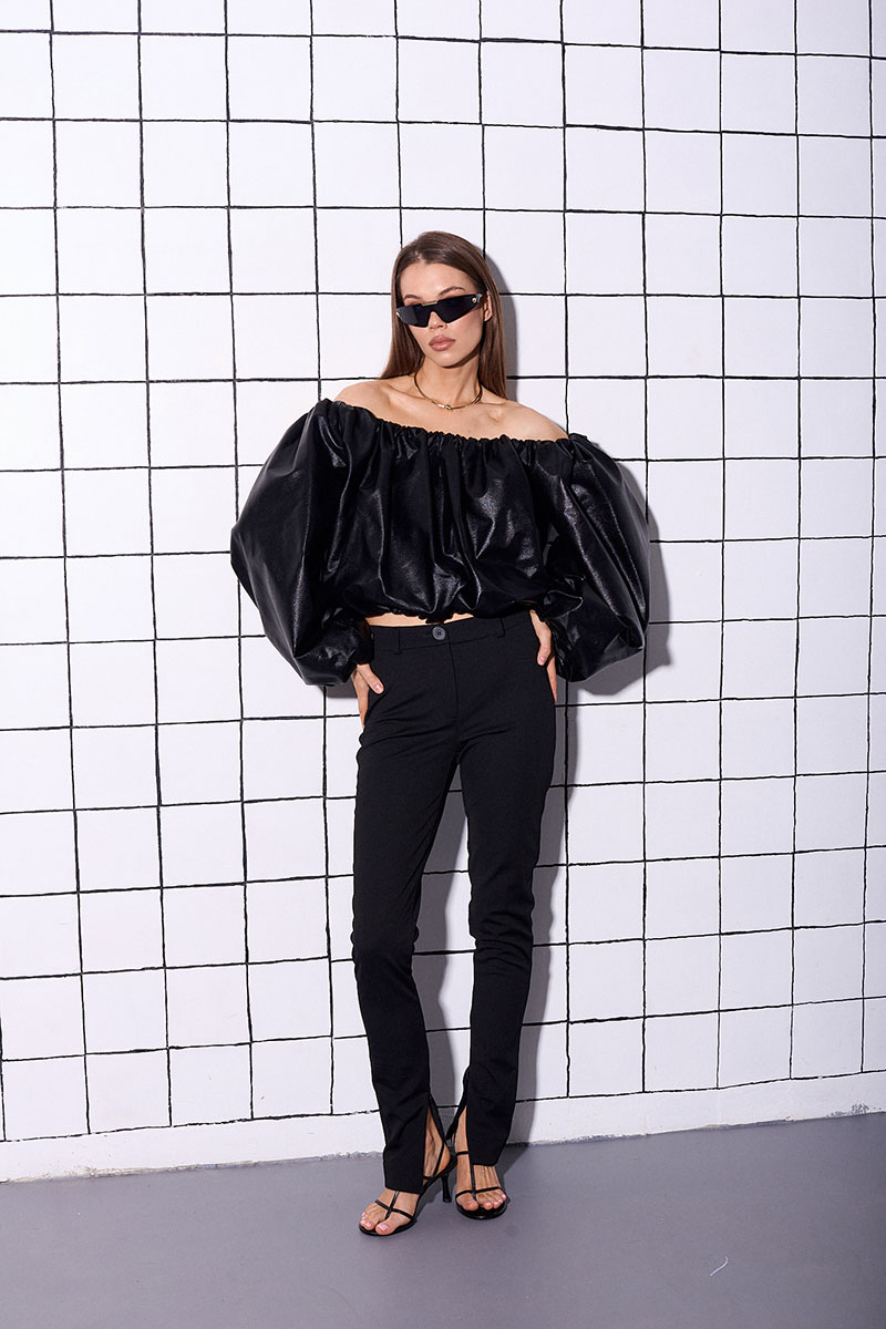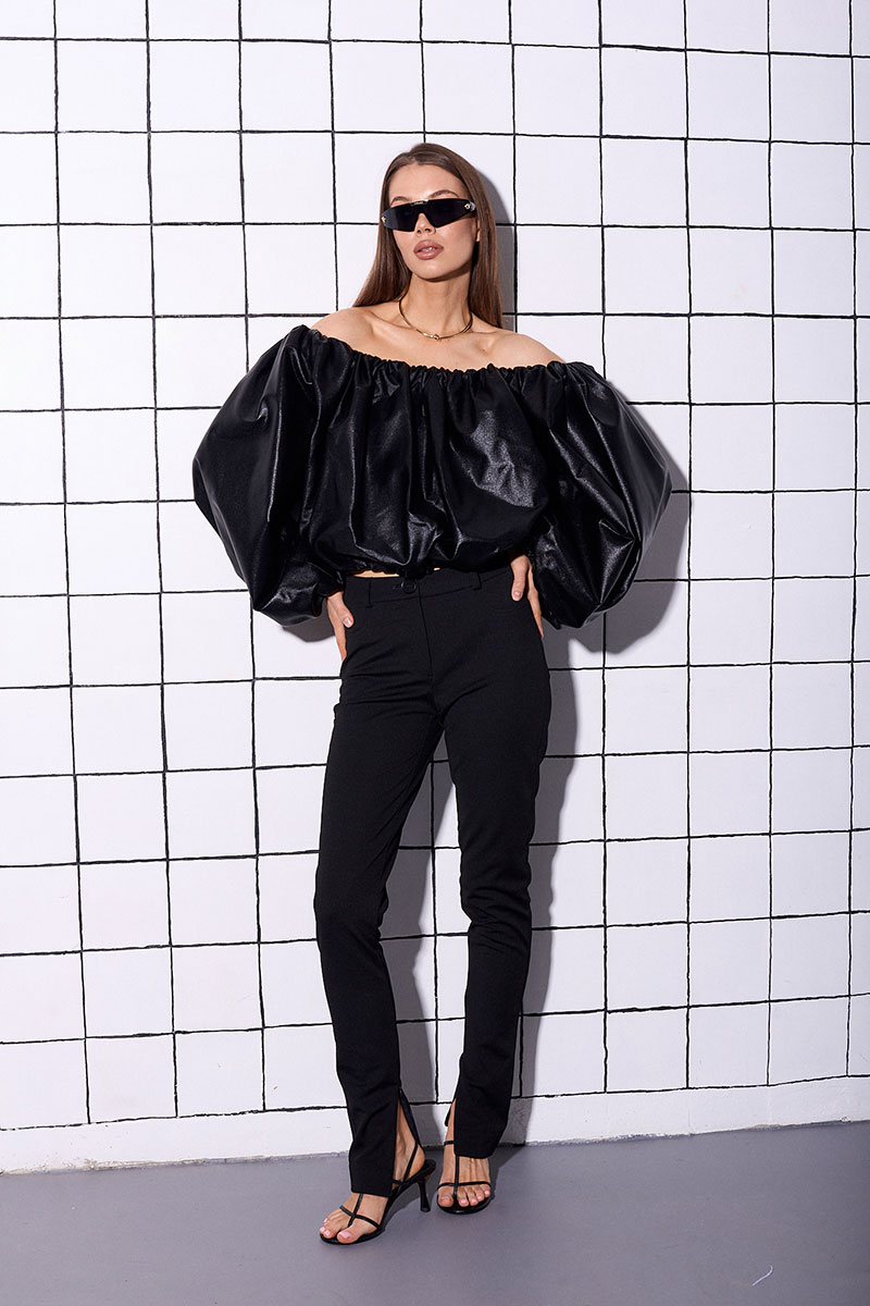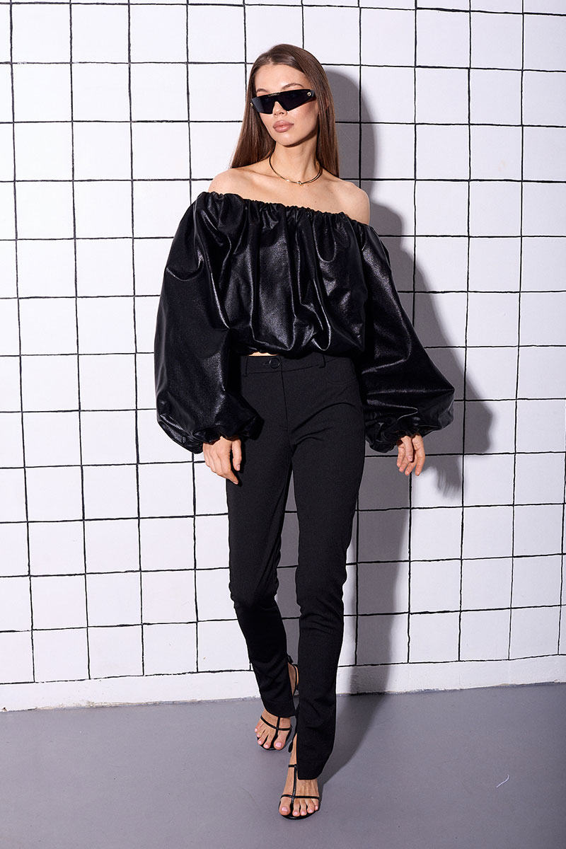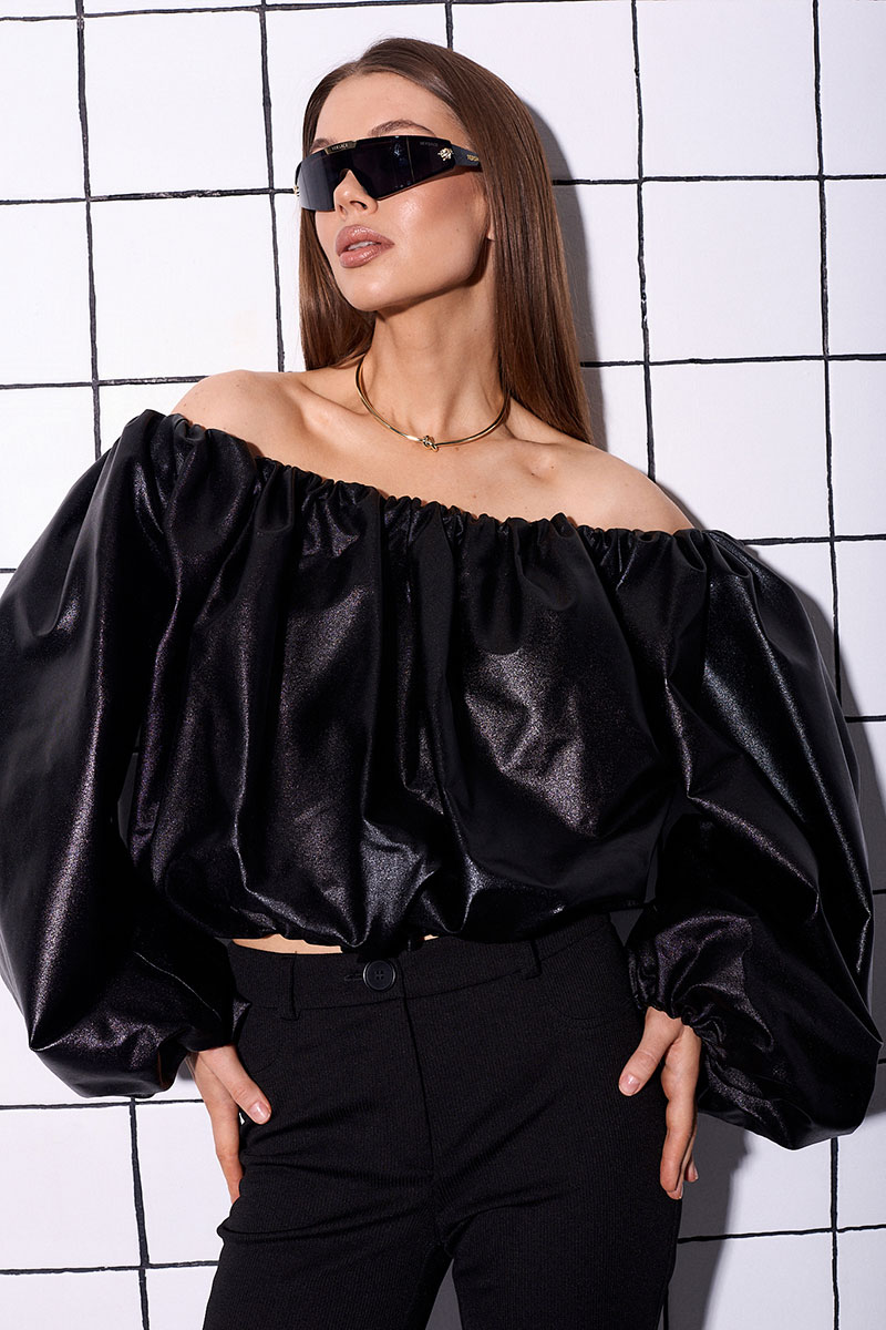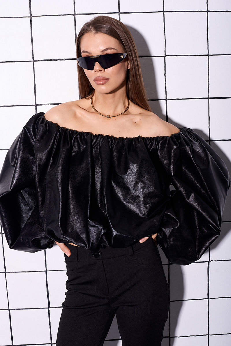 Топ женский, объемный, изготовлен из искусственной кожи. Топ драпирует, фиксирует складки и образует форму с помощью резинки и надежно держится на теле.