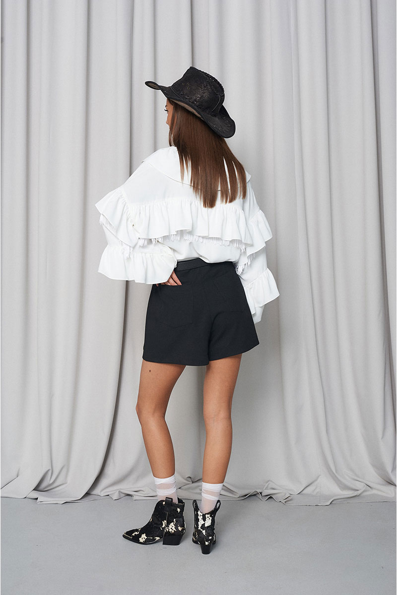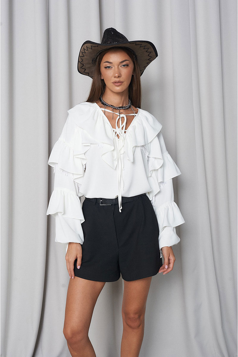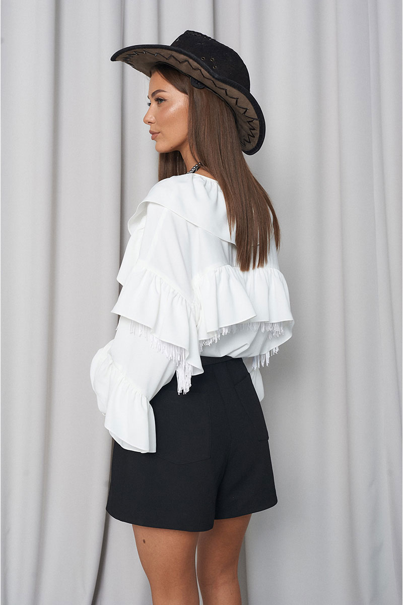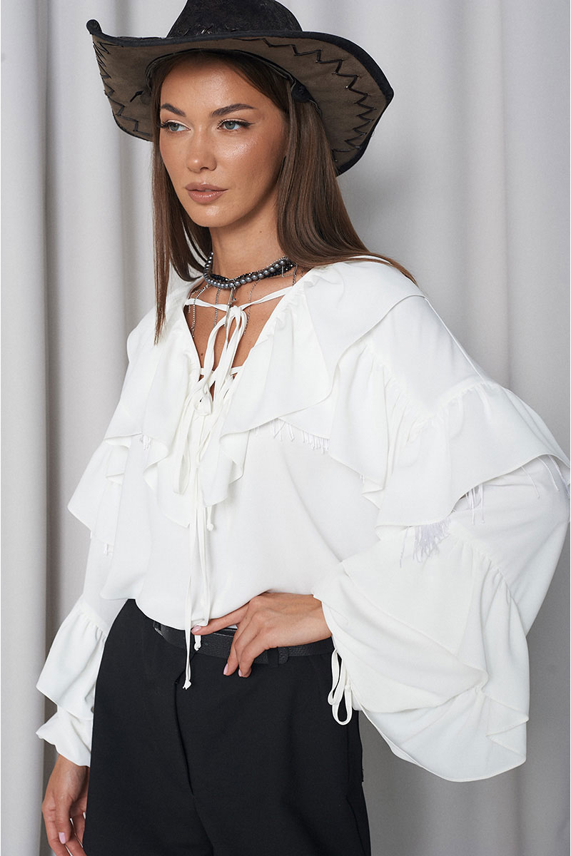 Блузка oversize в стиле бохо с эффектными, свободными, струящимися воланами, по горловине, груди и рукавам. Воланы по рукаву и груди дополнены декоративной бахромой. По