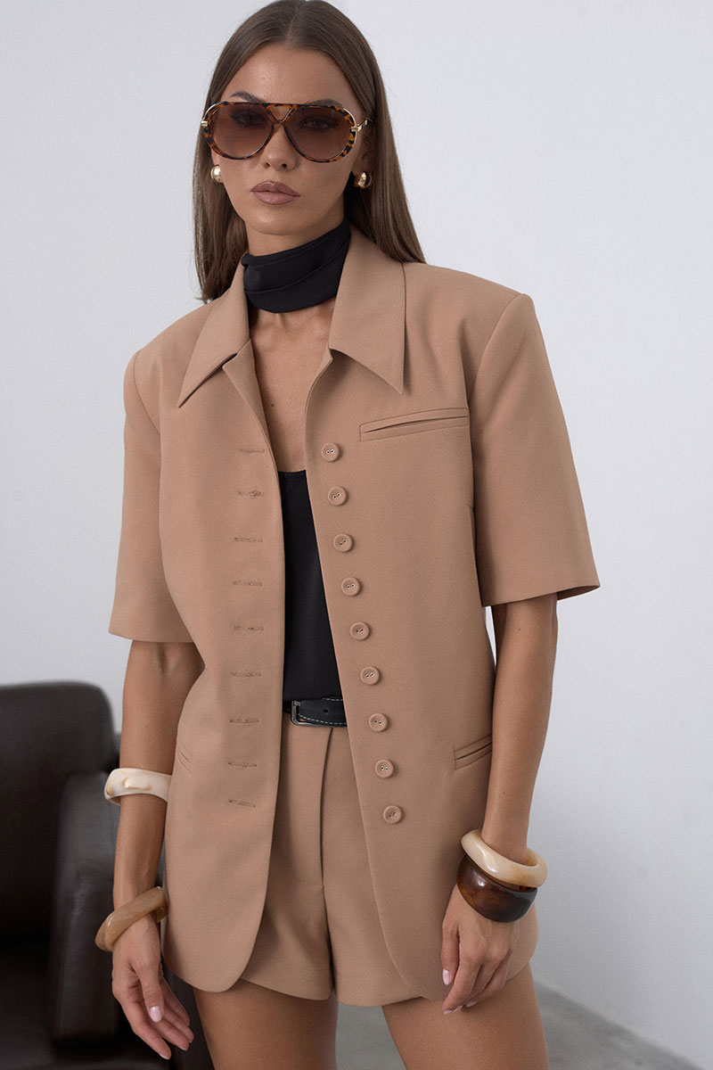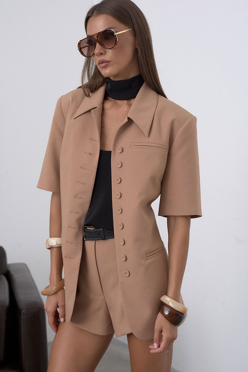 Удлинённый жакет, прямого силуэта (на спинке расположены шлёвки и пояс, который делает идеальный приталенный силуэт именно под параметры вашей талии, регулируете самостоятельно). Жакет на подкладке, имеет увеличенную линию плеча, за счёт подплечника, рукав втачной, короткий. На переде изделия расположены функциональные пуговицы и карманы. Такой жакет отлично корректирует фигуру и служит как предмет делового гардероба, а так же его легко застилизовать в повседневный или даже вечерний вариант.