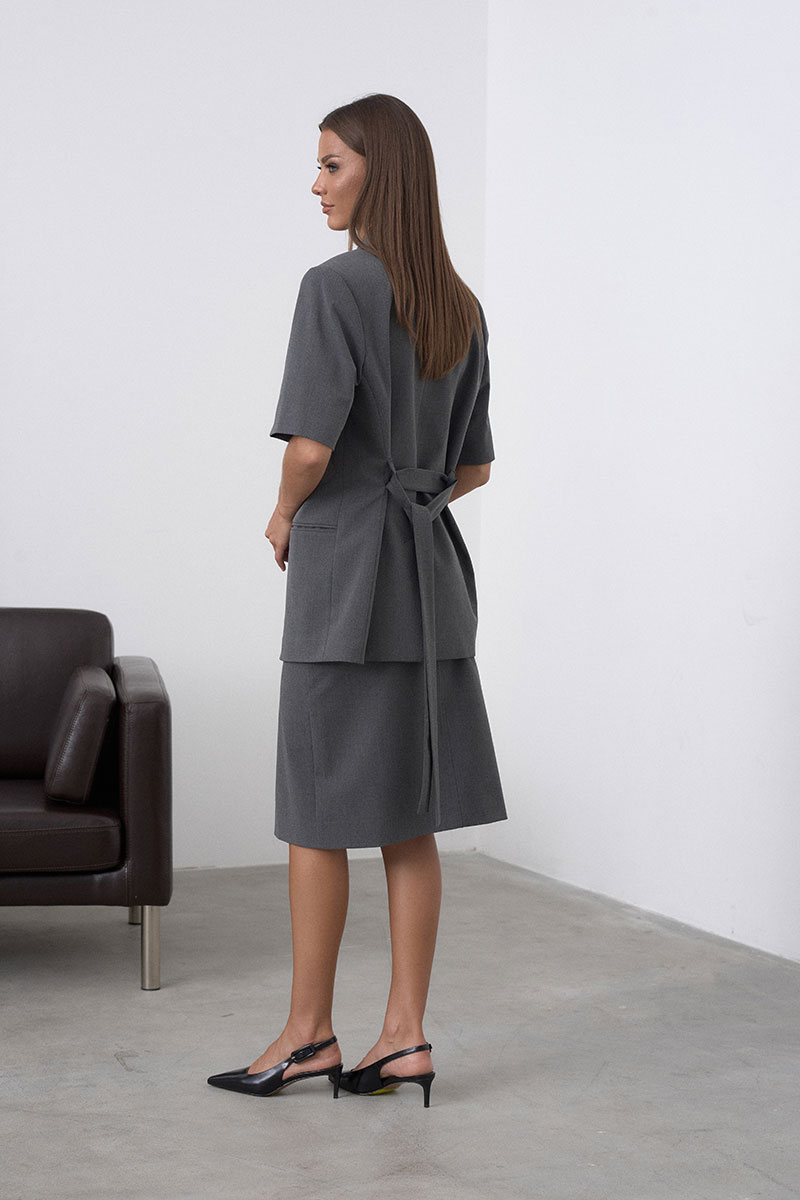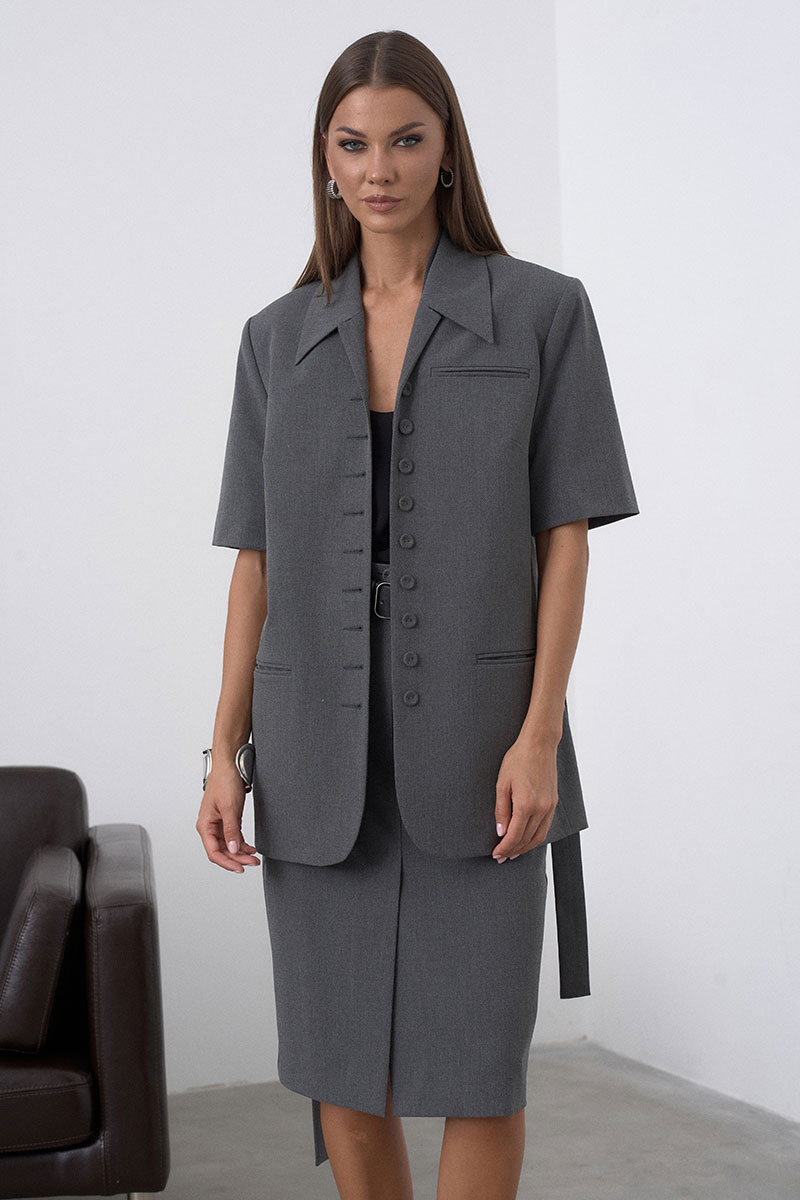 Удлинённый жакет, прямого силуэта (на спинке расположены шлёвки и пояс, который делает идеальный приталенный силуэт именно под параметры вашей талии, регулируете самостоятельно). Жакет на подкладке, имеет увеличенную линию плеча, за счёт подплечника, рукав втачной, короткий. На переде изделия расположены функциональные пуговицы и карманы. Такой жакет отлично корректирует фигуру и служит как предмет делового гардероба, а так же его легко застилизовать в повседневный или даже вечерний вариант.