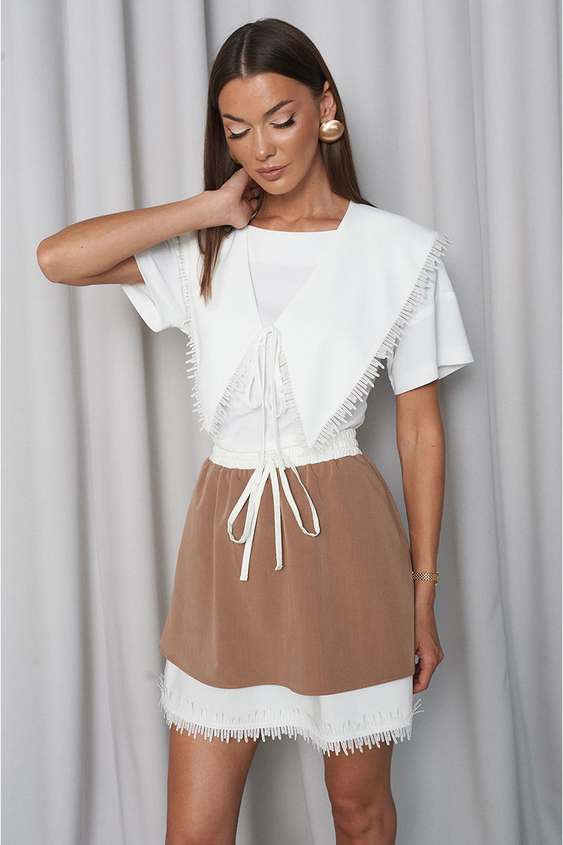 Юбка средней длины, с высокой посадкой, пояс на резинке и с декоративной завязкой. Нижняя юбка(подъюбник) притачен к поясу(не съёмный). В юбке по переду расположены карманы в боковом