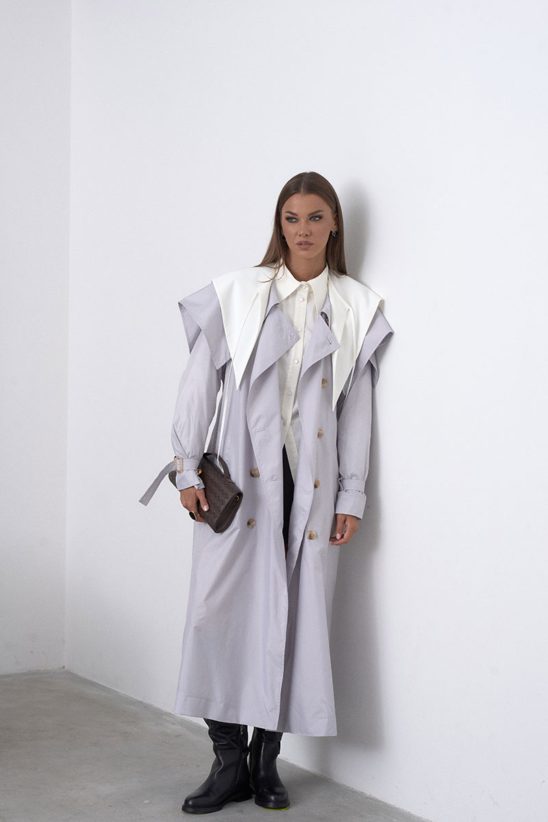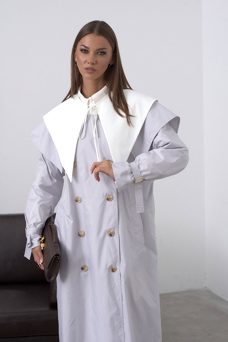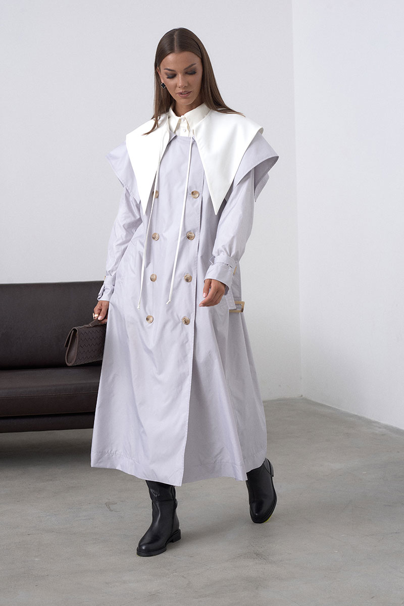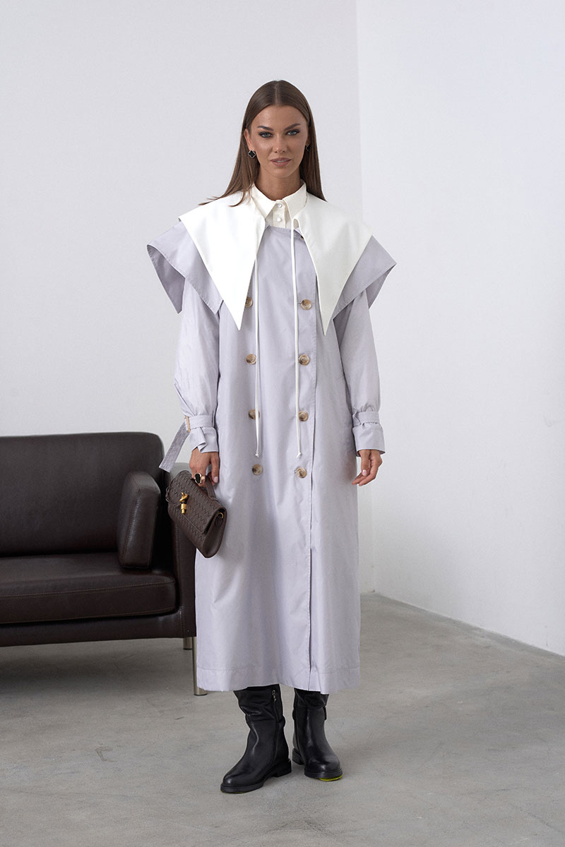 отлично подходит абсолютно любой фигуре. Данная модель имеет съёмный верхний( молочный) воротник. Длина миди, А-силуэт и базовый оттенок делают его многофункциональной вещью в вашем