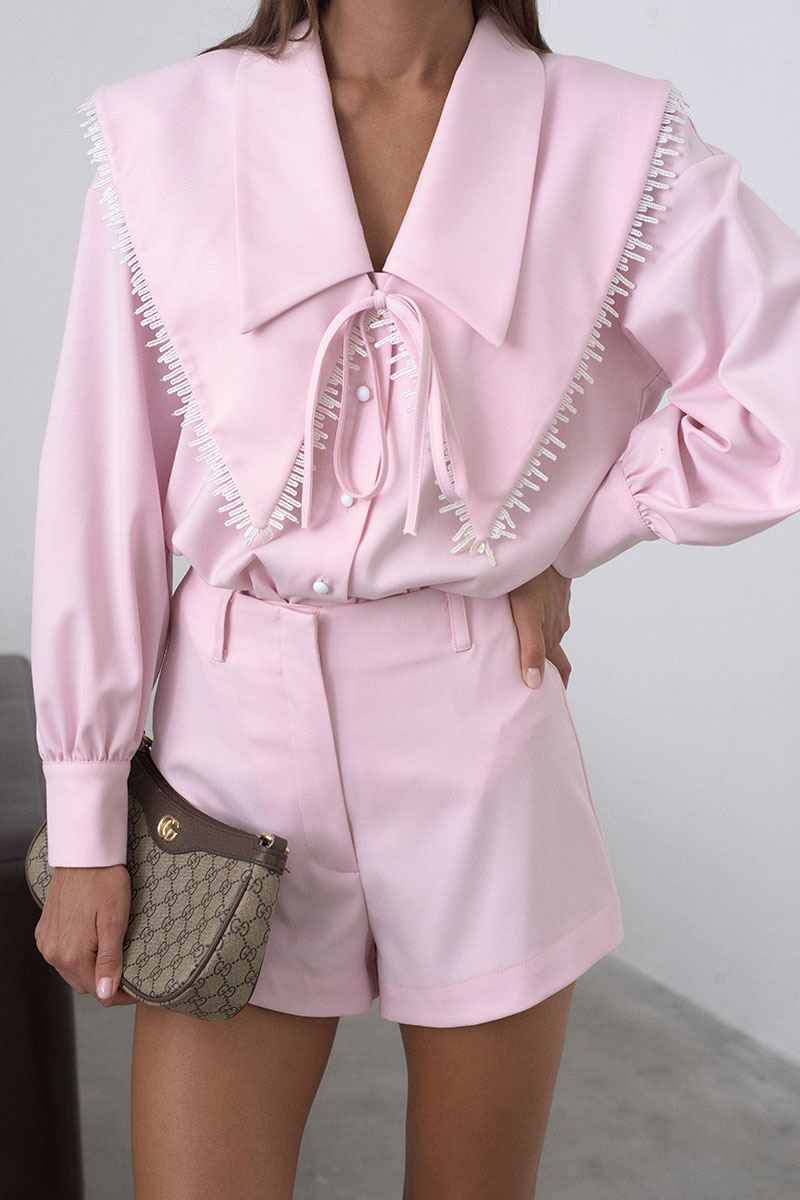 Элегантная блузка прямого, свободного силуэта, с акцентным v-образным вырезом, с застёжкой на пуговицы. Рукав спущенный, у основания рукава сборка, застёгивается манжет на пуговицы. В комплекте к блузке идёт розовый воротник (съёмный).
