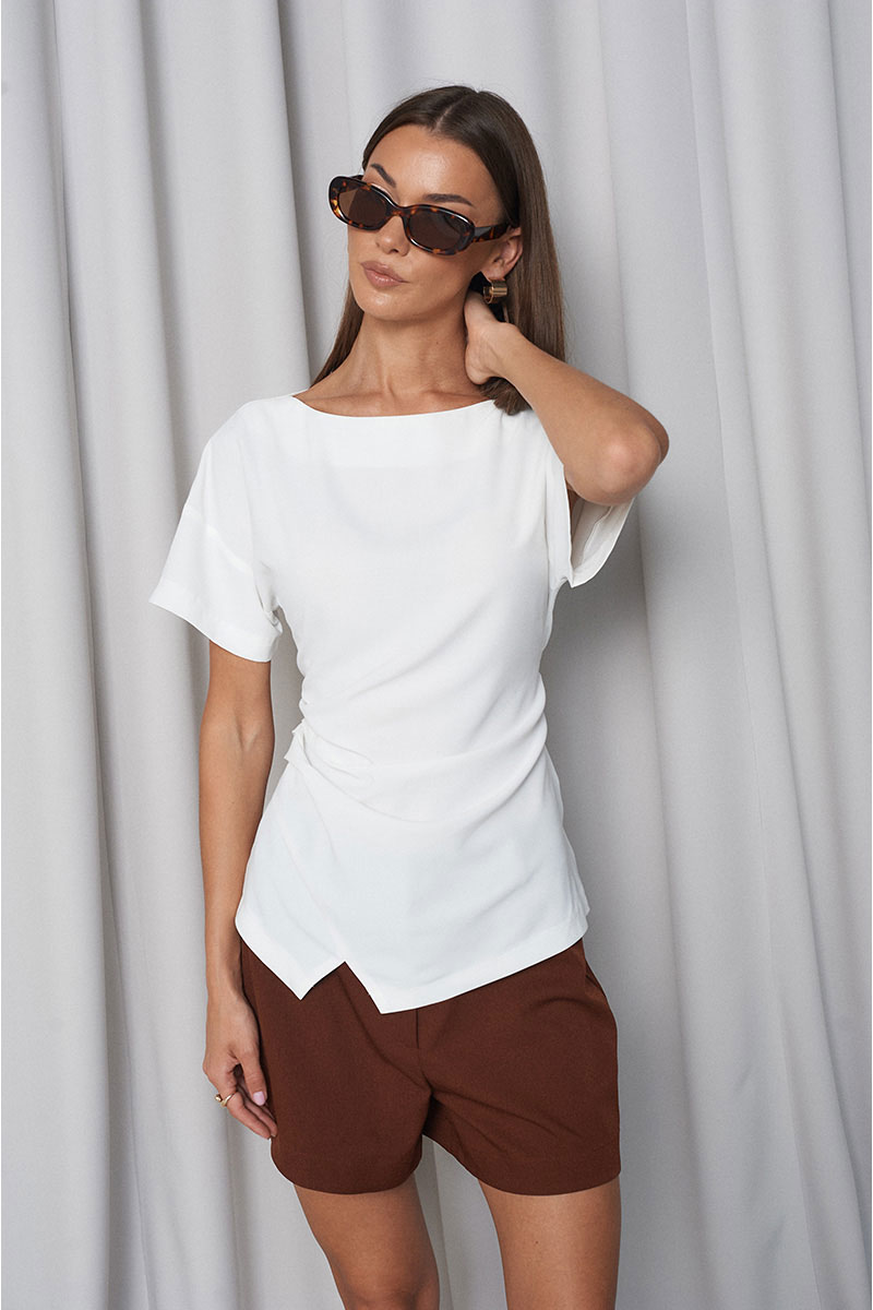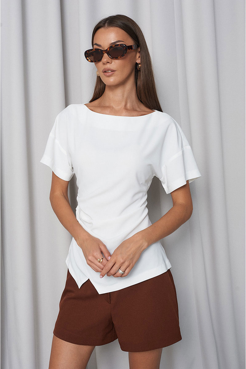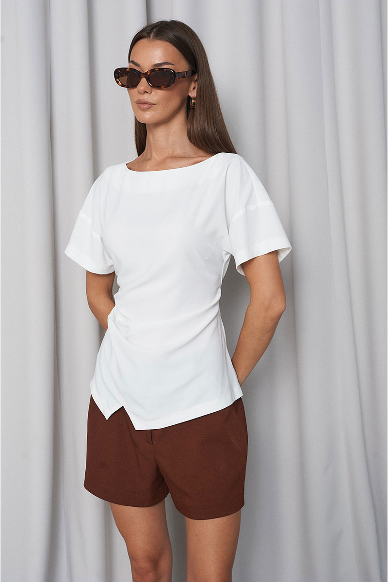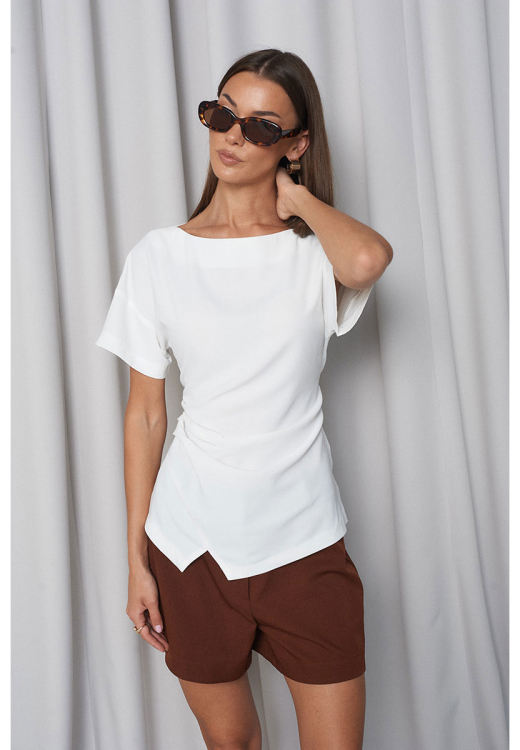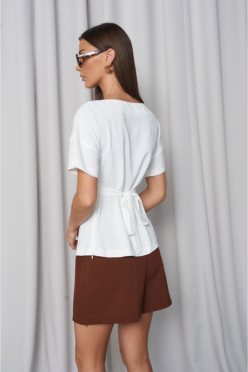 Блузка приталенного силуэта, на переде изделия с одной стороны в складку, по низу небольшой декоративный разрез. Горловина «лодочка», рукав спущенный, короткий. Сбоку расположена потайная молния. На спинке изделия расположены завязки, с помощью которых вы легко отрегулируете талию так, как комфортно именно вам.