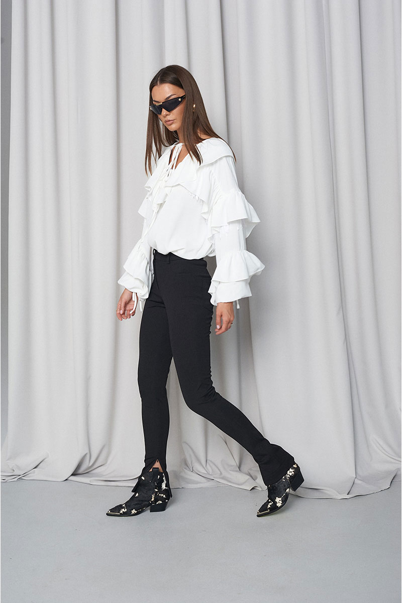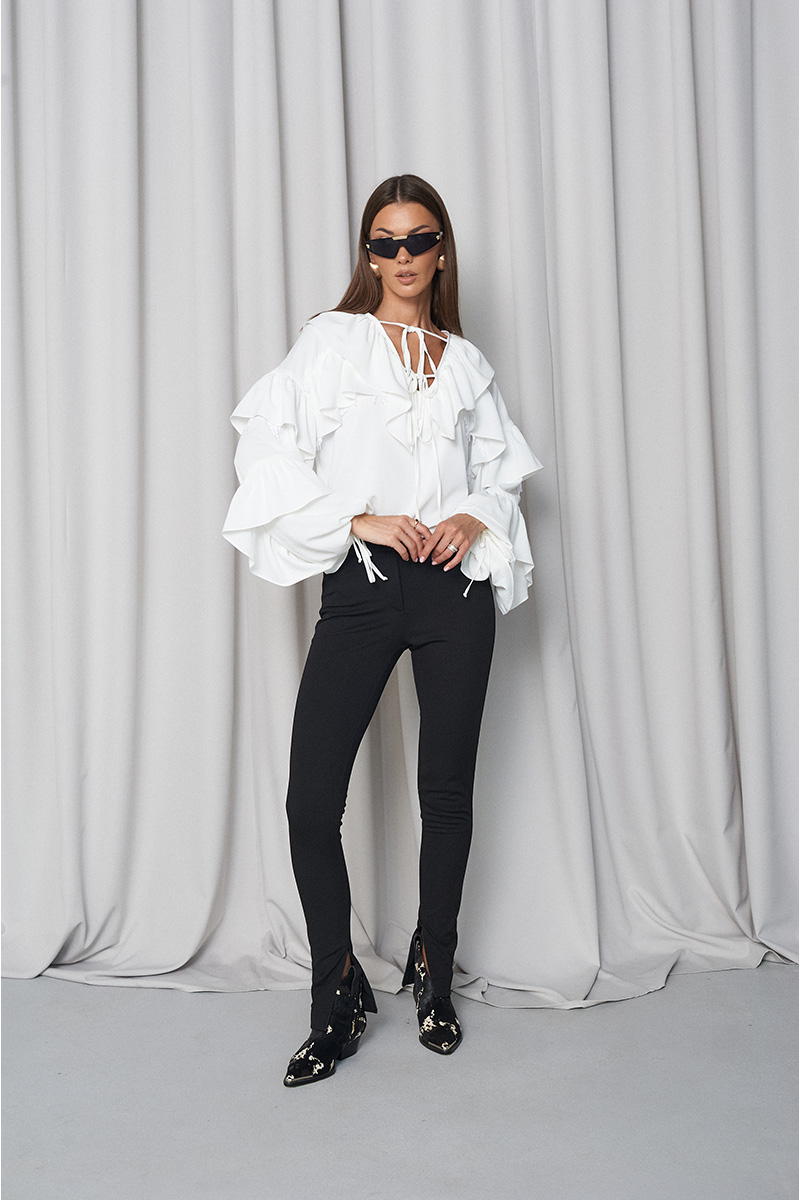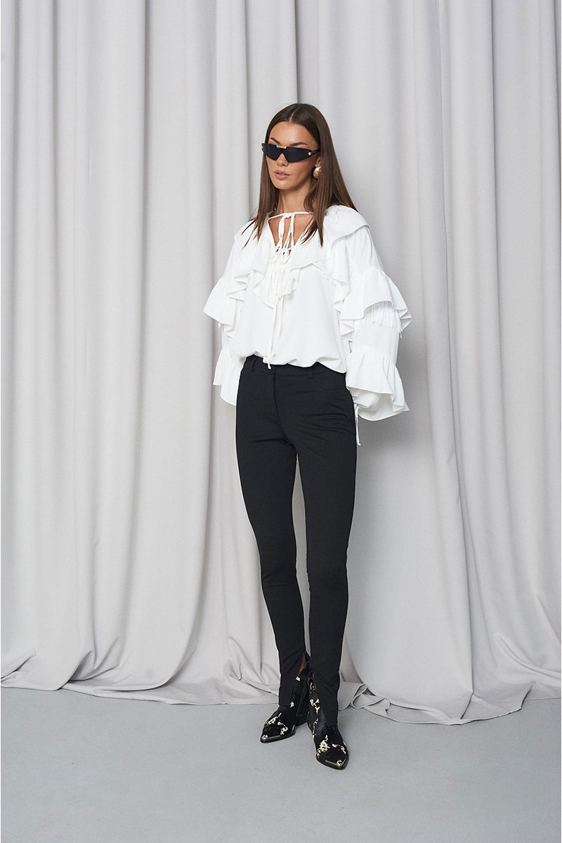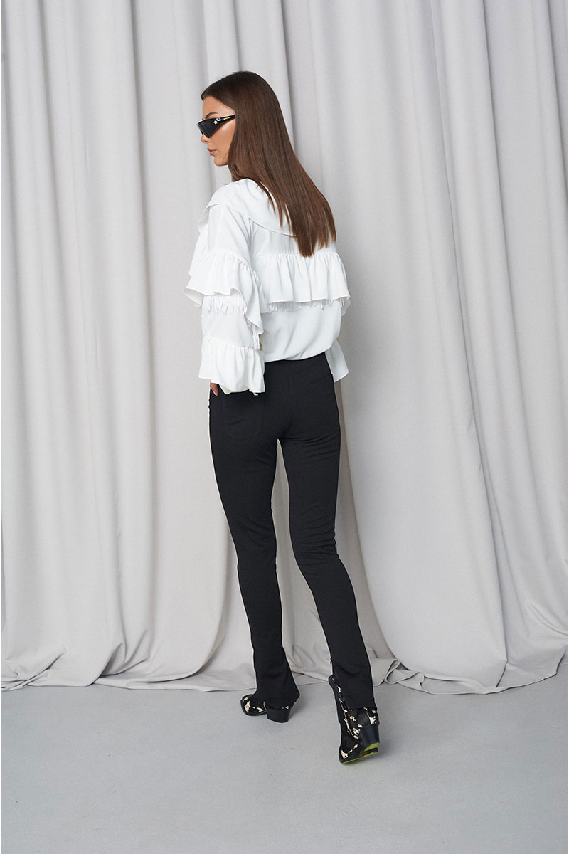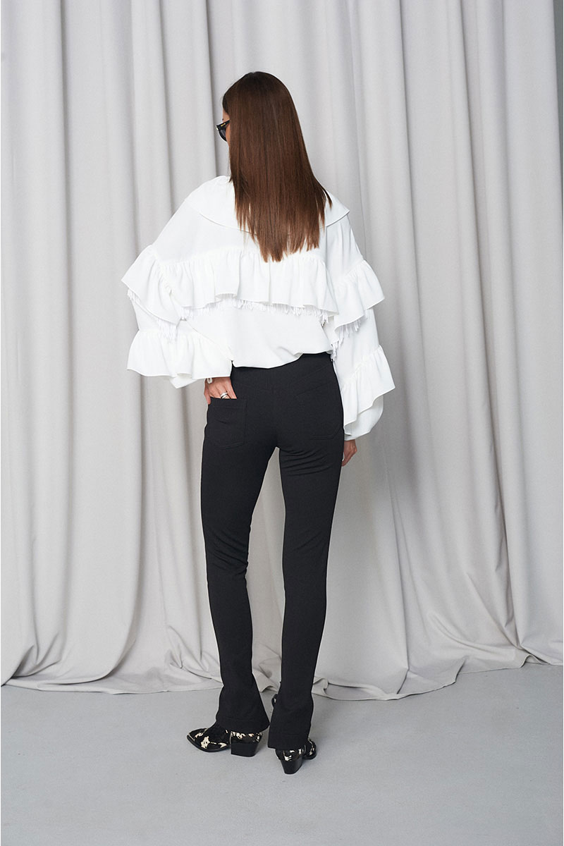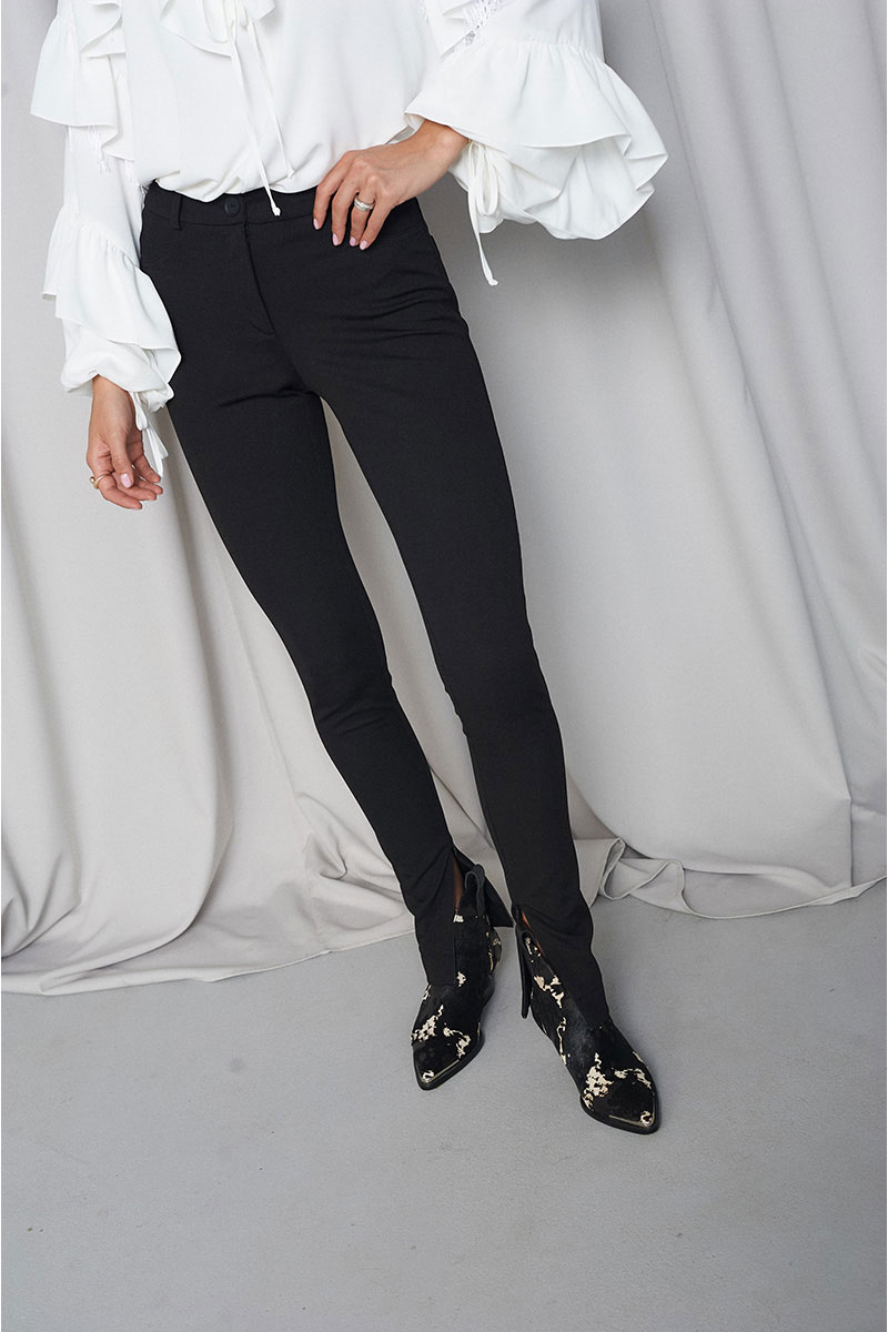 По низу брюк есть потайные молнии, с помощью которых вы можете сделать стильное расклешение. На переде изделия расположены боковые функциональные карманы.