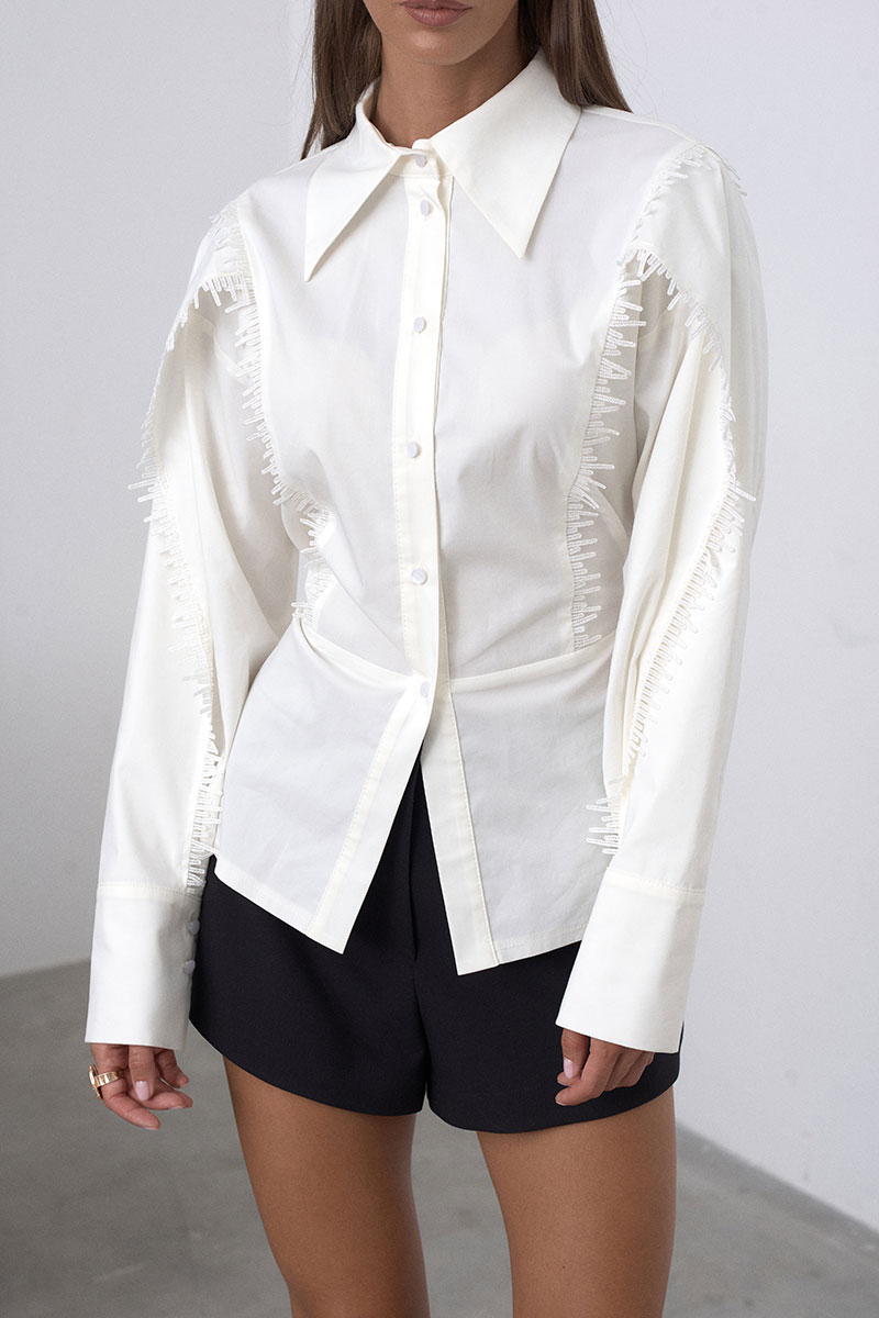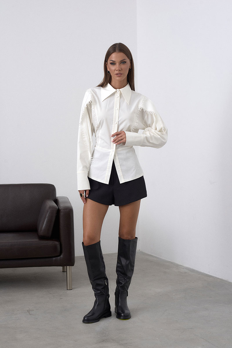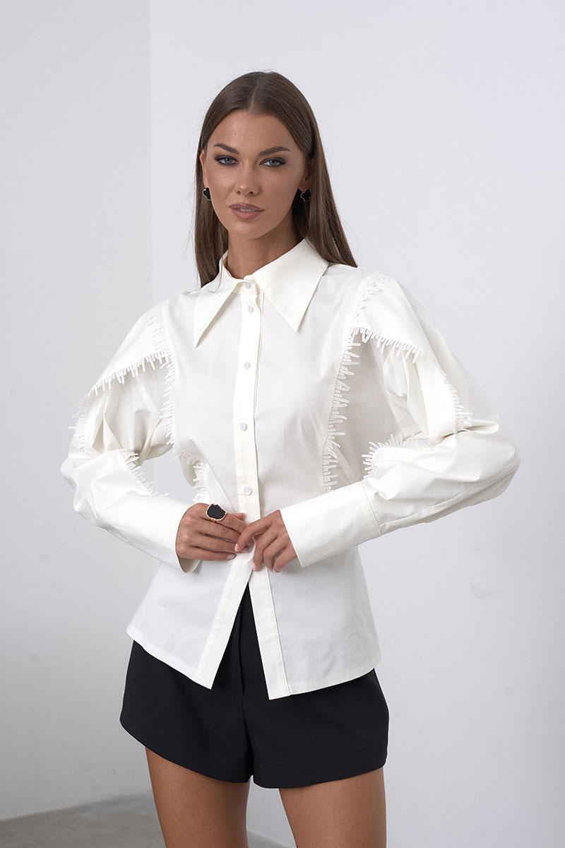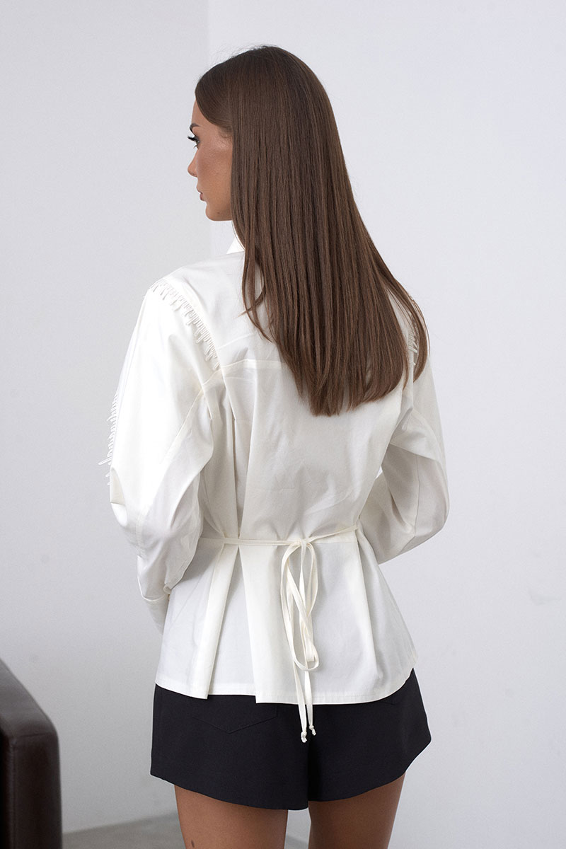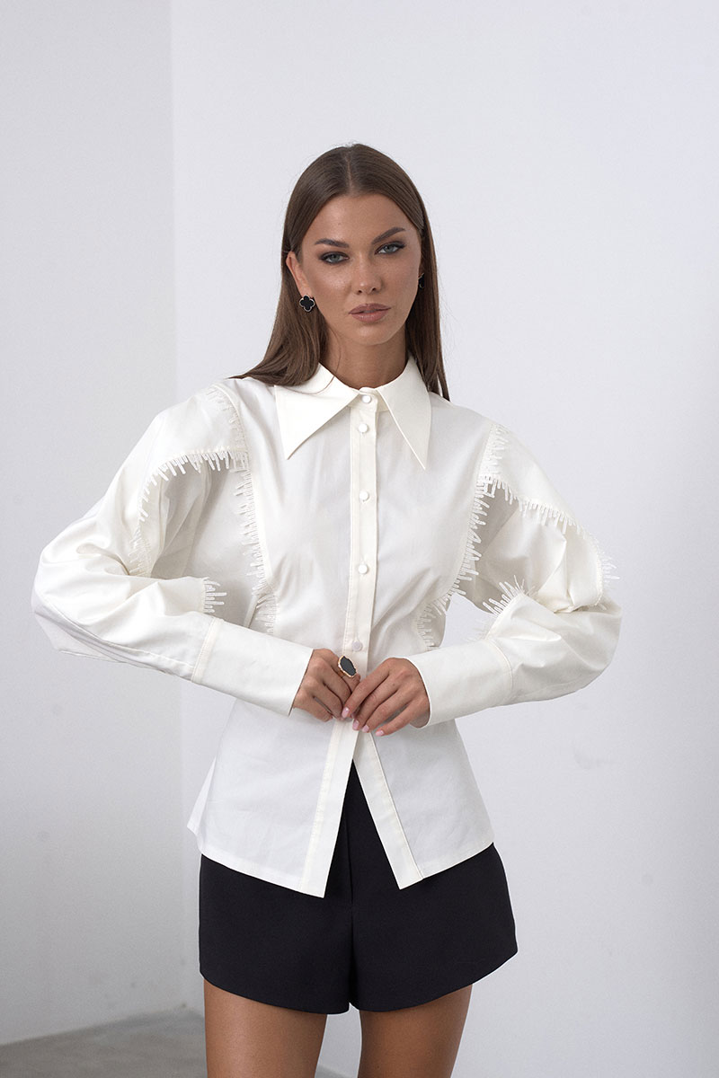 Классический вариант блузы с необычным кроем, дополнена стильным кружевом, что делает данную модель более нарядным вариантом. Блуза приталенного силуэта, по бокам расположены завязки, с помощью которых вы самостоятельно регулируете приталенность силуэта, учитывая особенности вашей фигуры. На переде изделия расположен рубашечный воротник (стояче-отложной) и планка с пуговицами. Данная модель блузы создаст элегантный и женственный образ на любой случай.