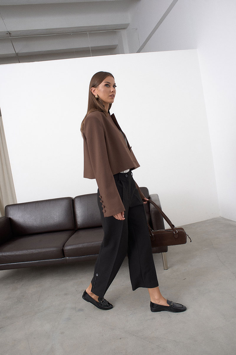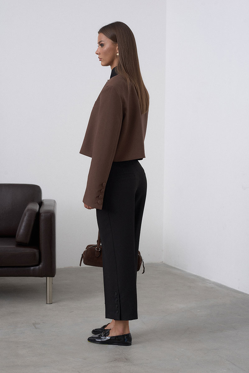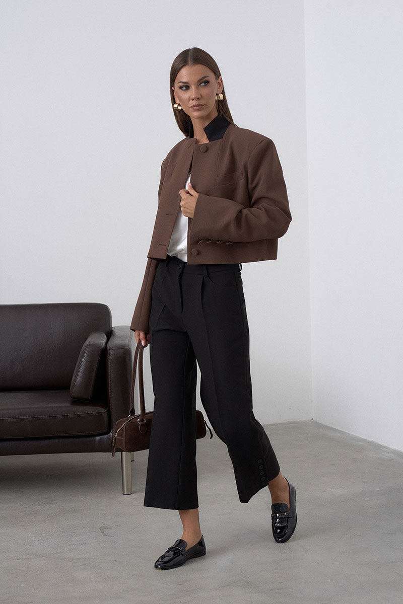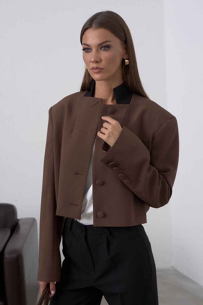 Модный укороченный жакет, или кроп-жакет – укороченная версия пиджака, который заканчивается чуть ниже талии, подчёркивая фигуру и создавая динамичный образ. Жакет на подкладке имеет застёжку на 3 пуговицы и стойку-воротник. На переде изделия расположен прорезной карман с листочкой. Плечевой пояс расширен, что делает жакет свободным и объёмным( а-ля с мужского плеча).