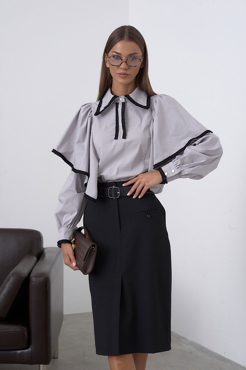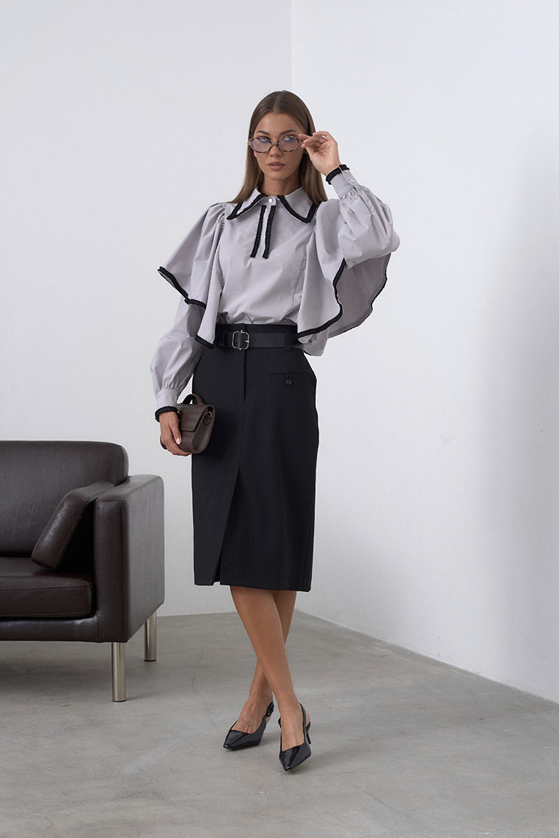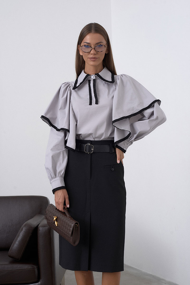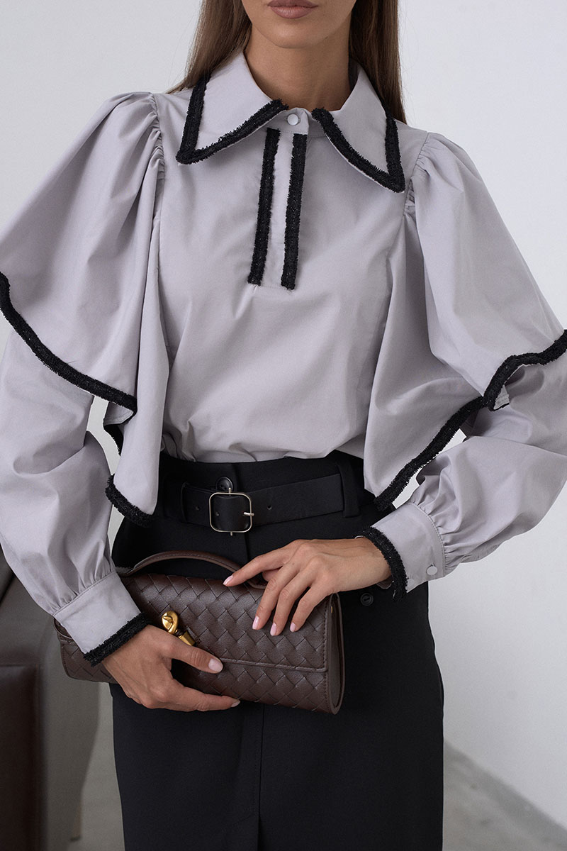 На переде изделия расположены крупные воланы, стояче-отложной воротник и застёжка на пуговицы. Носите блузу навыпуск или заправляйте в юбку\брюки, чтобы создавать новый образ каждый