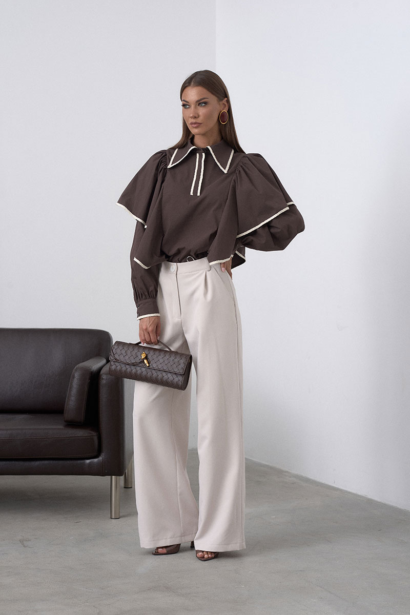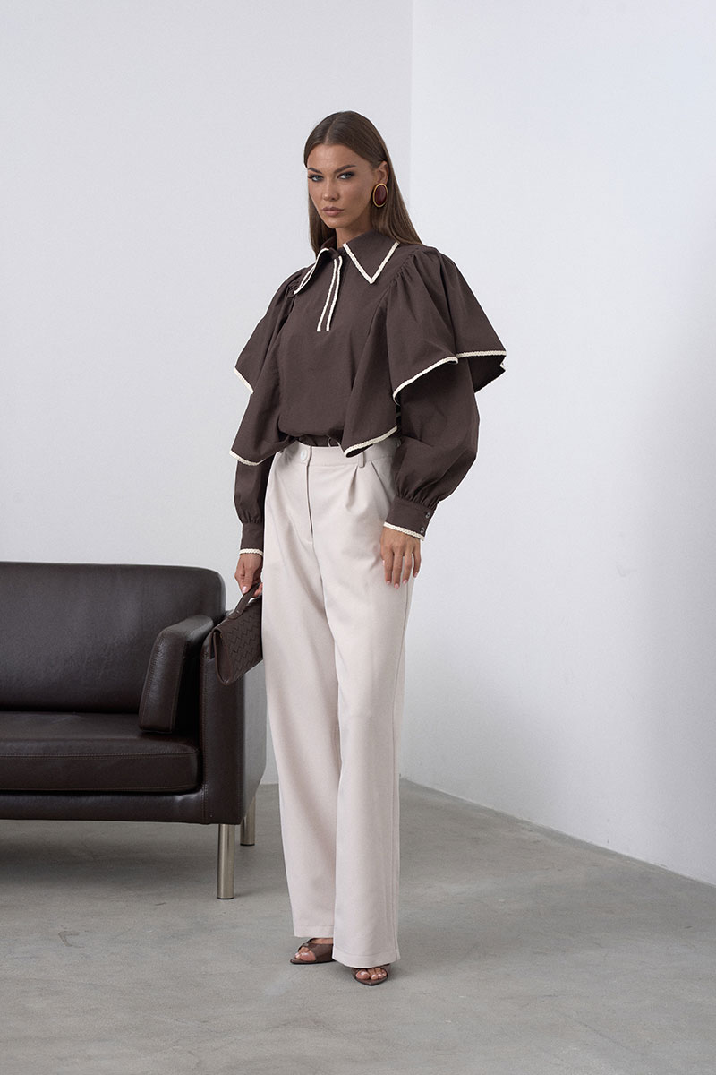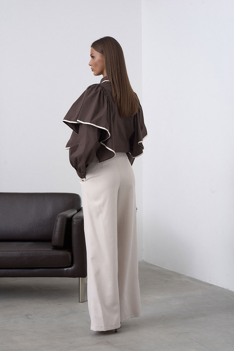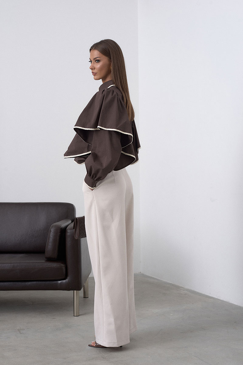 На переде изделия расположены крупные воланы, стояче-отложной воротник и застёжка на пуговицы. Носите блузу навыпуск или заправляйте в юбку\брюки, чтобы создавать новый образ каждый