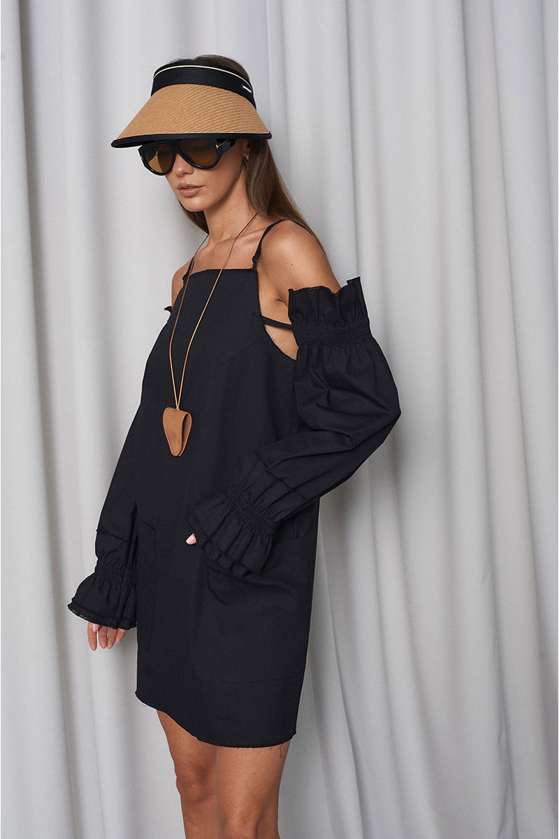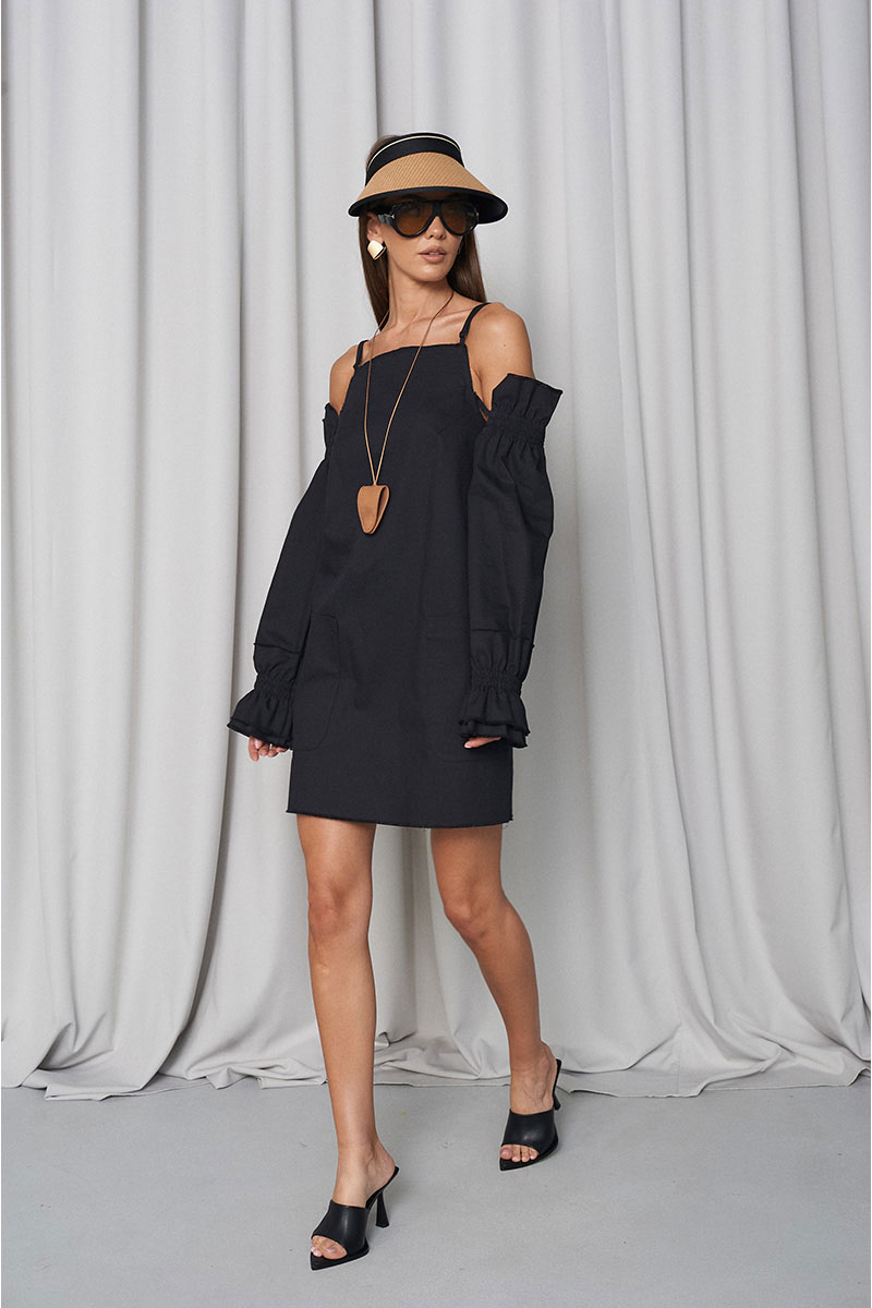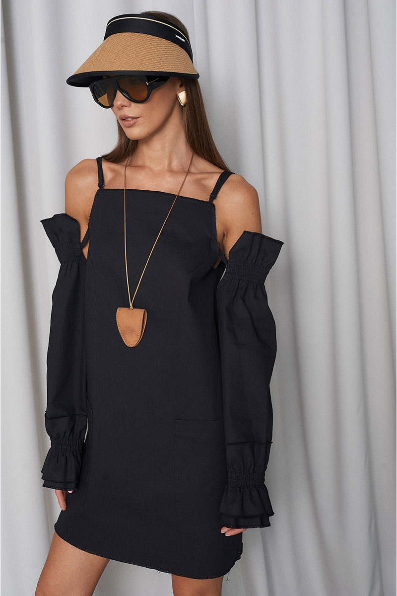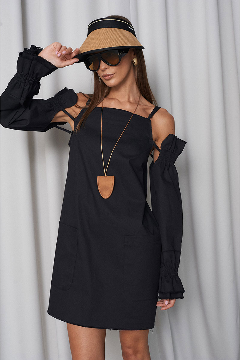 Сарафан прямого свободного силуэта, с большими функциональными накладными карманами по переду и нагрудными вытачками. Сарафан с регулирующими тонкими бретелями и объёмными съёмными (крепятся на пуговицах) рукавами на резинке (по низу и верху рукава). Всё края сарафана необработанные (слегка бахромистые).
