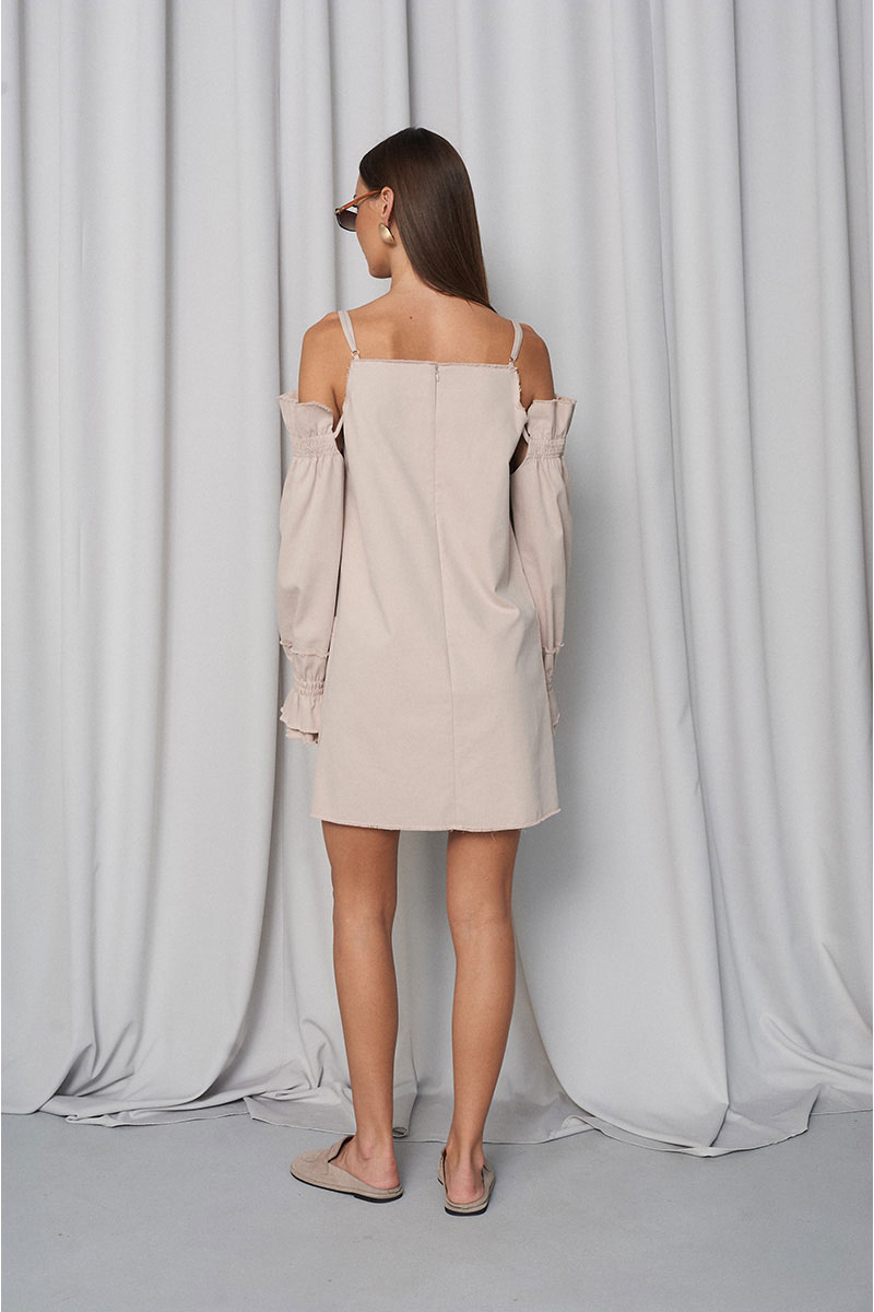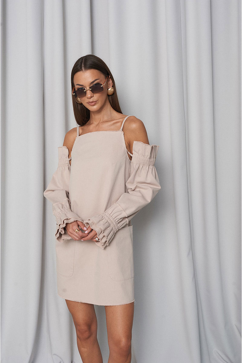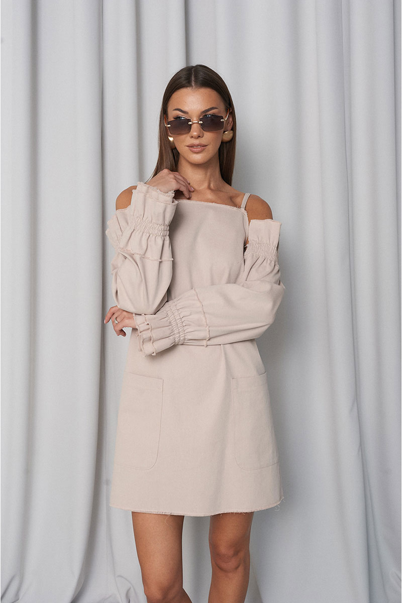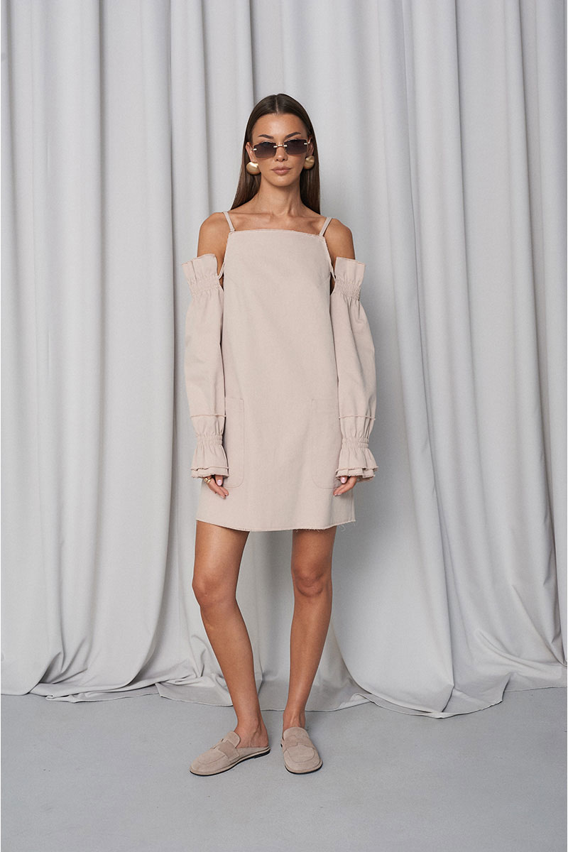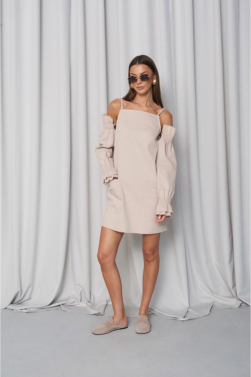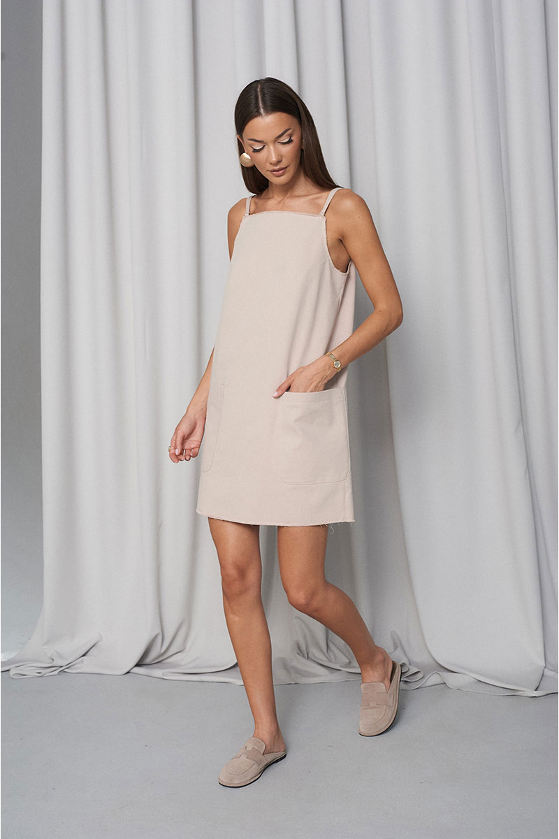 Сарафан прямого свободного силуэта, с большими функциональными накладными карманами по переду и нагрудными вытачками. Сарафан с регулирующими тонкими бретелями и объёмными съёмными (крепятся на пуговицах) рукавами на резинке (по низу и верху рукава). Всё края сарафана необработанные (слегка бахромистые).