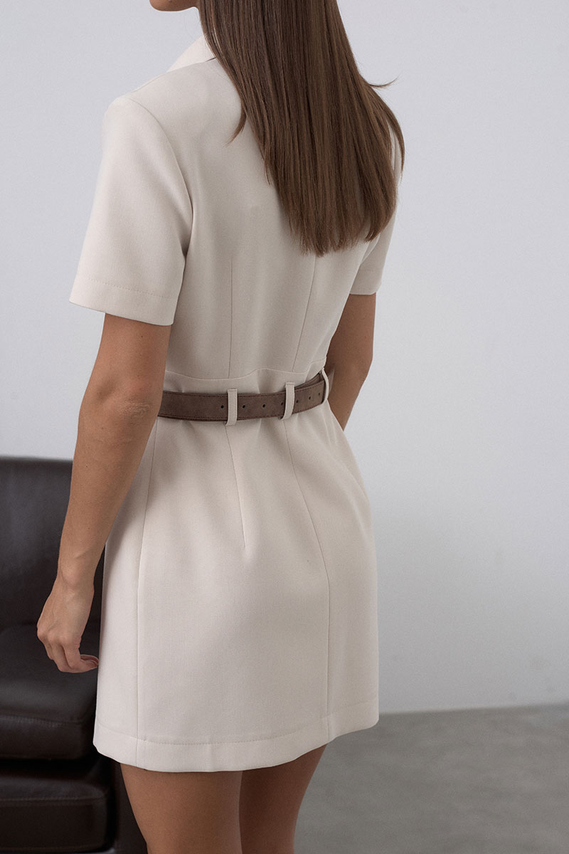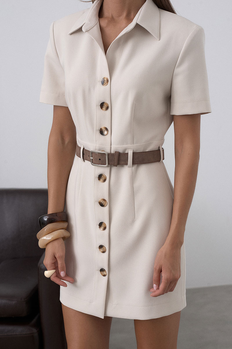 Короткое платье приталенного силуэта с застёжкой на пуговицы по переду. Рукав втачной, короткий с подплечником, что делает линию плеча изящной и аккуратной. Платье дополнено поясом,