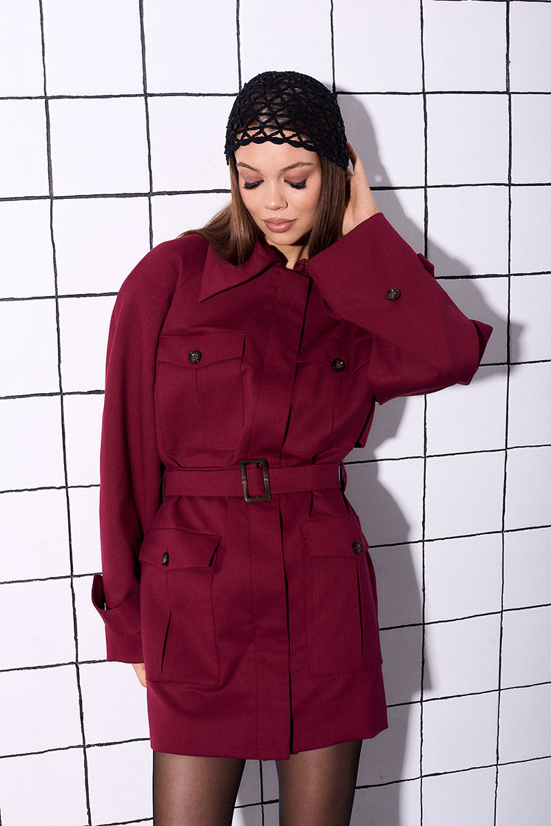 Платье прямого силуэта, на подкладке, выполнено из костюмной ткани. Рукав реглан с плечевой накладкой, по низу рукава паты и пуговицы. Платье на потайной застежке молнии и пуговицы. По переду изделия расположены карманы с клапаном. На спинке отлетная кокетка. В комплекте к платью идет пояс.