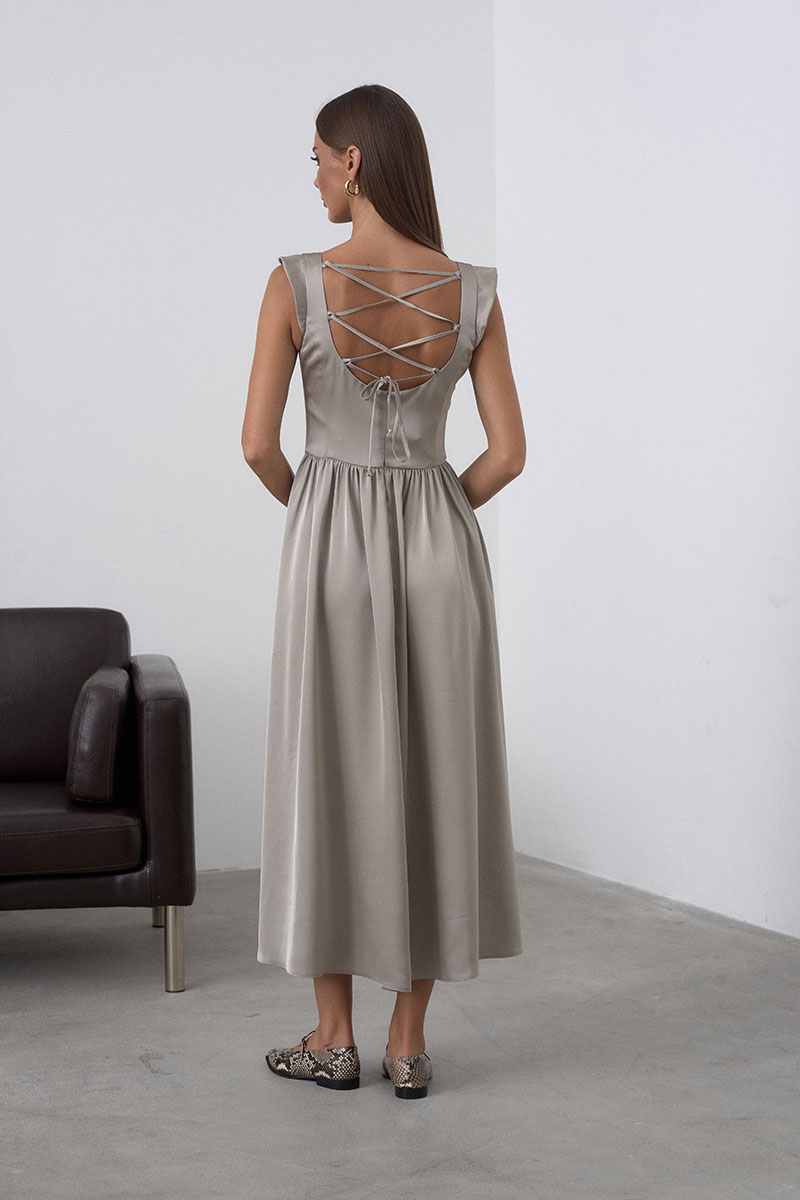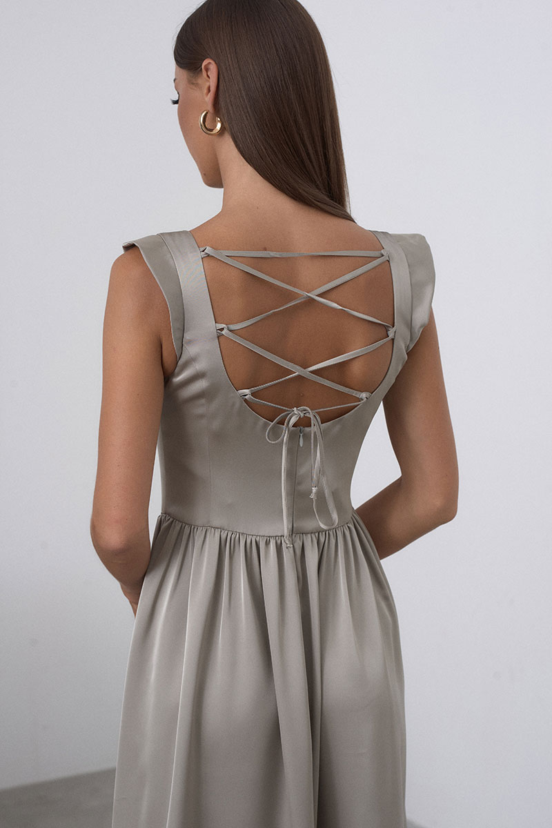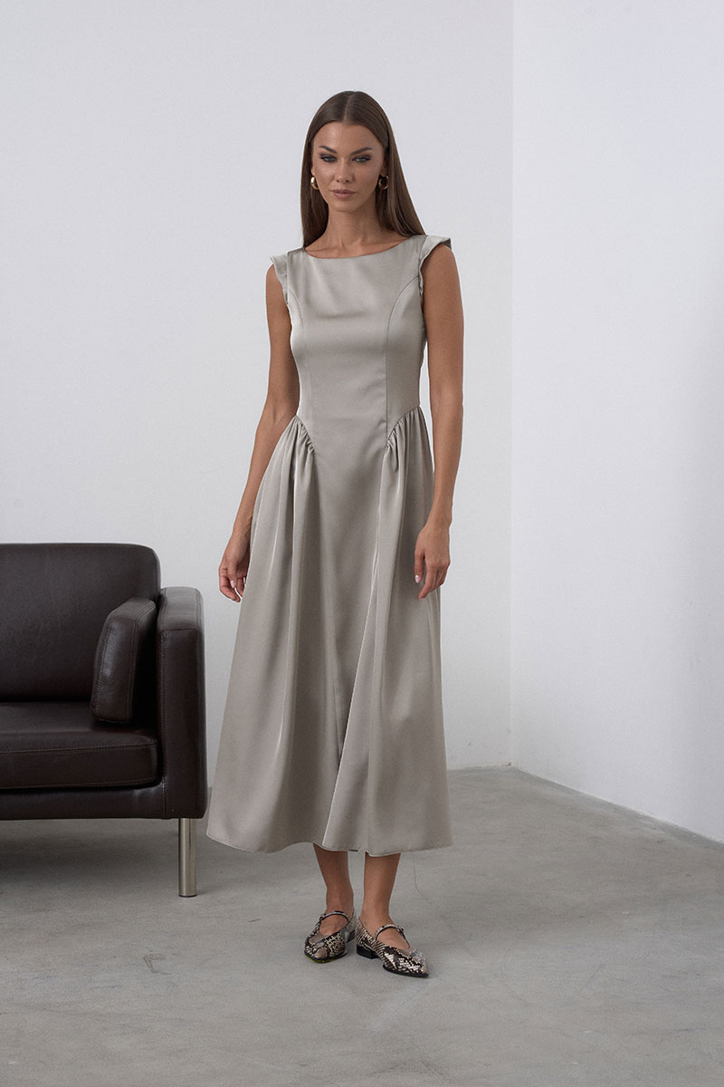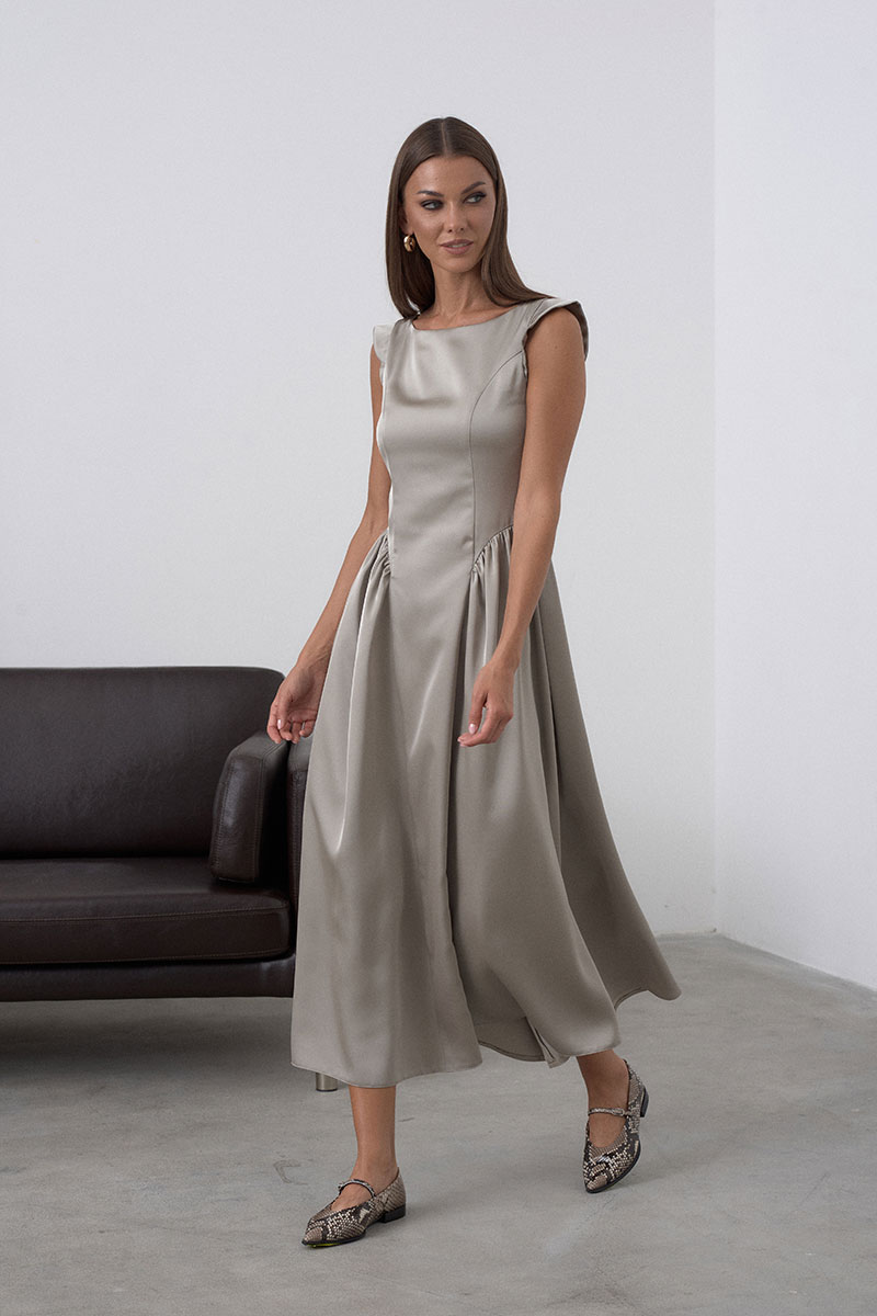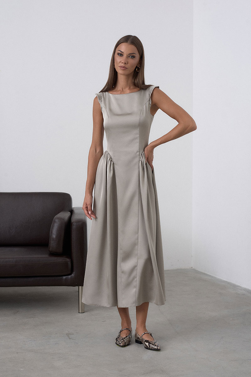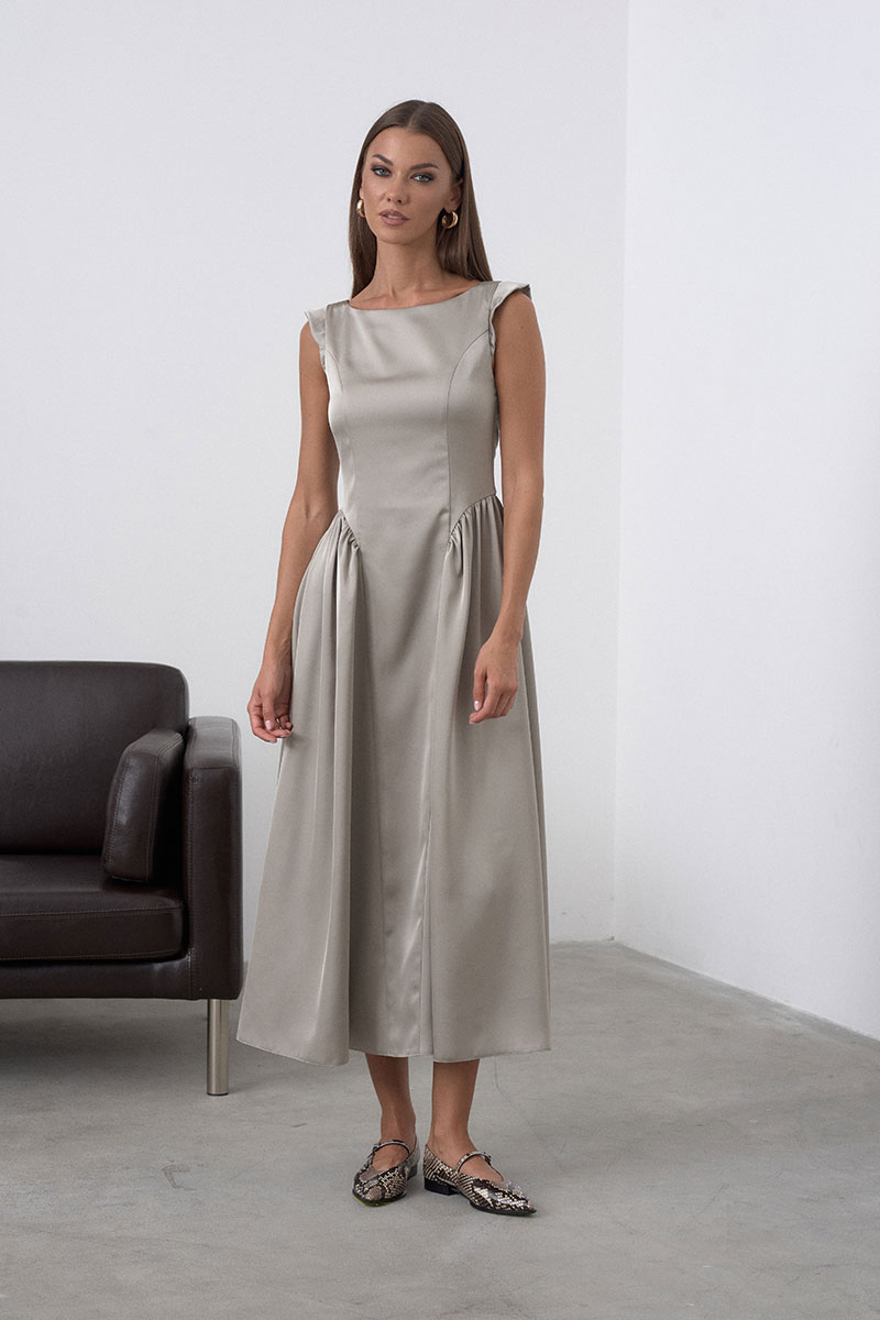 Элегантное, длинное платье из струящейся ткани с ненавязчивым блеском. В платье очень женственный вырез «лодочка» и небольшие рукава «крылышки». Платье приталенное, прекрасно подчёркивает фигуру. Юбка в платье по бокам собрана в сборку, что делает силуэт романтичным и кокетливым.
