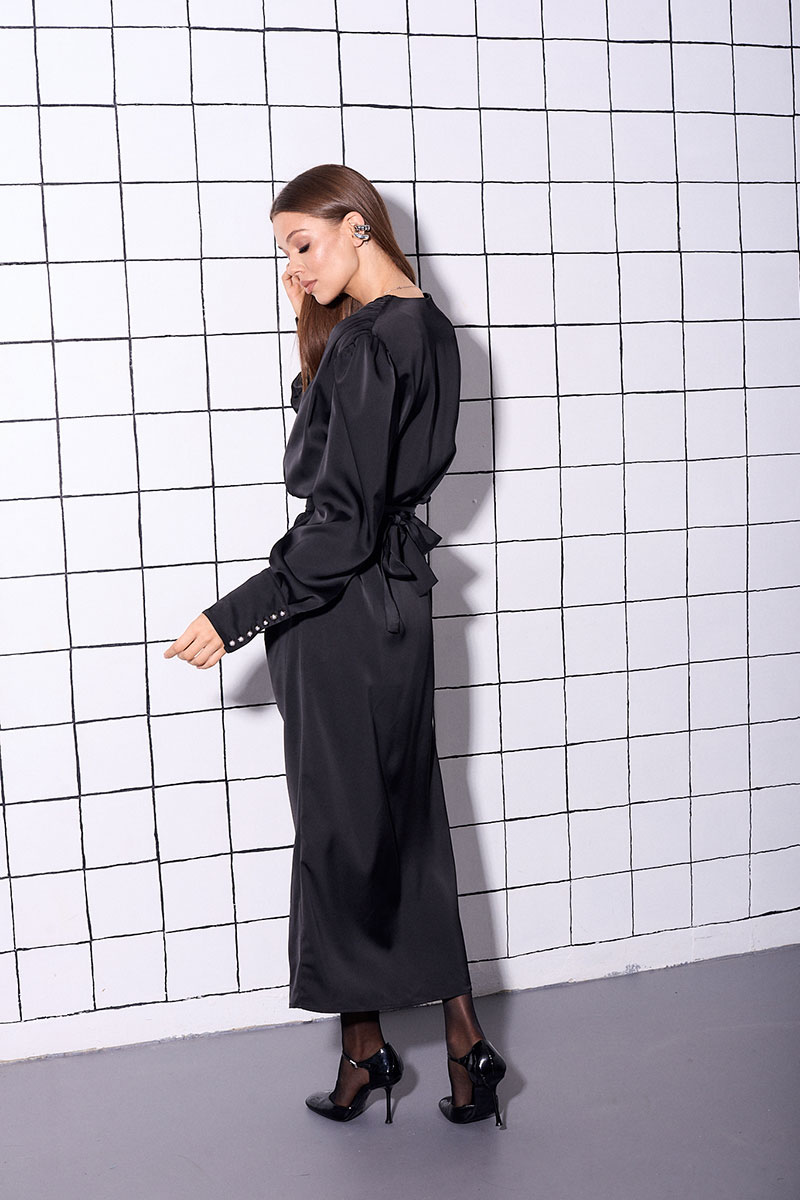 Элегантное, длинное платье из струящейся ткани с ненавязчивым блеском прилегающего силуэта. В платье V-образного вырез, рукав втачной, длинный, на манжете, застёгивается на пуговицы. Линия плеча расширена. Платье имеет потайную застёжку молнию и отдельный декоративный пояс.