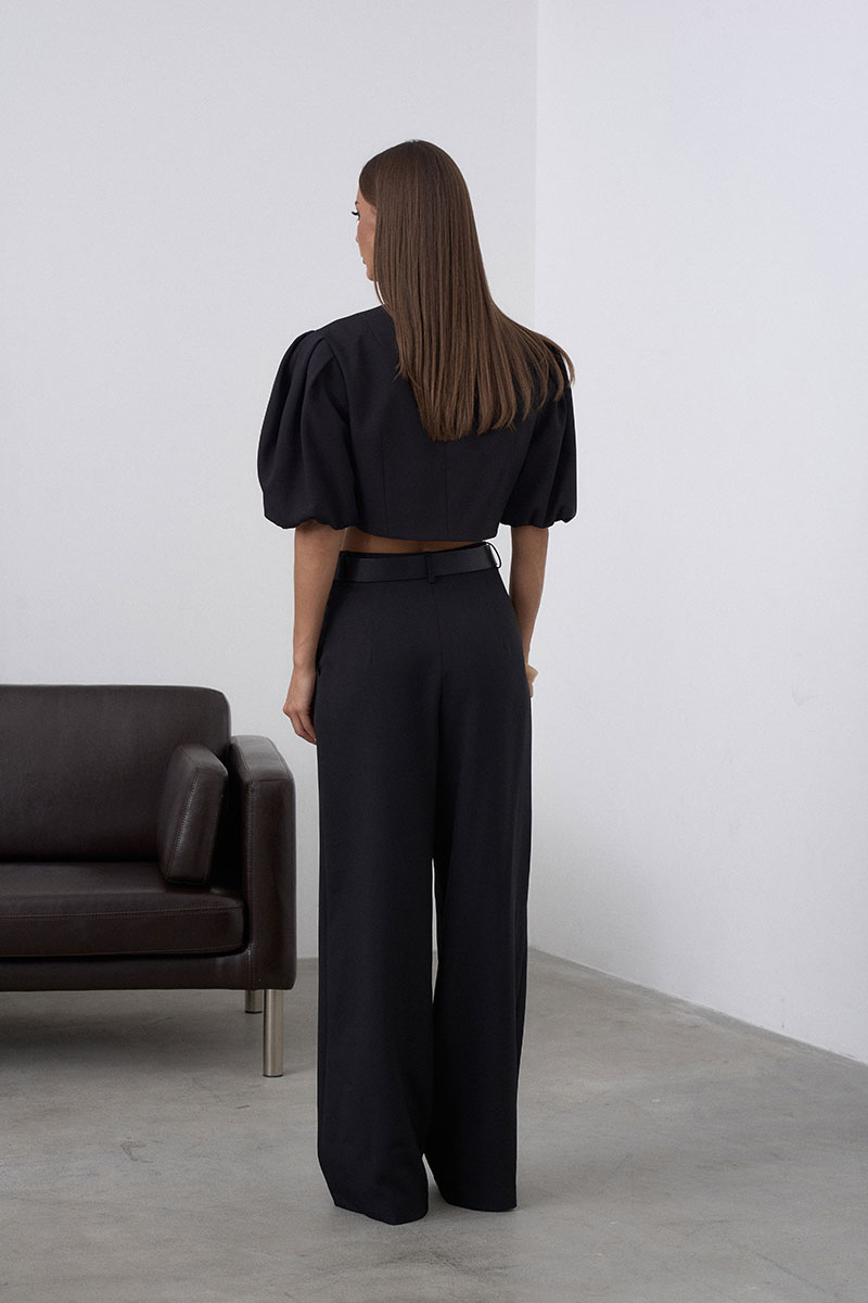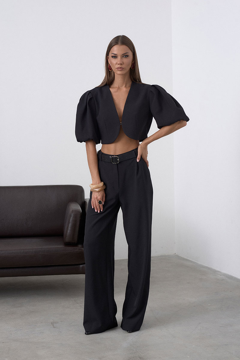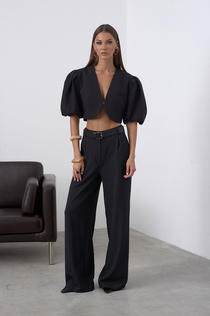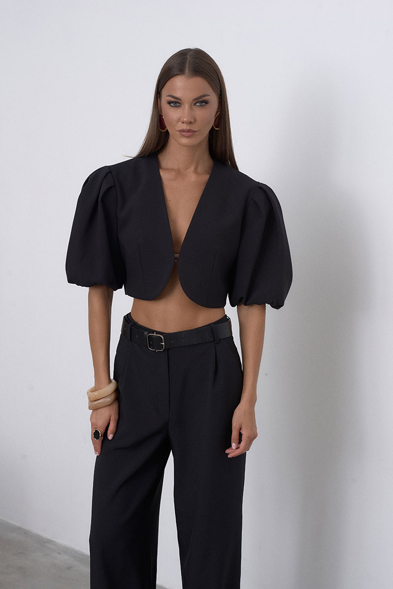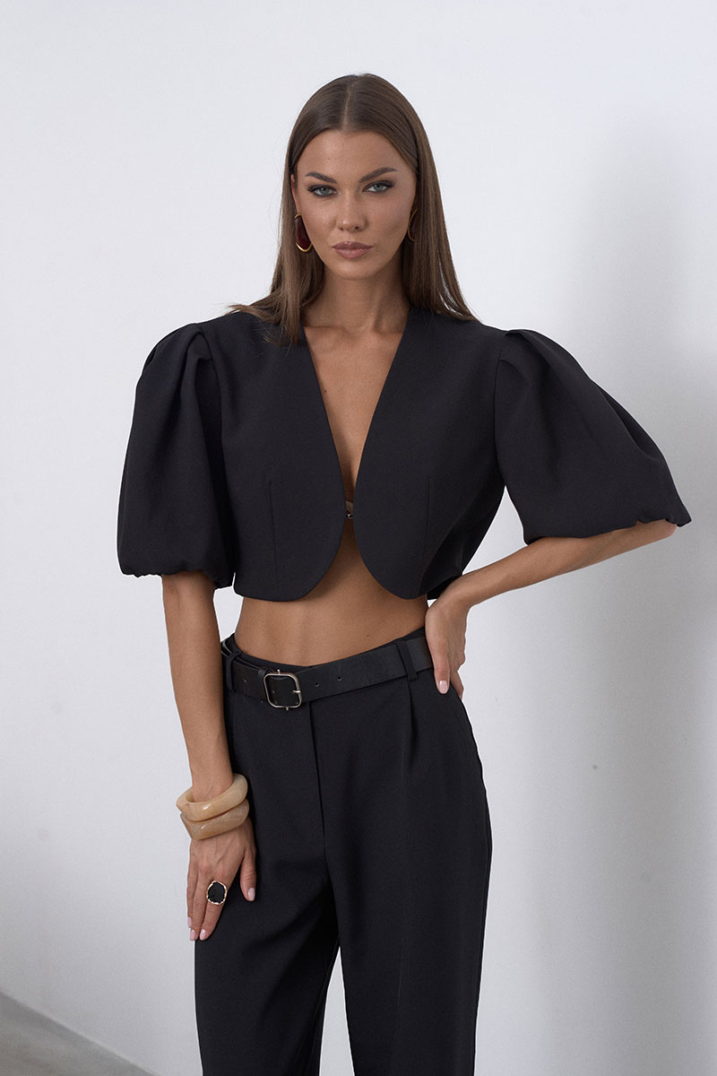 Элегантный, укороченный жакет на подкладке, с округлыми линиями, что позволяет подчеркнуть талию. Рукав втачной, пышный, короткий, у основания собран на резинку. Жакет застёгивается на один крючок. Минималистичный, без лишних деталей, что делает его универсальным.
