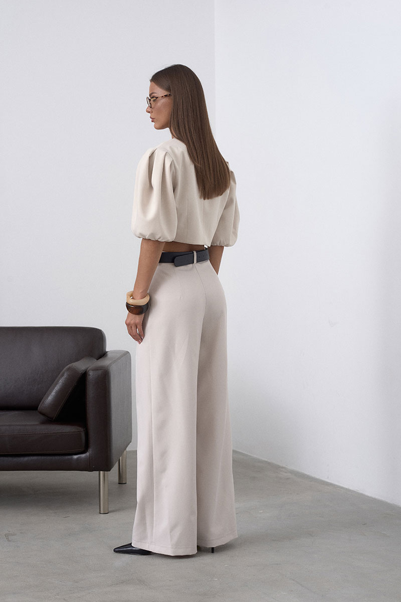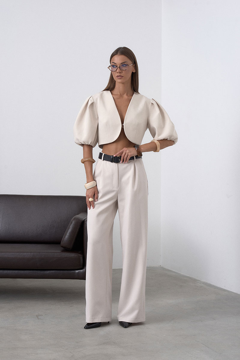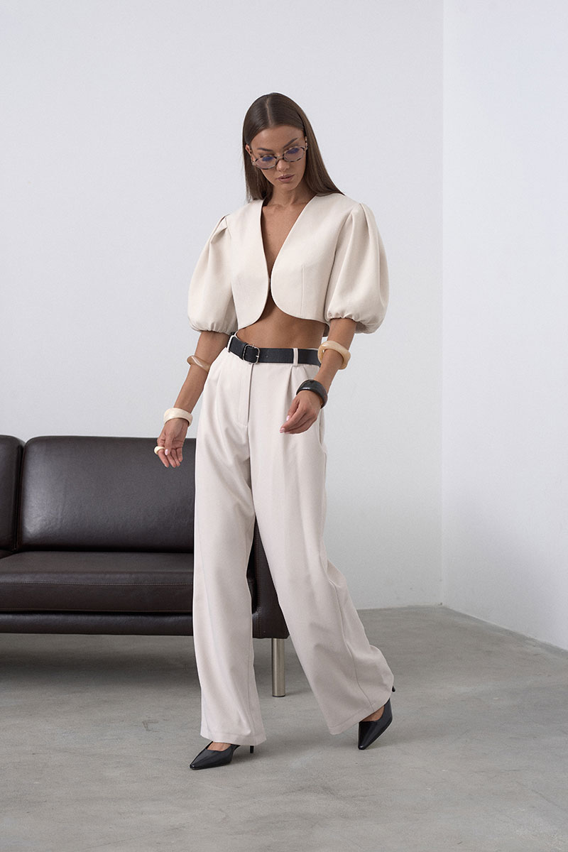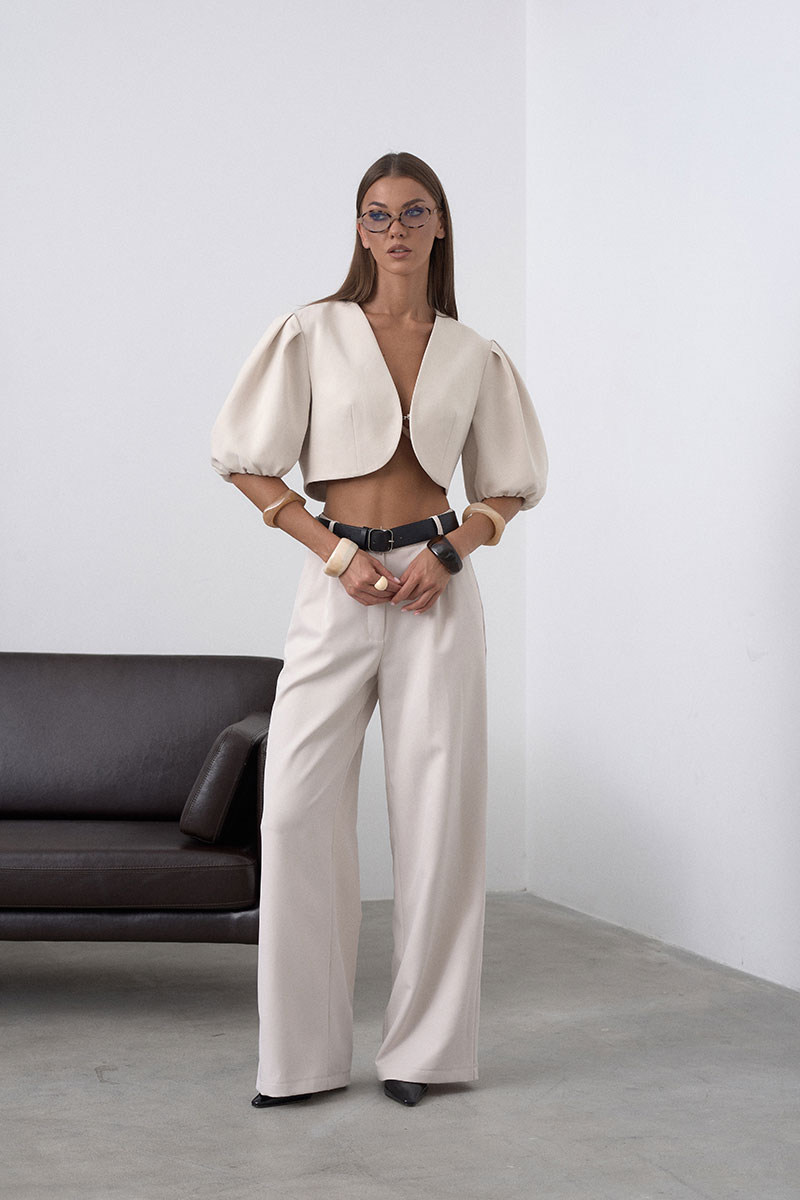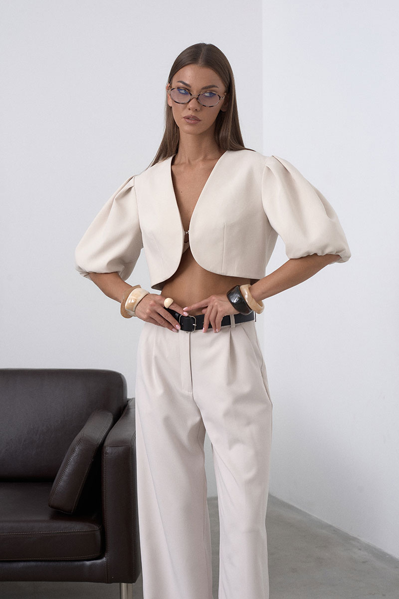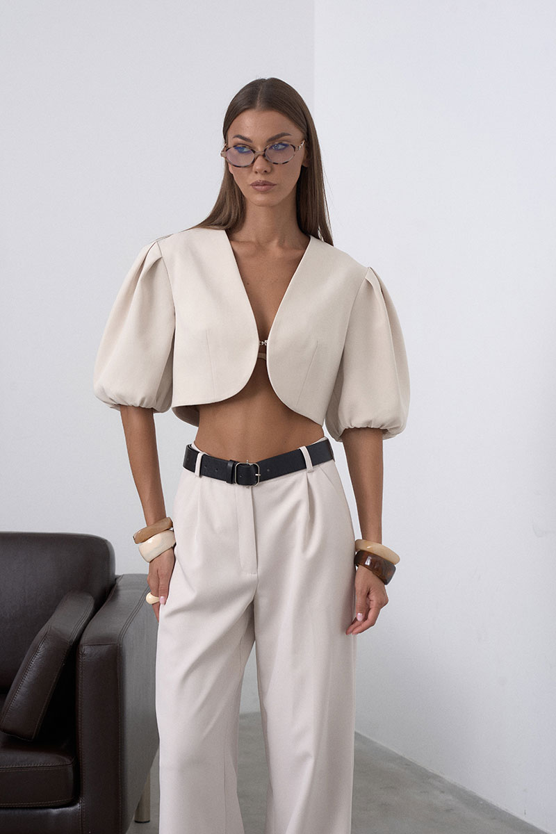 Элегантный, укороченный жакет на подкладке, с округлыми линиями, что позволяет подчеркнуть талию. Рукав втачной, пышный, короткий, у основания собран на резинку. Жакет застёгивается на один крючок. Минималистичный, без лишних деталей, что делает его универсальным.