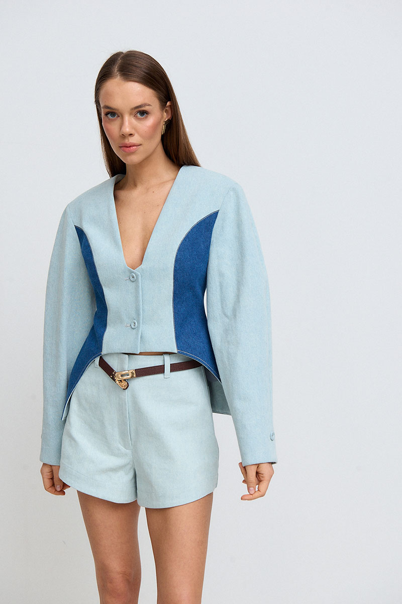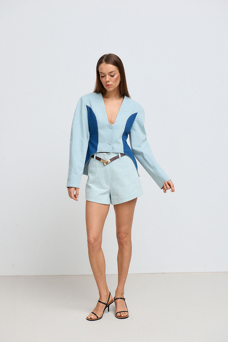 Шорты женские, короткие, слегка расширенные к низу. На поясе расположены шлёвки. На задних половинах шорт накладные карманы. Пояс в комплекте не идет.