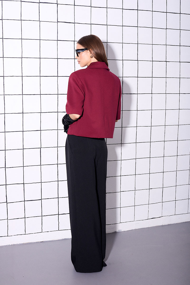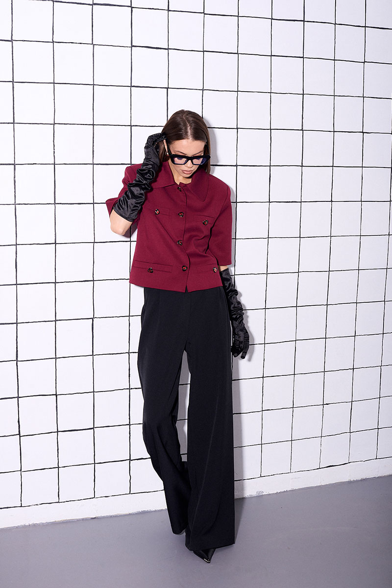Жакет прямого кроя, укороченный, на подкладке, выполнен из костюмной ткани. Рукав втачной, короткий, с плечевой накладкой. На переде жакета расположены декоративные прорезные карманы с листочкой и декоративными пуговицами.