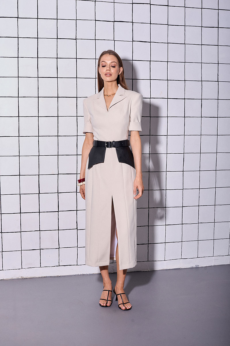 Платье приталенного силуэта, длинное, на подкладке, изготовлено из костюмной ткани. Рукав втачной, короткий, с плечевыми накладками. Воротник пиджачного типа. В платье по переду расположен разрез, а также вертикальные рельефы. В комплекте к платью идет баска из искусственной кожи (ремень в комплекте не идет).