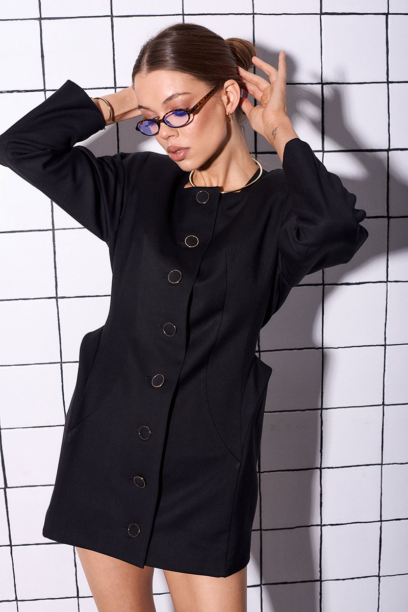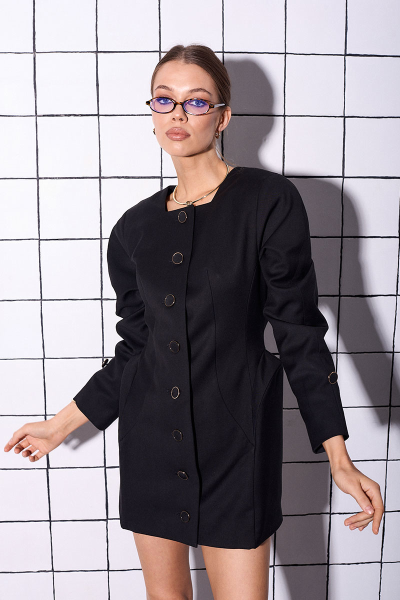 Платье приталенного силуэта, короткое, на подкладке, изготовлено из костюмной ткани. Рукав реглан, длинный, с плечевыми накладками и декоративными пуговицами. Платье с акцентными рельефами по бокам. Застёгивается по переду на пуговицы.