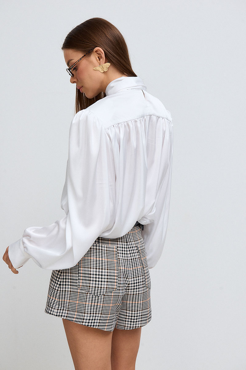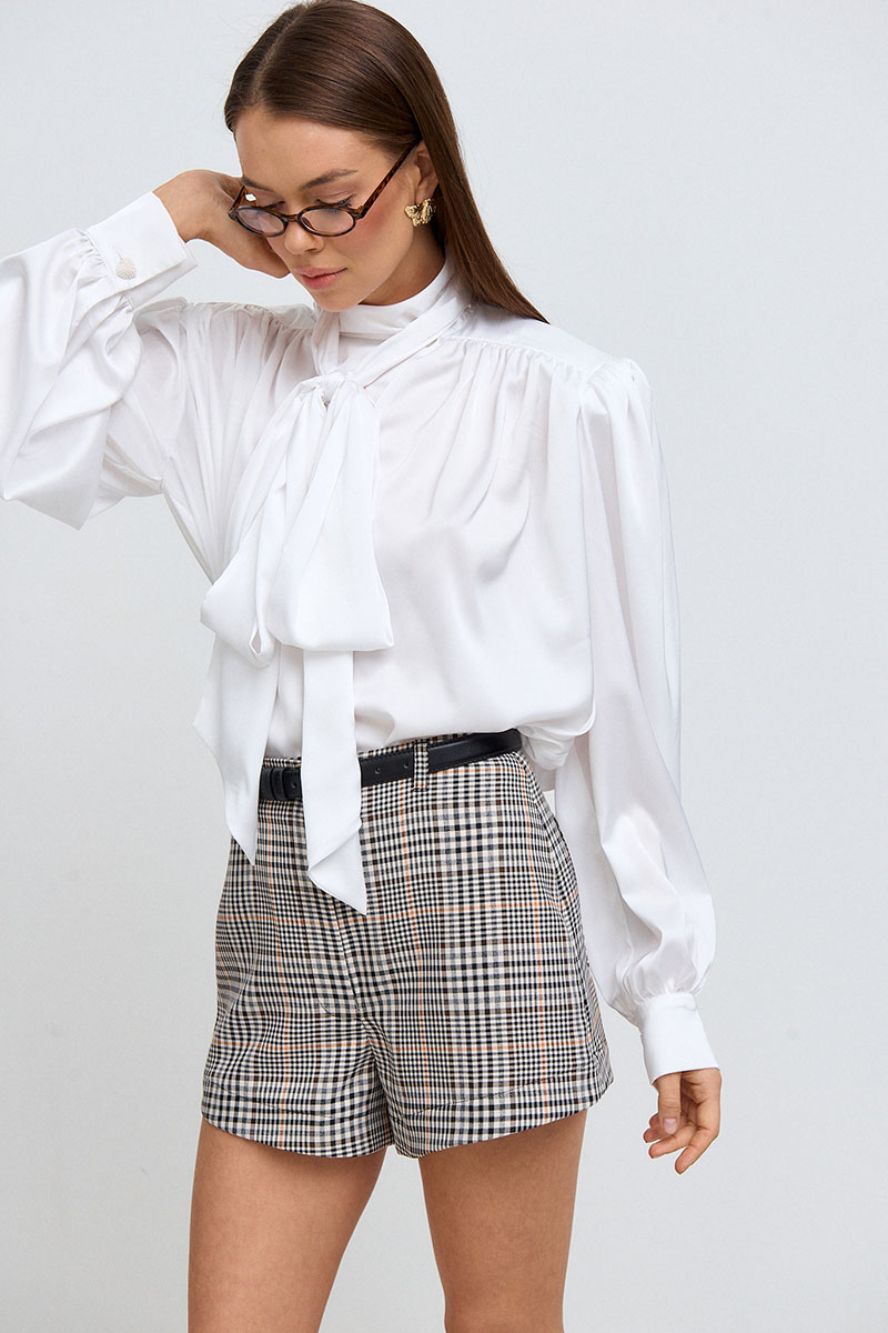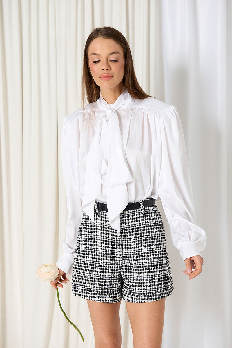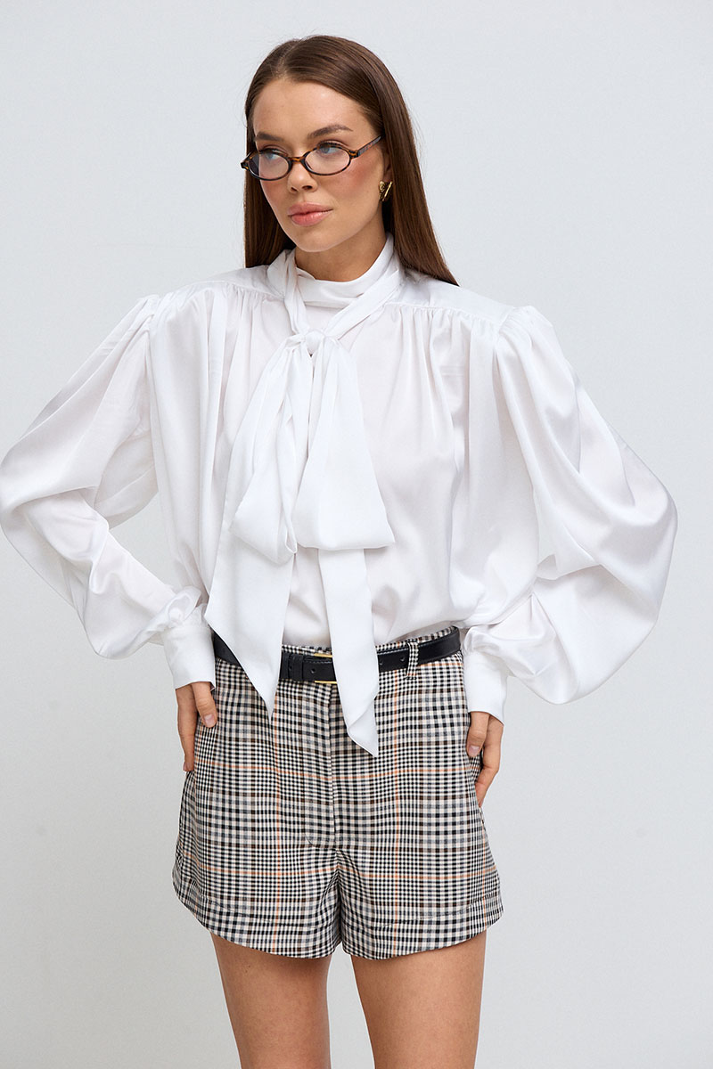 Блуза прямого, свободного силуэта, с акцентной линией плеча и сборкой (плечевые накладки съёмные). Рукав спущенный, прямой, длинный с манжетой на пуговице. Горловина с акцентным декоративным шарфом, который вы можете завязать так, как подходит именно вам.