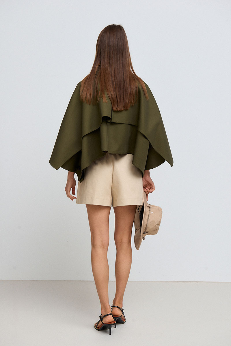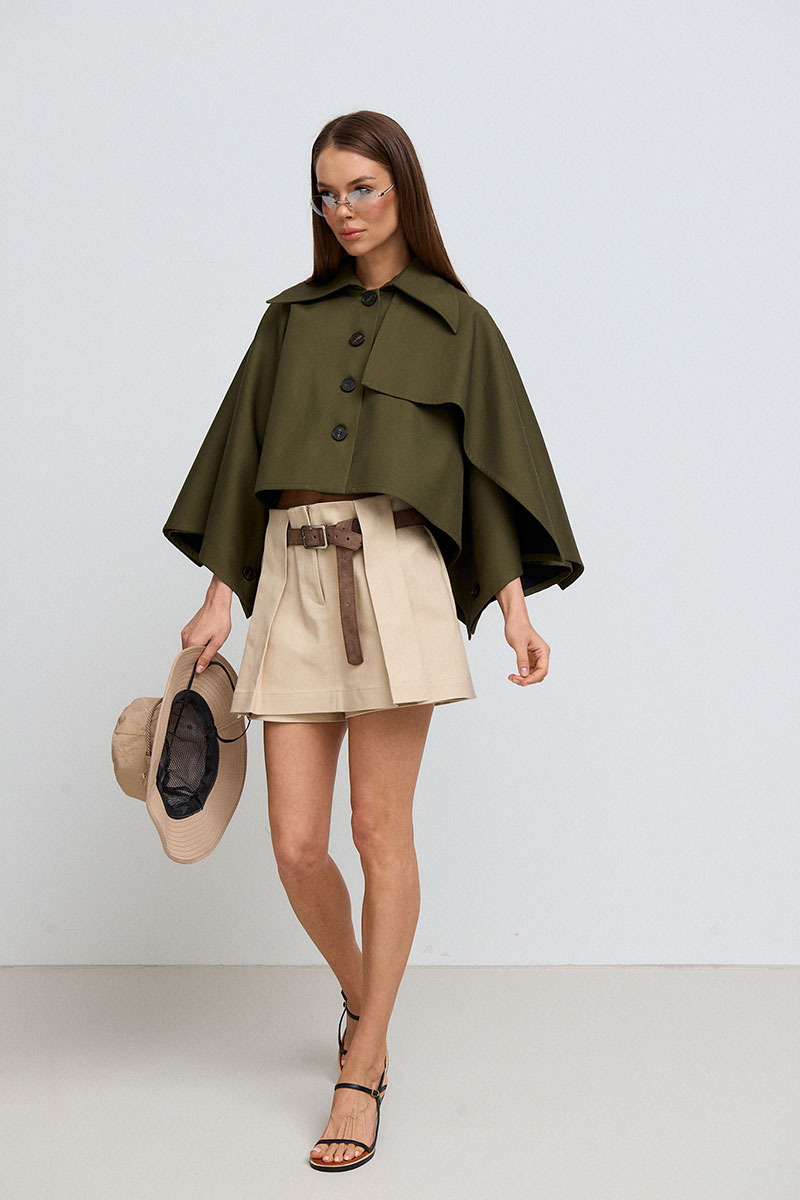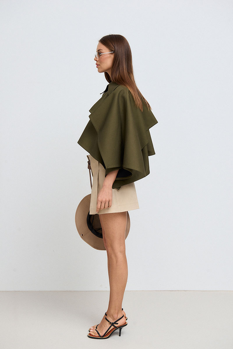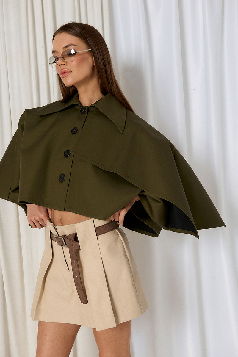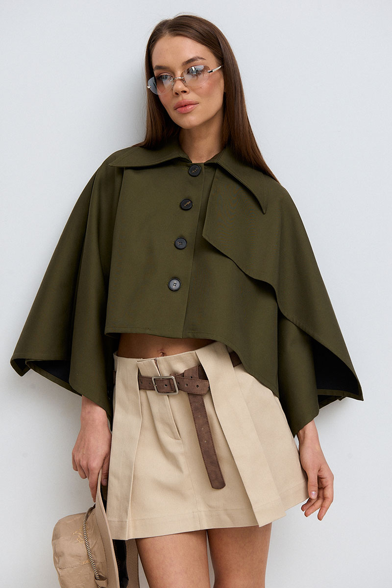 Жакет укороченный, объёмный, застёжка по переду на пуговицы. Воротник рубашечного типа. С одной стороны жакет имеет декоративную кокетку. По спинке складка и отлетная кокетка.
