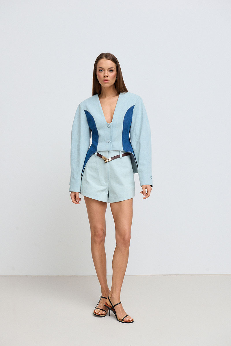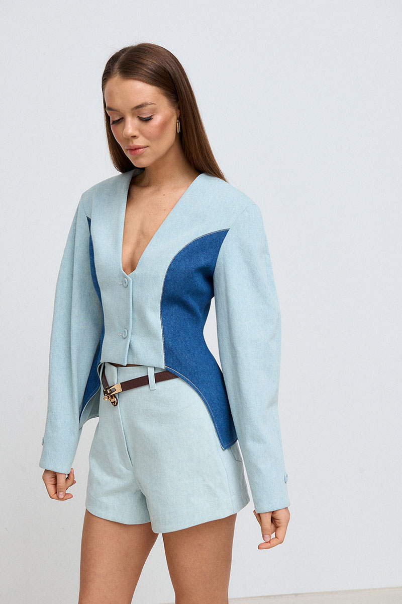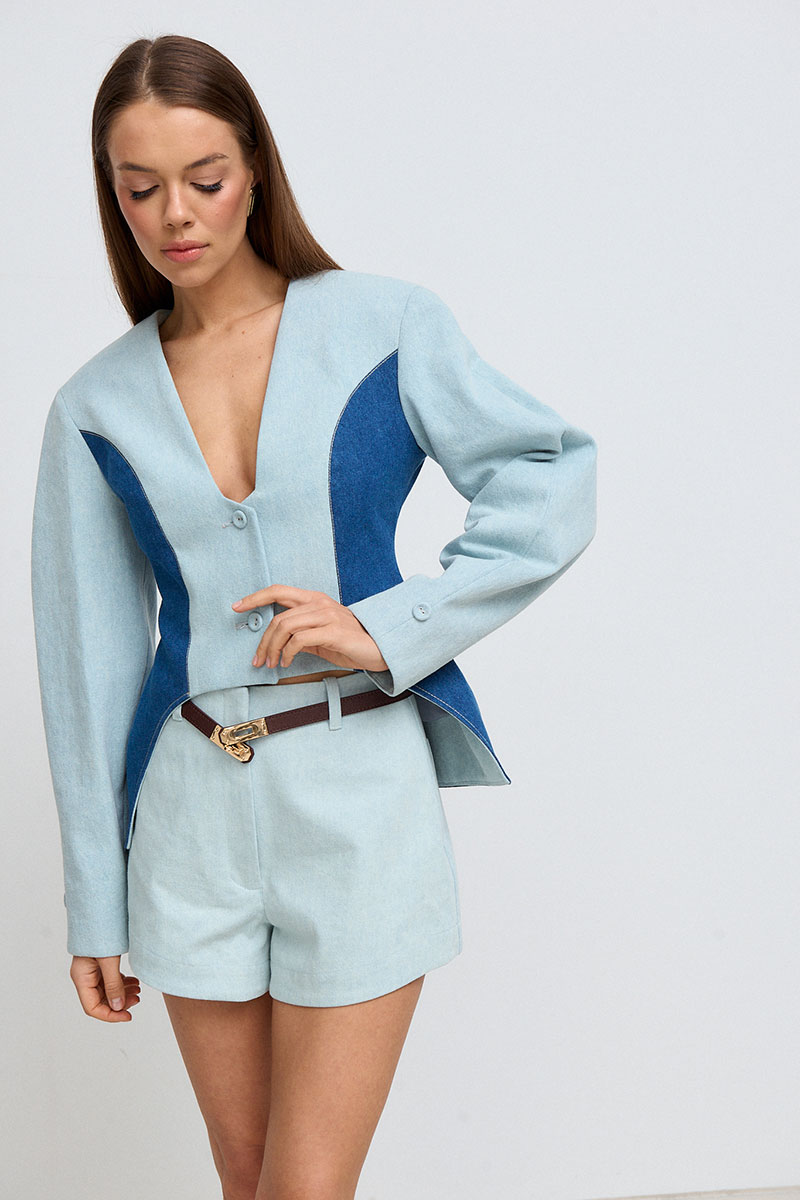 накладками. Жакет, застёгивается по переду на пуговицы. По бокам расположены декоративные контрастные рельефы, которые визуально делают талию стройнее.