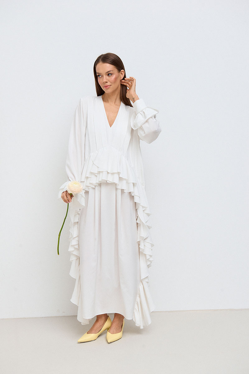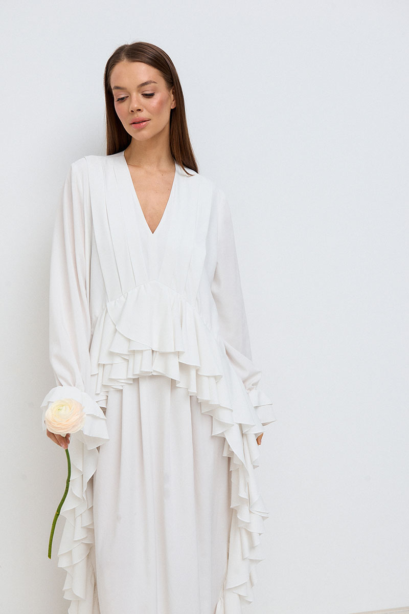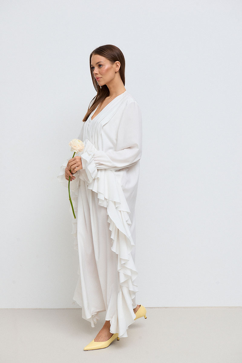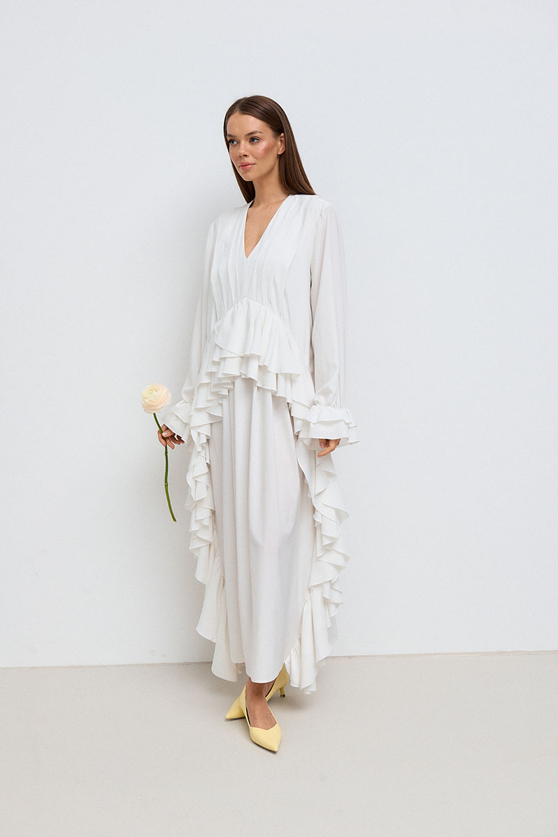 Платье свободного силуэта, прямое, длинное. Горловина V-образная, рукав длинный, втачной, с собранным на резинку воланом по низу рукава. На переде платья расположены многочисленные рюши по талии и длине платья.