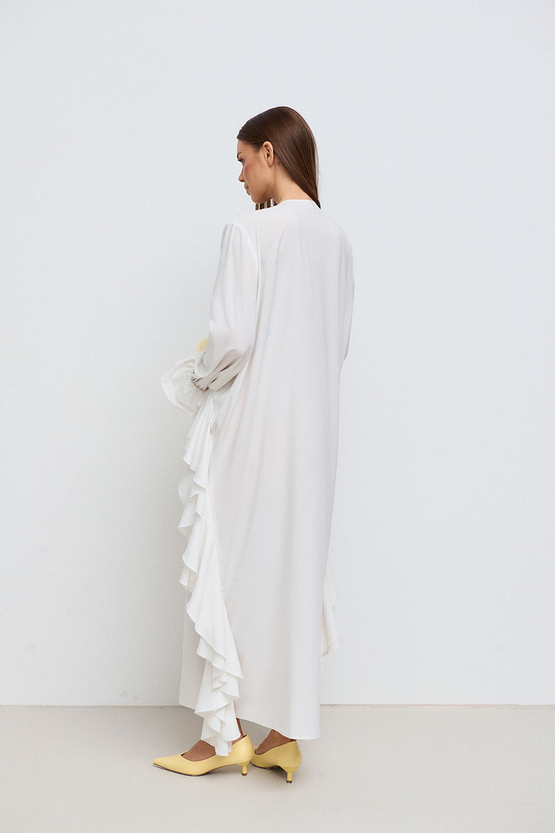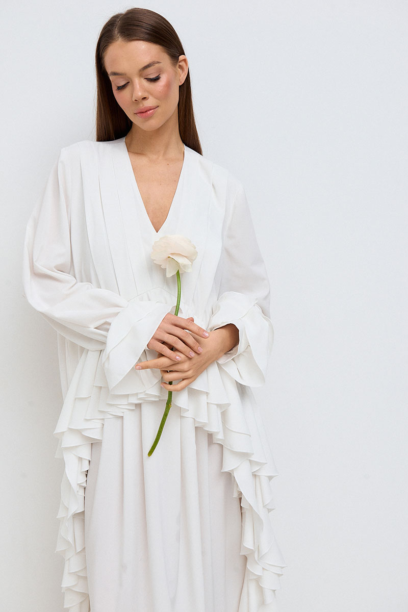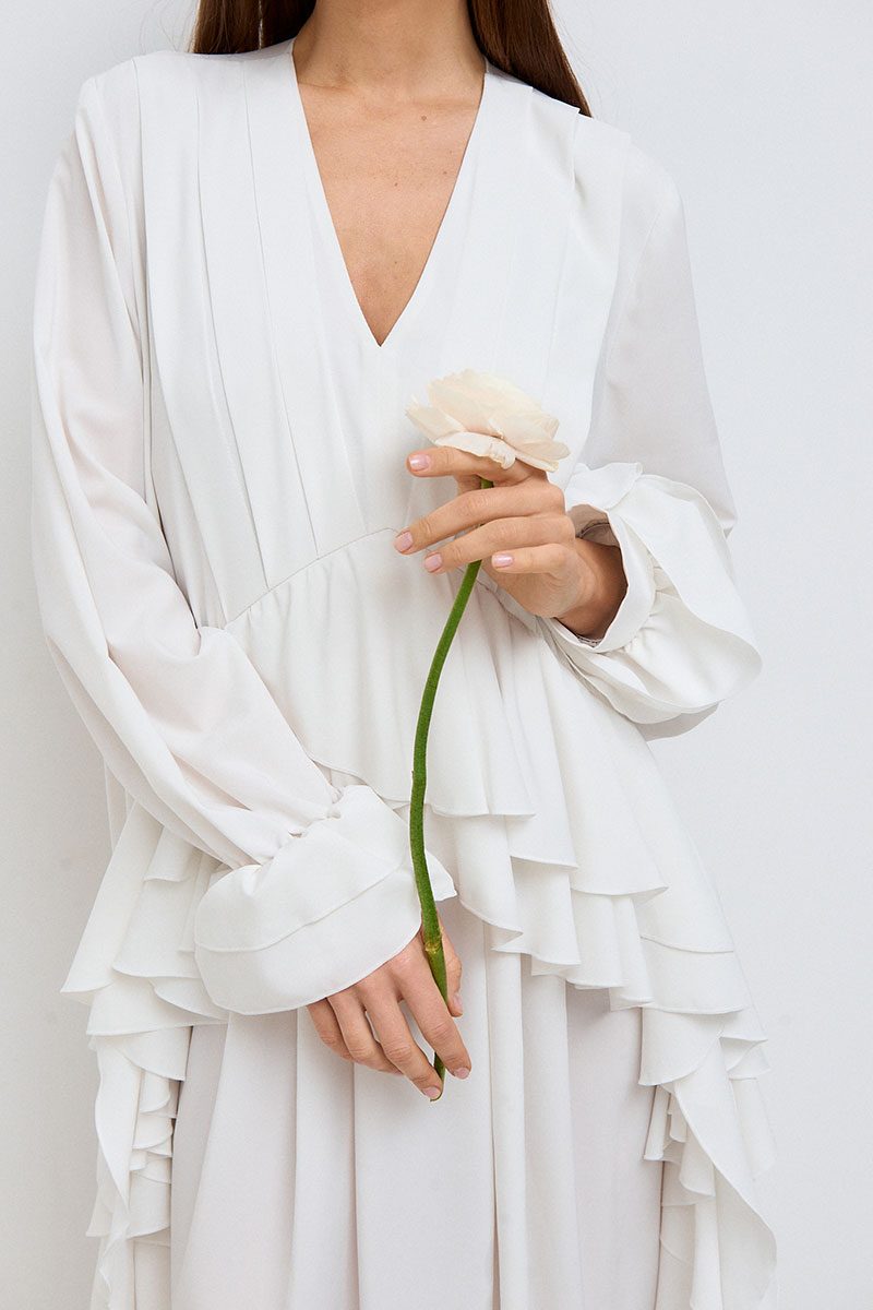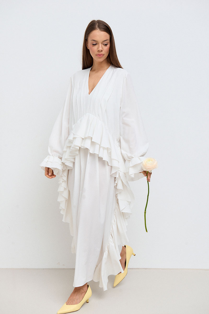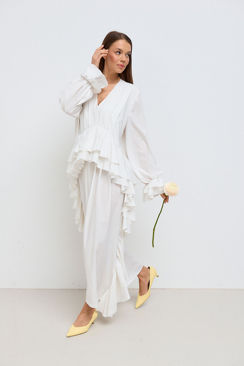 Платье свободного силуэта, прямое, длинное. Горловина V-образная, рукав длинный, втачной, с собранным на резинку воланом по низу рукава. На переде платья расположены многочисленные рюши по талии и длине платья.