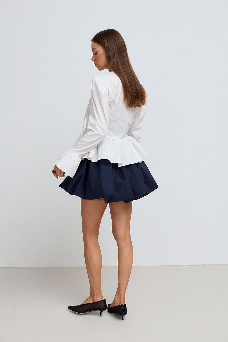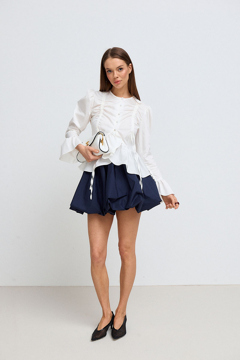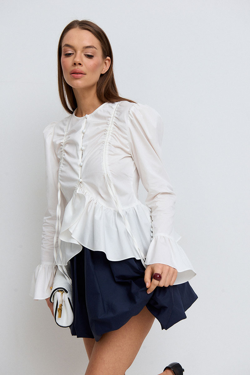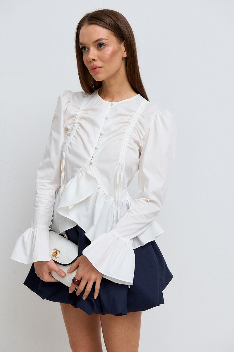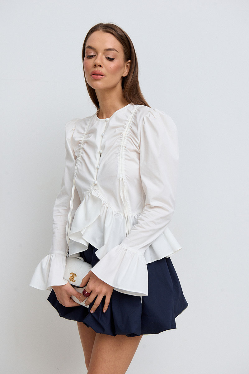 Блуза приталенного силуэта, рукав втачной, объёмный, длинный, с декоративными воланами по низу рукава. Горловина круглая. Блуза застёгивается на пуговицы по переду изделия, имеет функциональные кулисы и волан по низу.