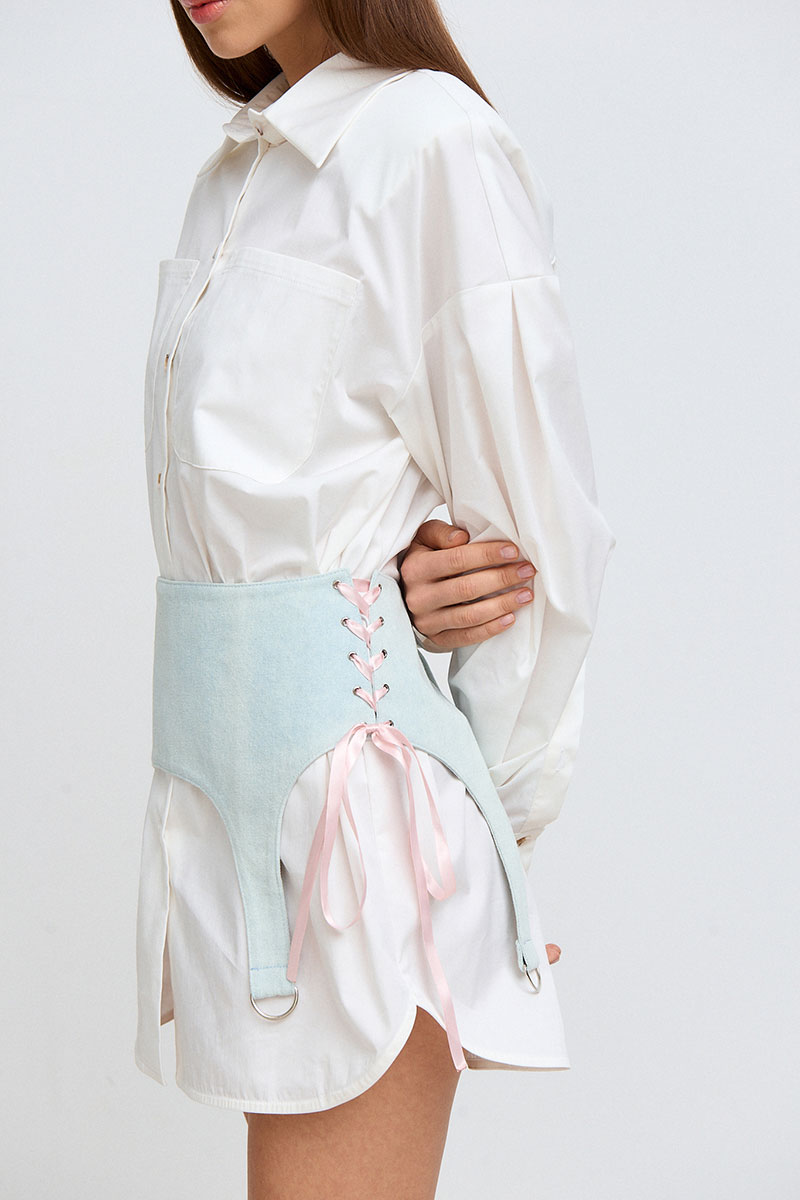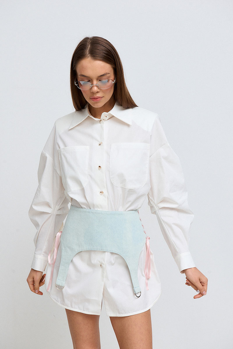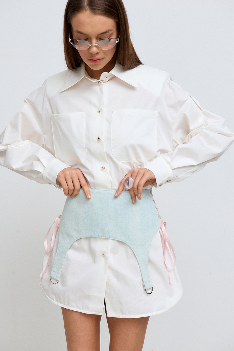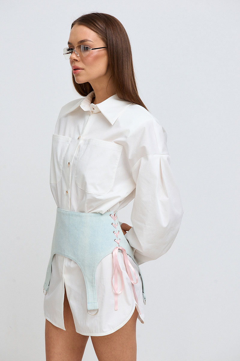 Платье-рубашка средней длины (выше колена). Рукав спущенный, длинный, на манжете и с плечевыми съёмными накладками. На переде изделия расположена планка, застёгивающаяся на пуговицы, а также накладные карманы. В комплекте к платью идёт съёмная джинсовая баска, с помощью которой вы можете регулировать приталенность силуэта.