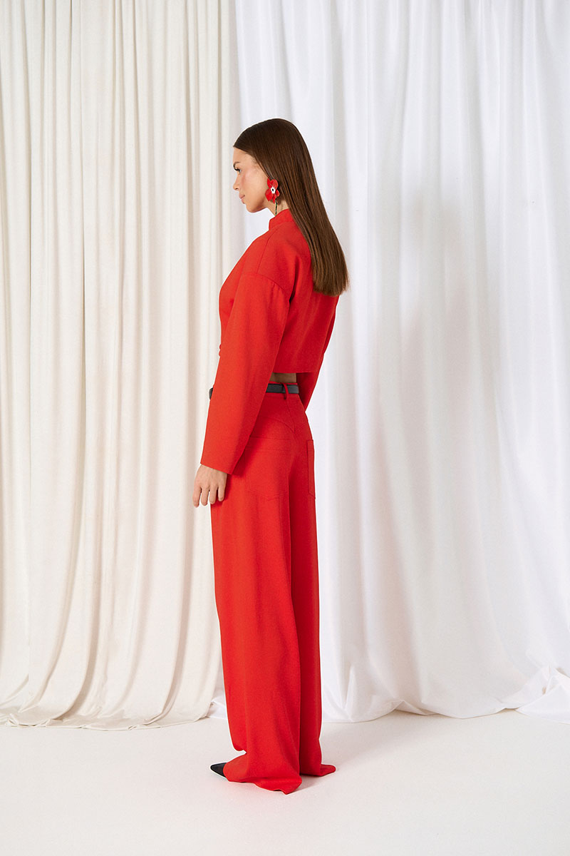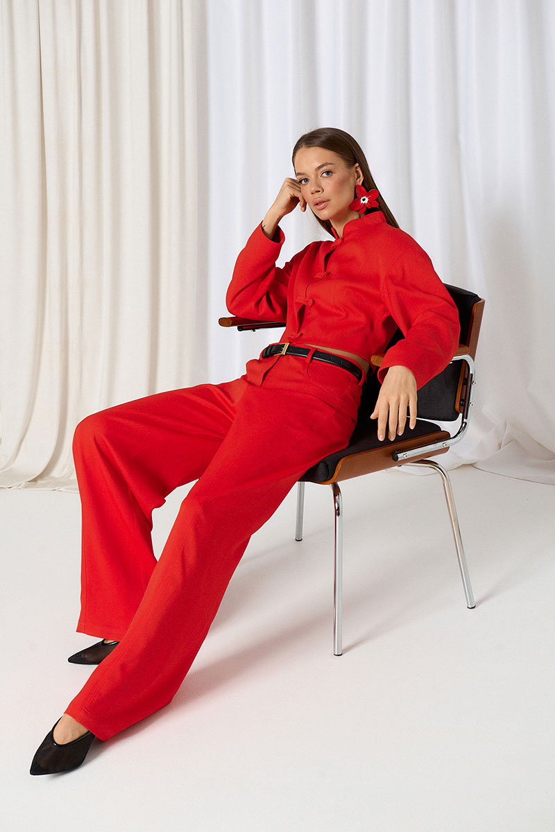 Брюки прямые, средней посадки, широкие. Пояс притачной со шлёвками. На переде брюк расположены боковые карманы. На задних половинах брюк расположена кокетка и накладные карманы. Пояс в комплекте не идет.