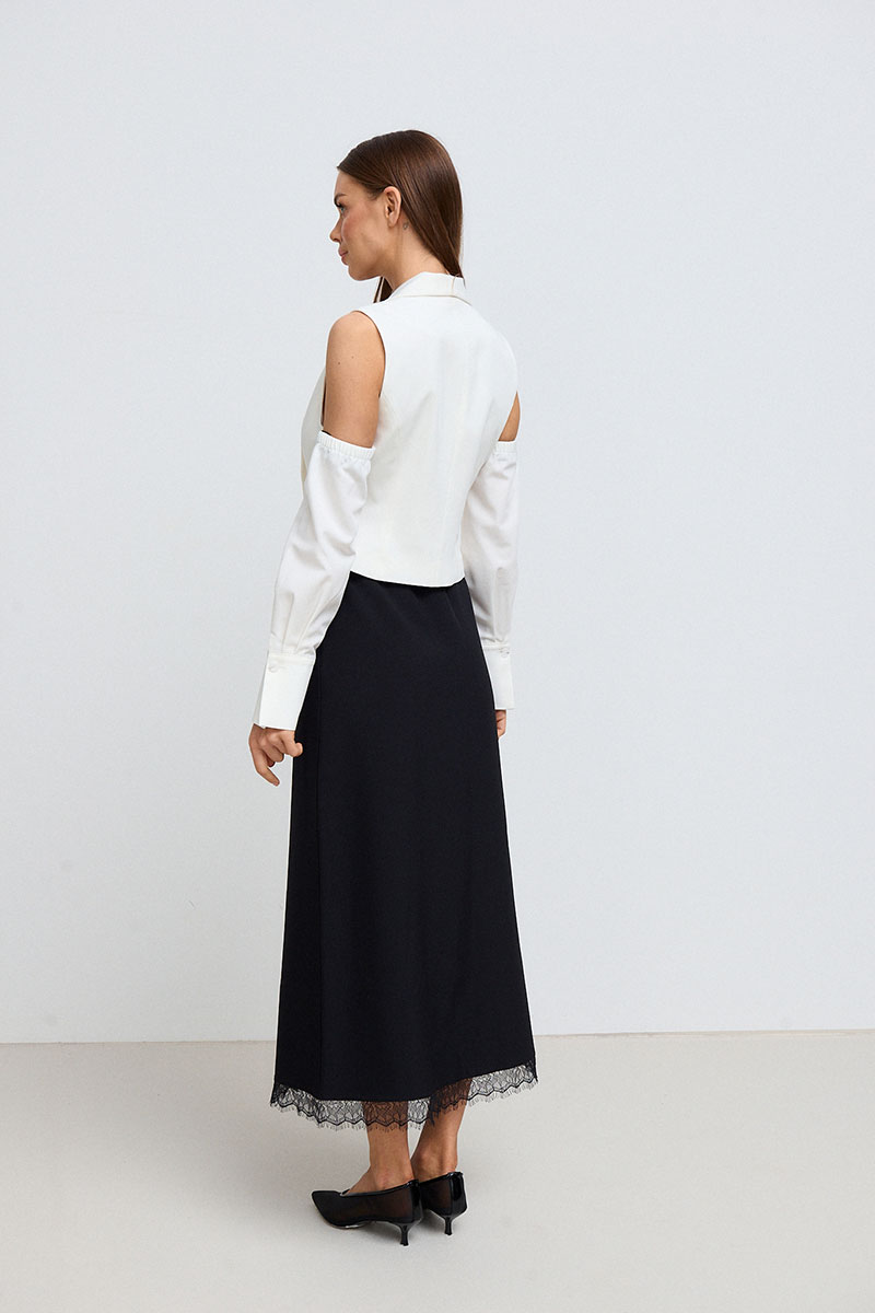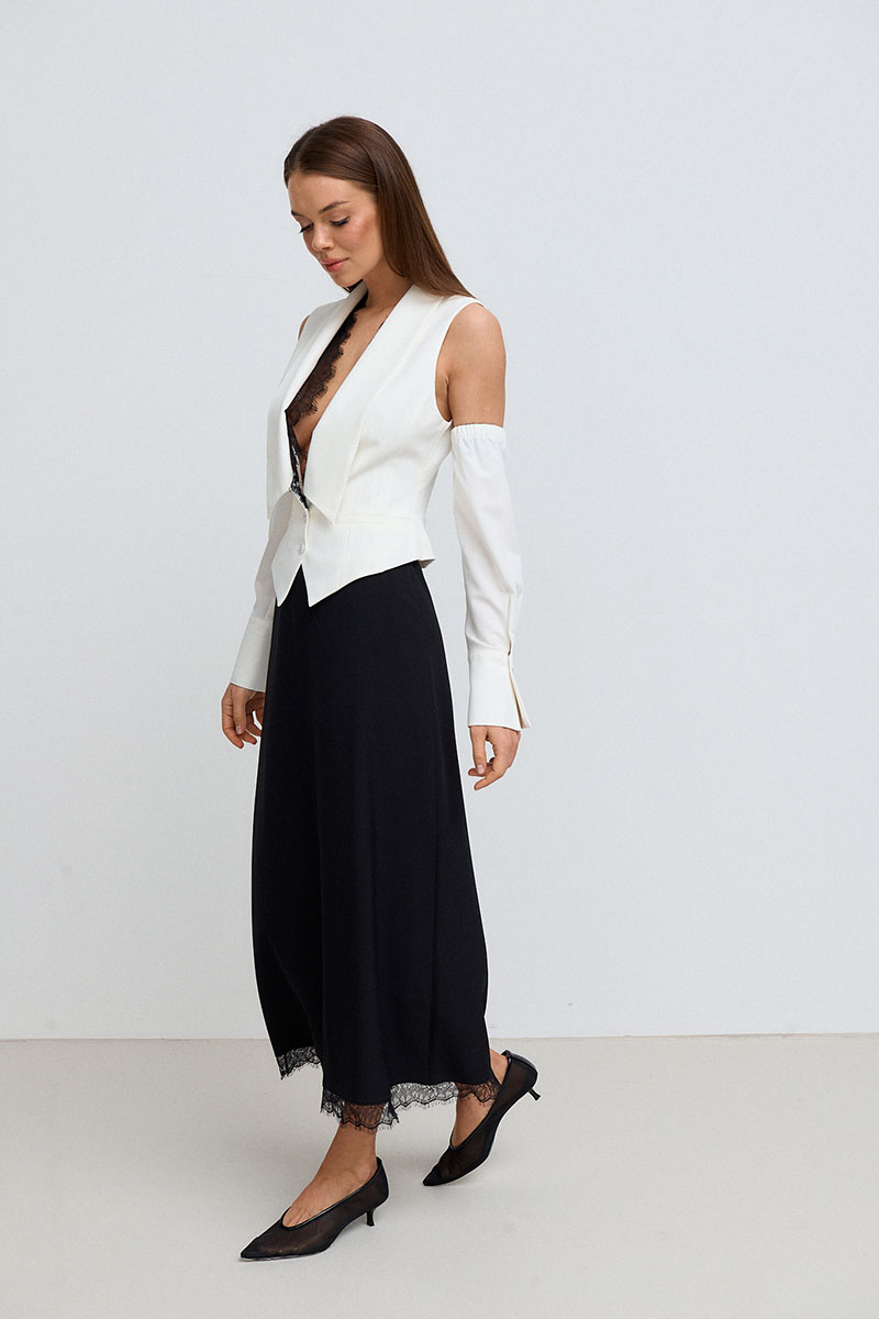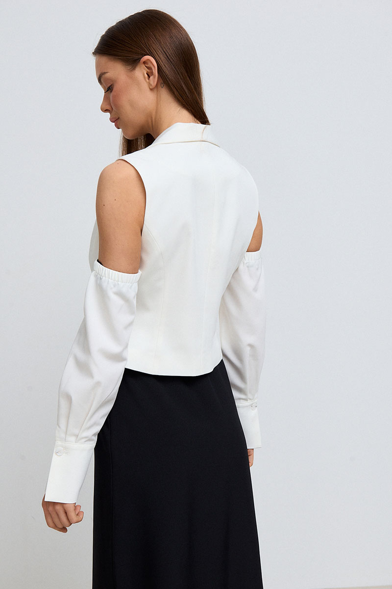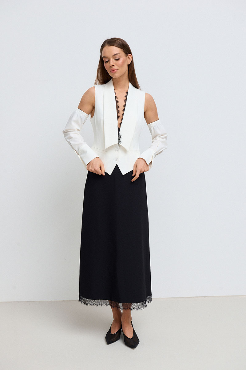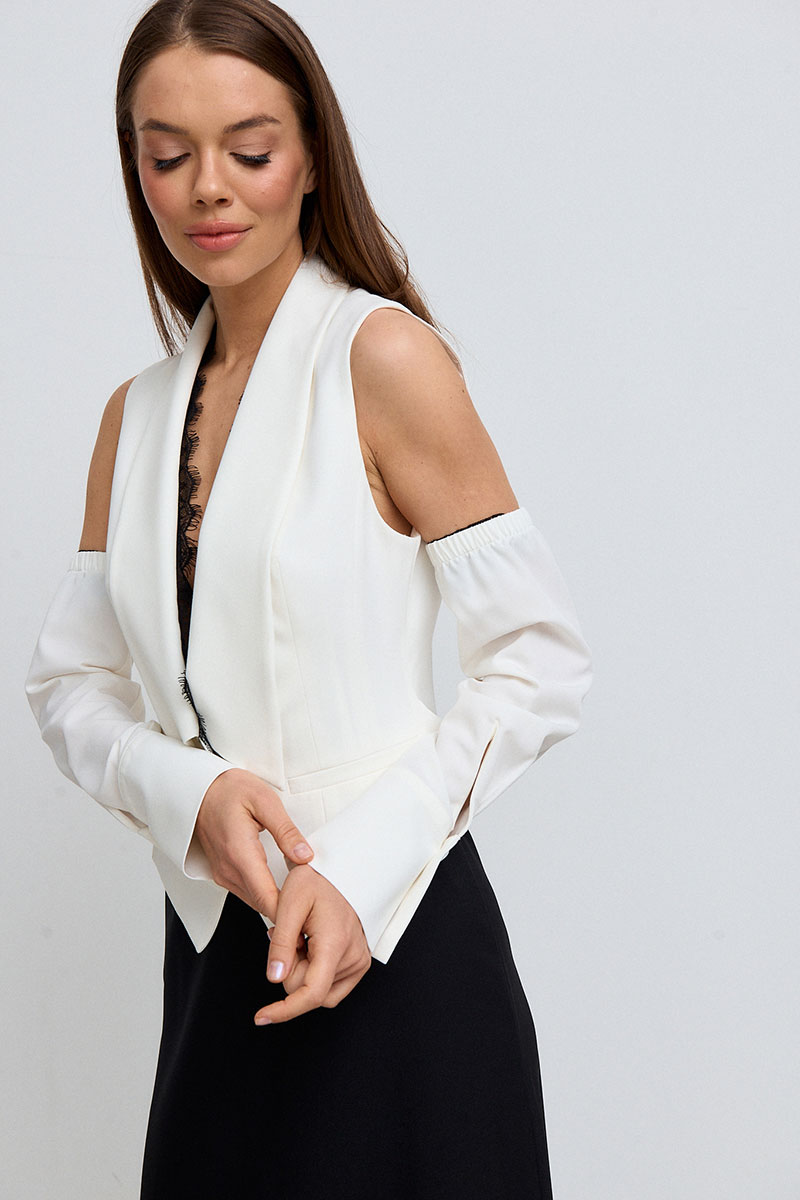 Жилет приталенного силуэта, короткий, с глубоким V-образным акцентным вырезом с декоративным кружевом и отложным воротником. Жилет с рукавами. Рукава длинные, на манжете.