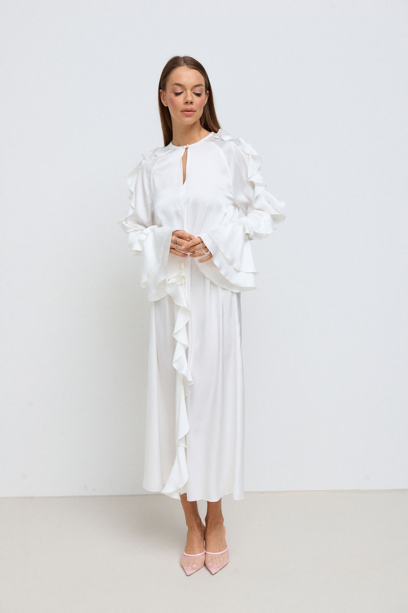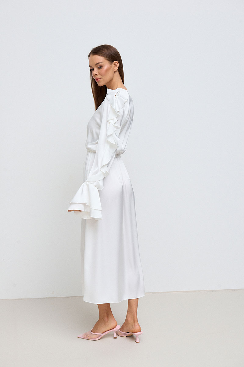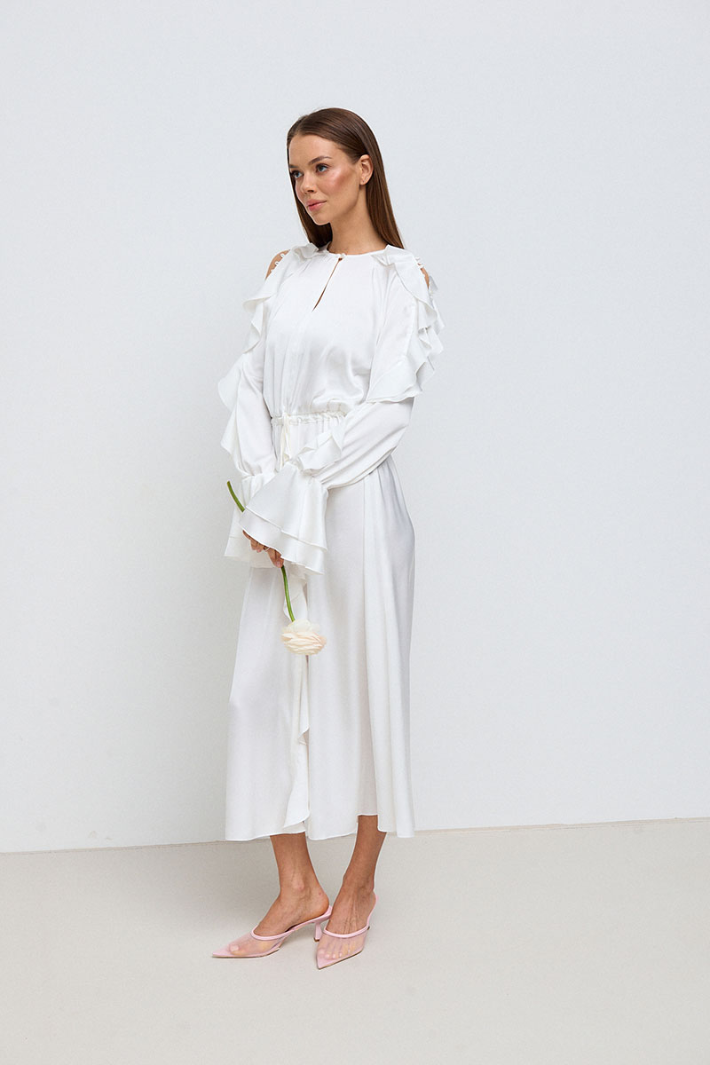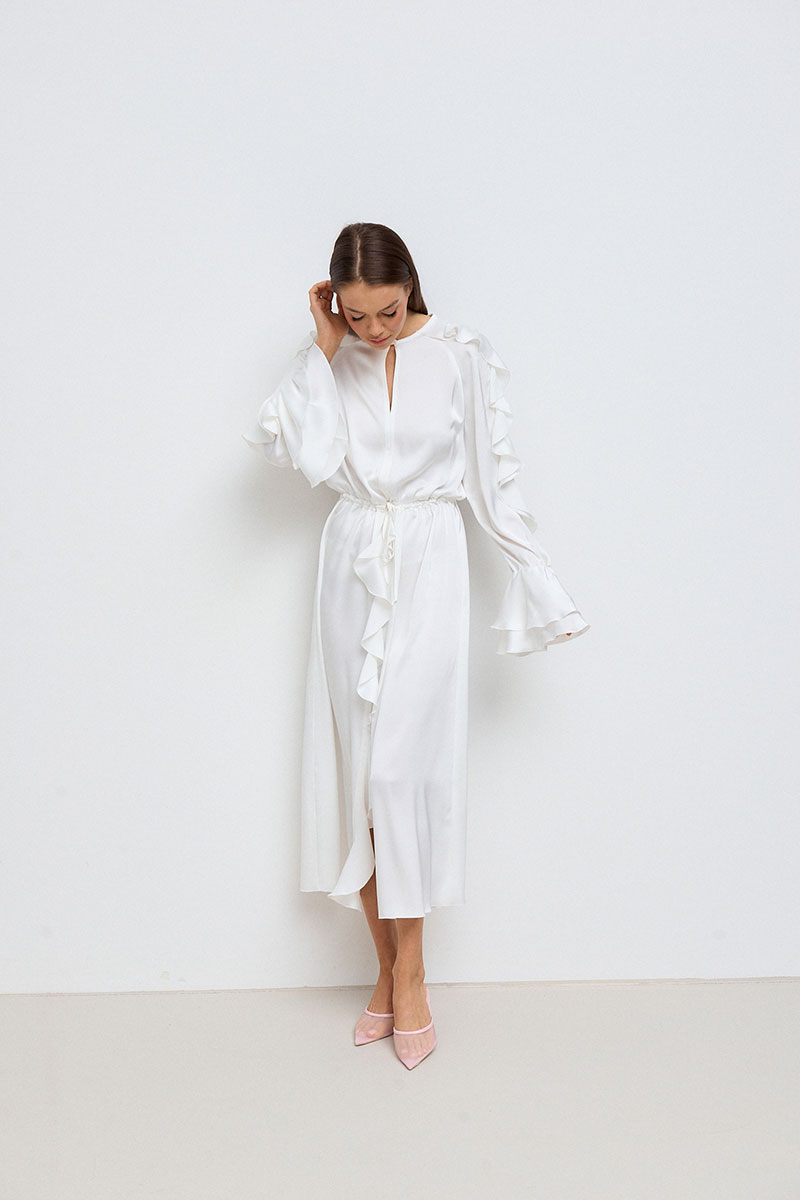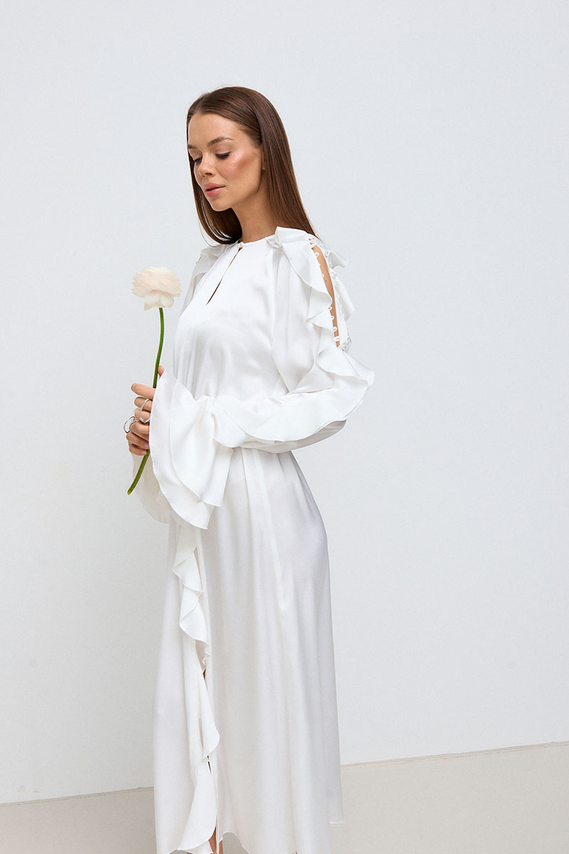 Платье длинное, свободного, прямого силуэта. Рукав втачной, длинный, по низу на резинку собраны декоративные воланы, плечевая часть рукава, застёгивается на пуговицы. По талии расположена кулиса для создания красивого силуэта. Также по переду расположен разрез с декоративным воланом с одной стороны.
