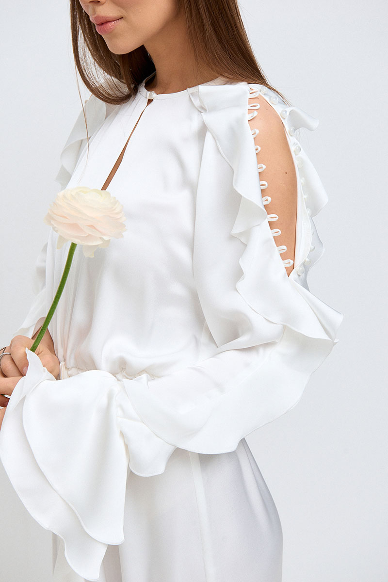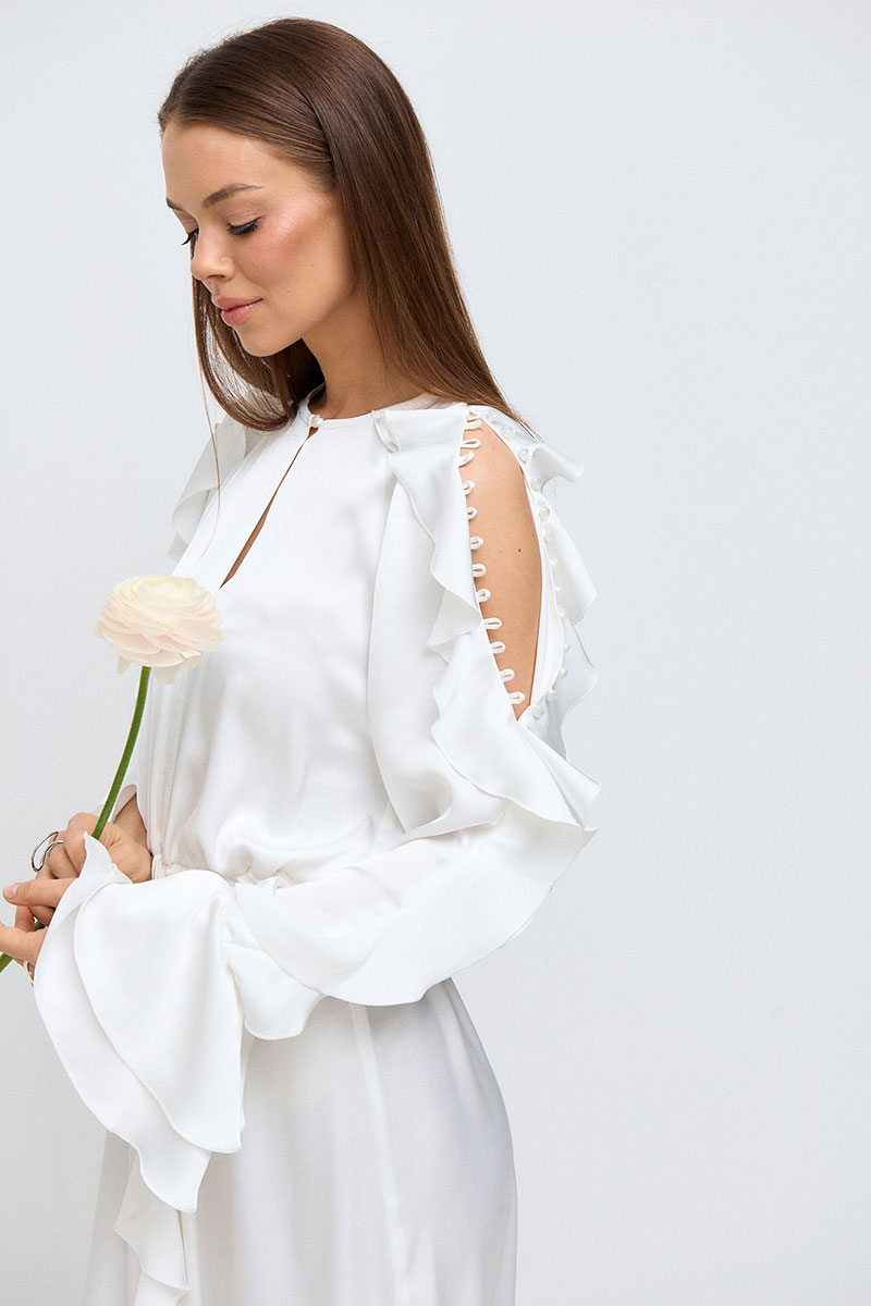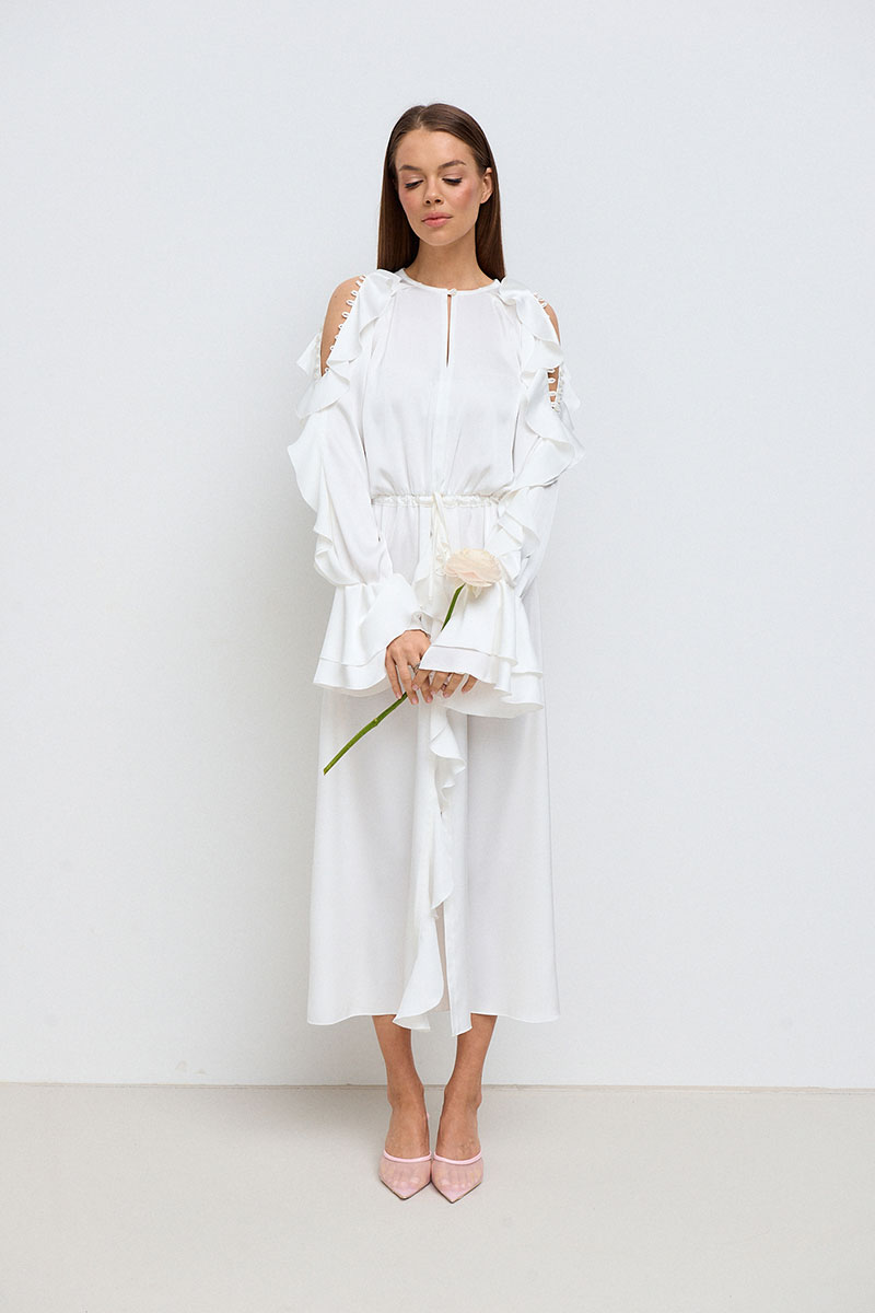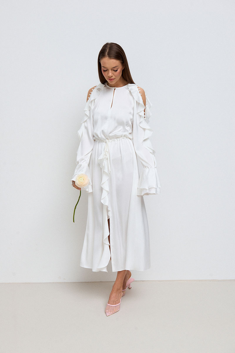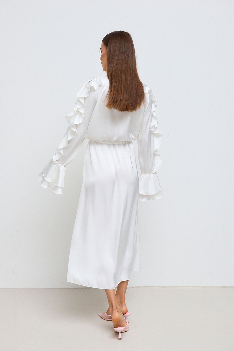 Платье длинное, свободного, прямого силуэта. Рукав втачной, длинный, по низу на резинку собраны декоративные воланы, плечевая часть рукава, застёгивается на пуговицы. По талии расположена кулиса для создания красивого силуэта. Также по переду расположен разрез с декоративным воланом с одной стороны.
