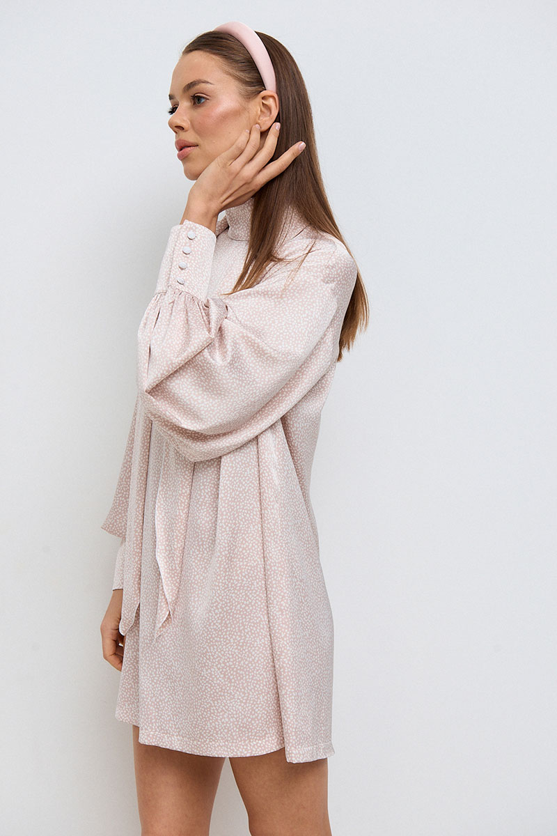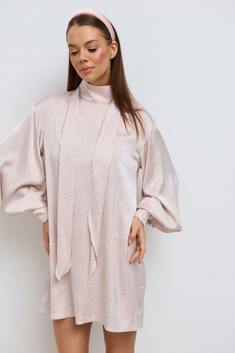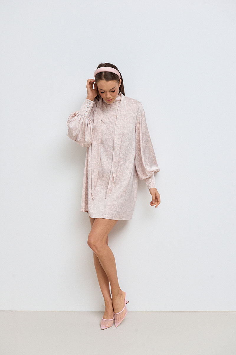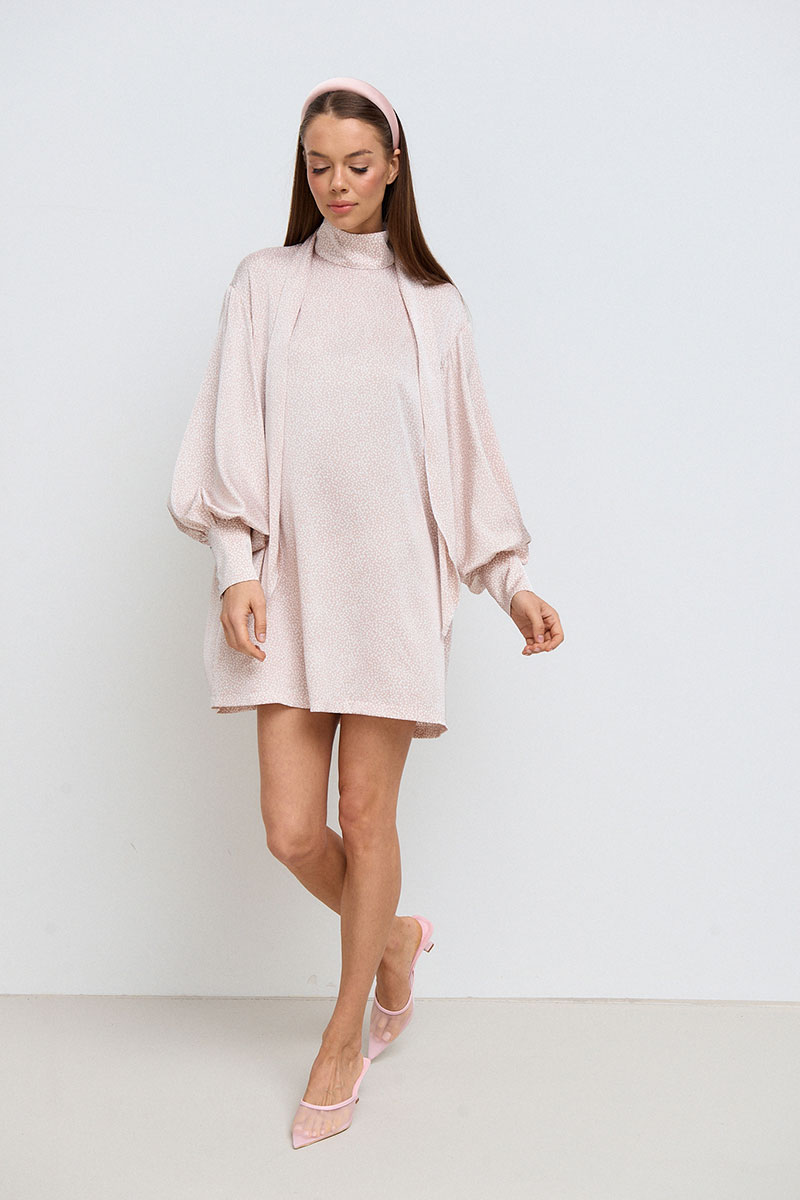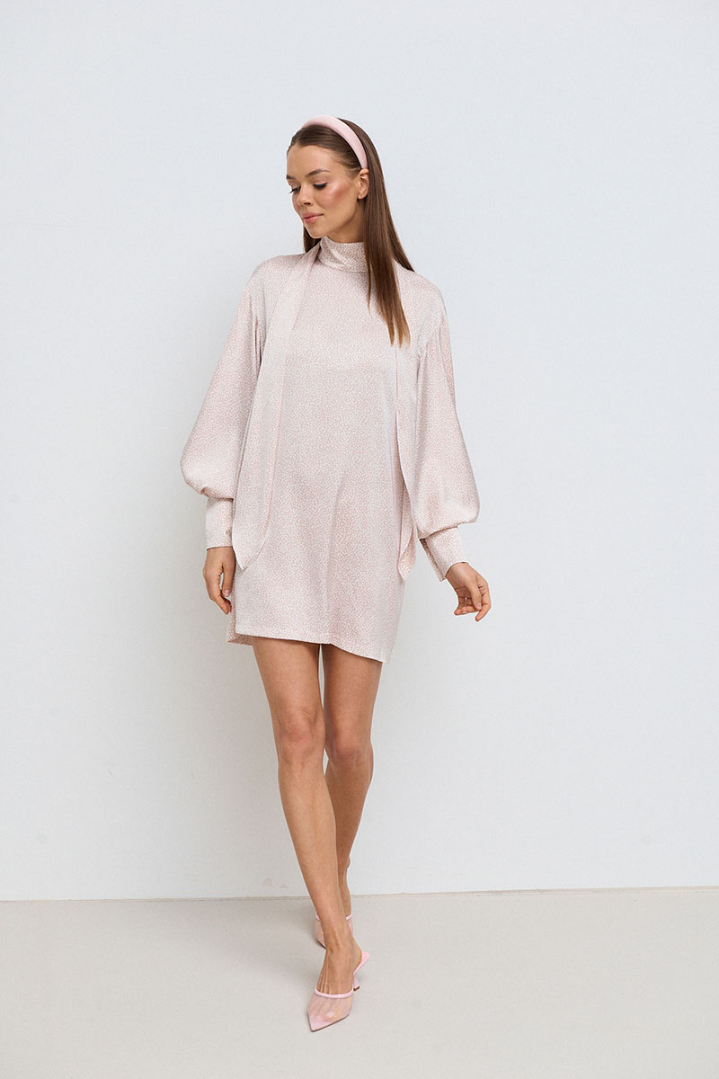 Платье прямого, свободного силуэта, в длине мини. Горловина стойка. Рукав спущенный, ¾ длины на манжете. Платье дополнено декоративным шарфом.
