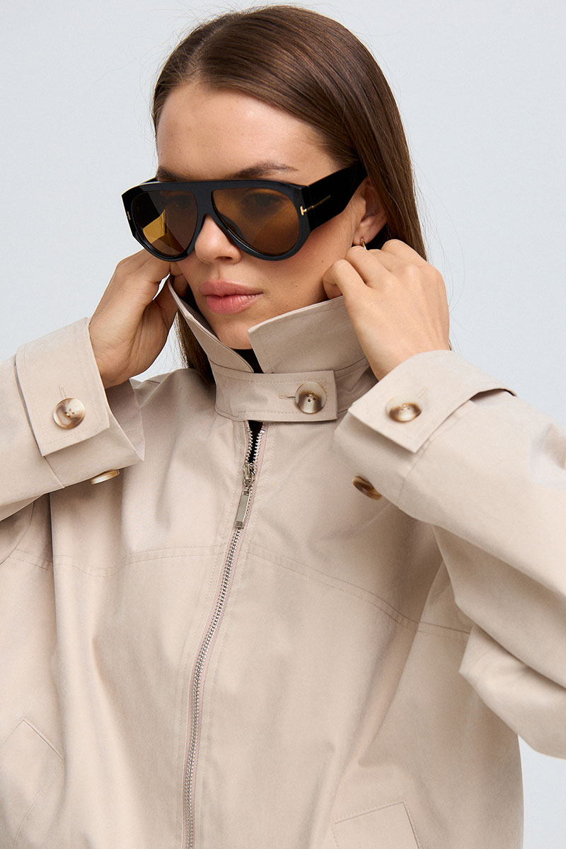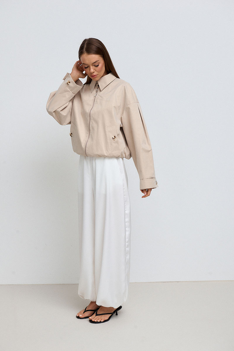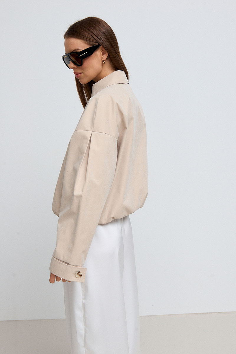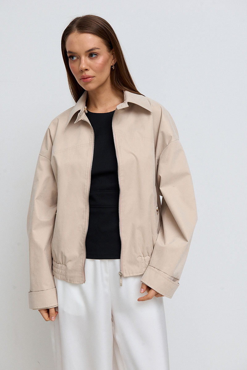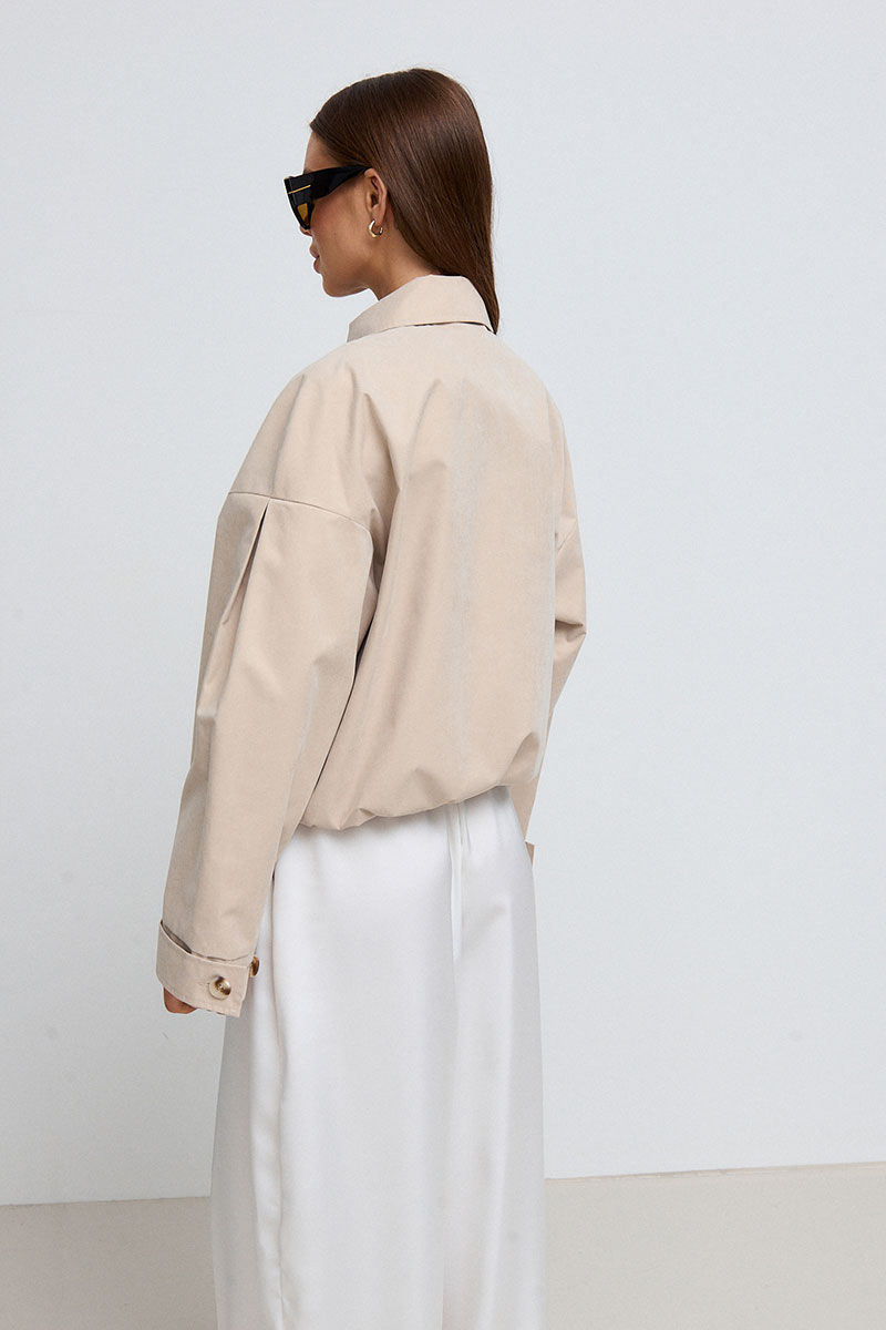 Жакет на подкладке. Рукав спущенный, длинный со складкой, низ рукава на манжете, который с помощью паты регулируется. Жакет на молнии, воротник-стойка, который застёгивается на пуговицу. На переде и спинке расположена кокетка и карманы с декоративной пуговицей. Низ изделия частично на резинке.