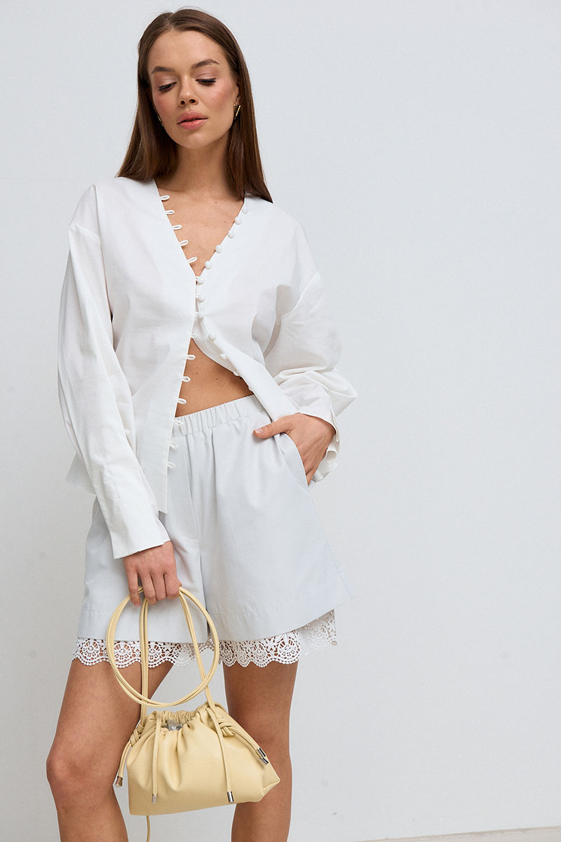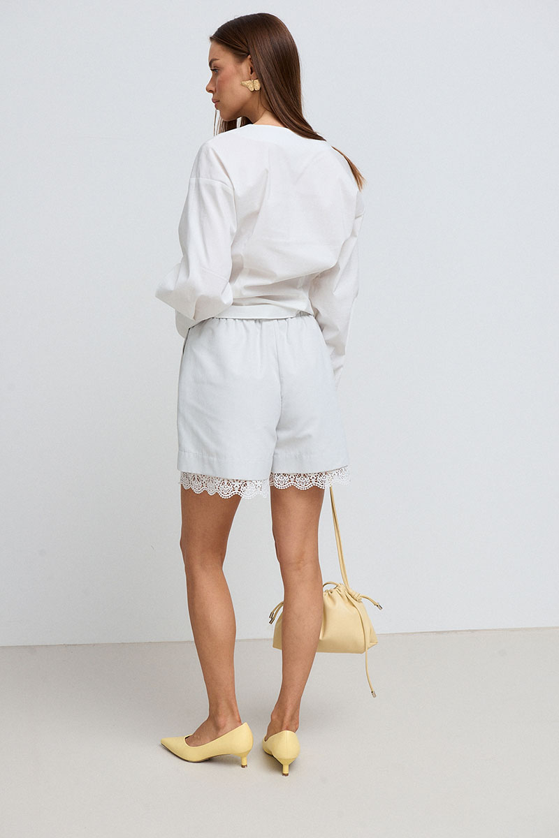 Шорты женские короткие, на хлопковой подкладке с кружевом. Пояс на резинке, с декоративным гульфиком и функциональными боковыми карманами.