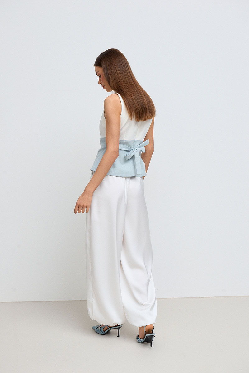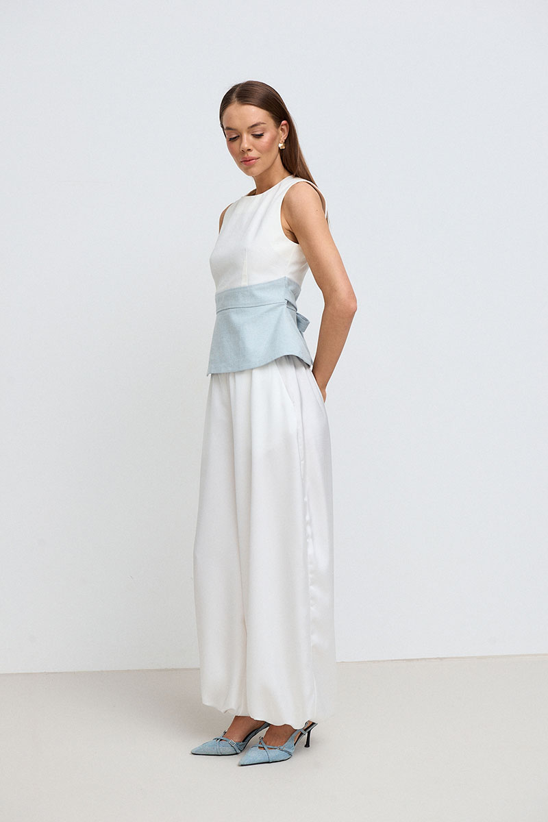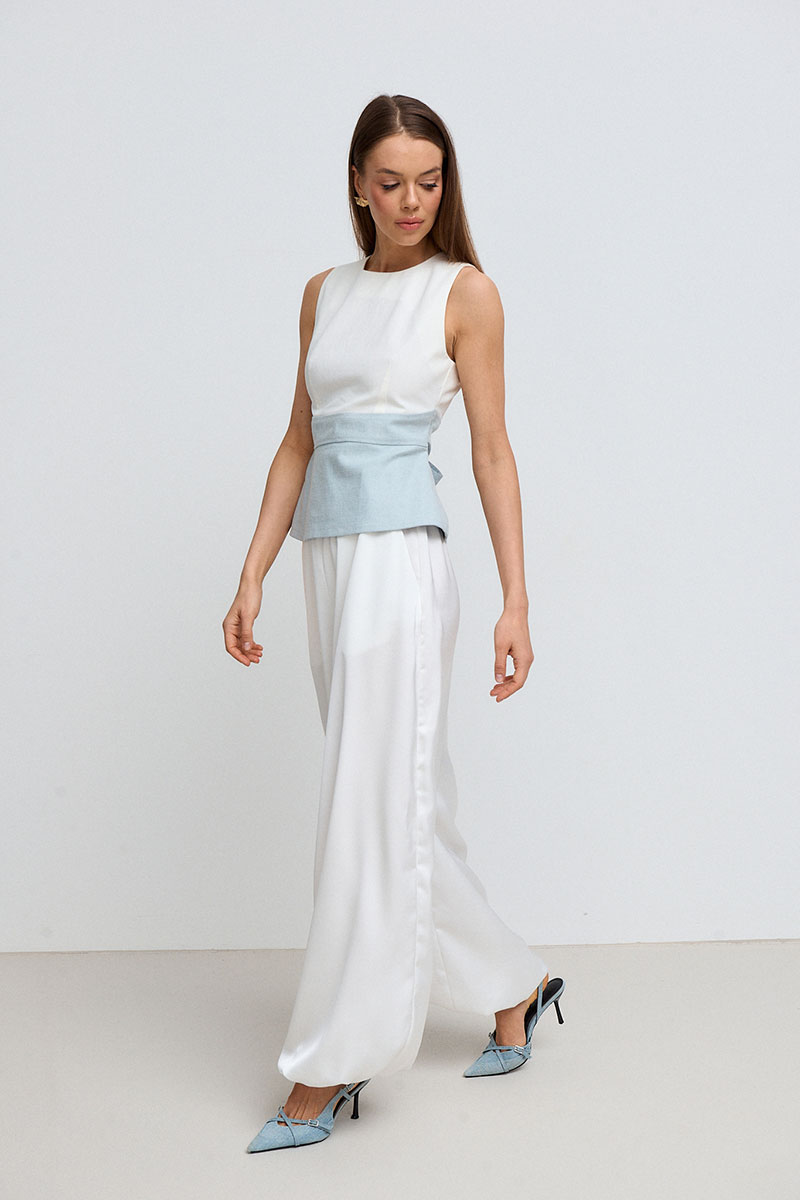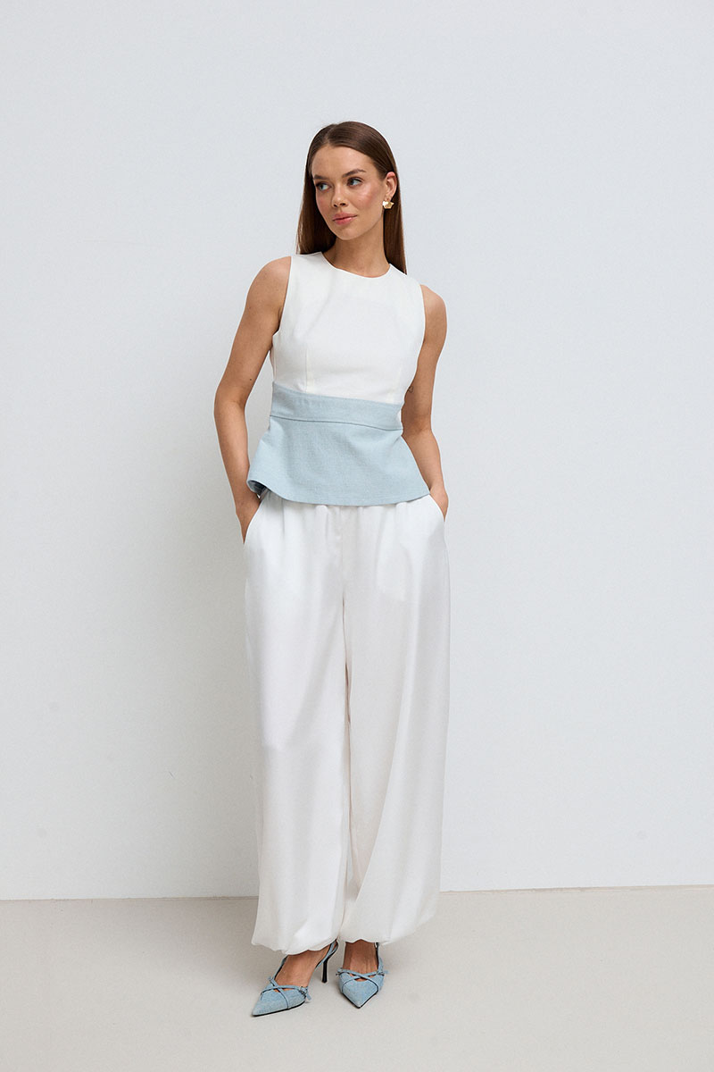 Топ женский, приталенного силуэта с баской. Талия завышена, ниже линии груди и выше линии талии расположен рельеф. По бокам топ имеет завязки, которыми можно регулировать талию. Топ по спинке, застёгивается на потайную молнию и пуговицу.