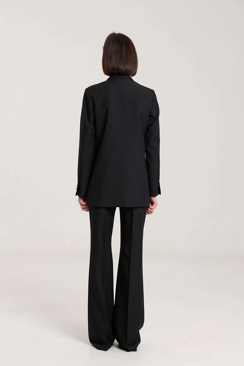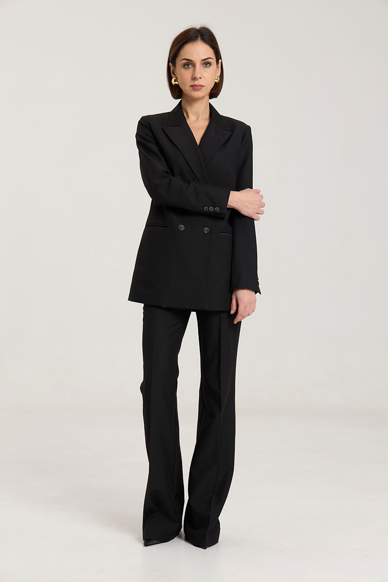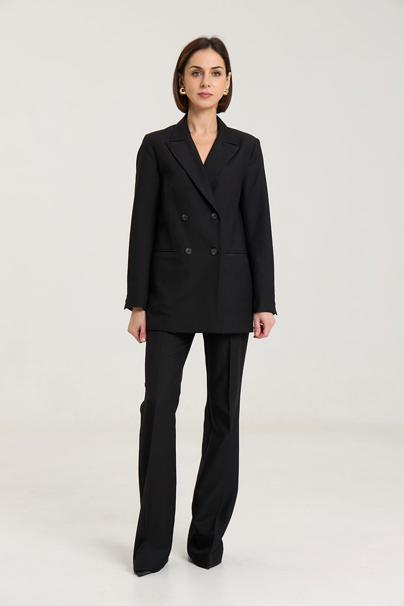 Комплект двухпредметный из жакета и брюкЖакет двубортный, с нагрудными выточками, прорезные карманы в рамку с клапанами, застежка на петли и пуговицы, спинка со средним швом, втачные двухшовные рукава, с тремя отделочными пуговицами,жакет на подкладке. Выполнен из премиальной ткани костюмной группы.Классические расклешенные брюки полупрелегающегоьсилуэта с высокрй посадкой, пояс притачной со шлевками, застежка на молнию и петлю-пуговицу, брюки без карманов. Выполнены из премиальной ткани костюмной группы.