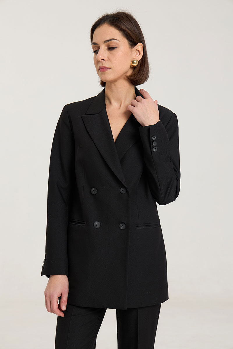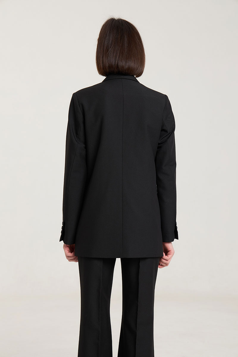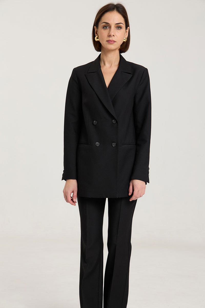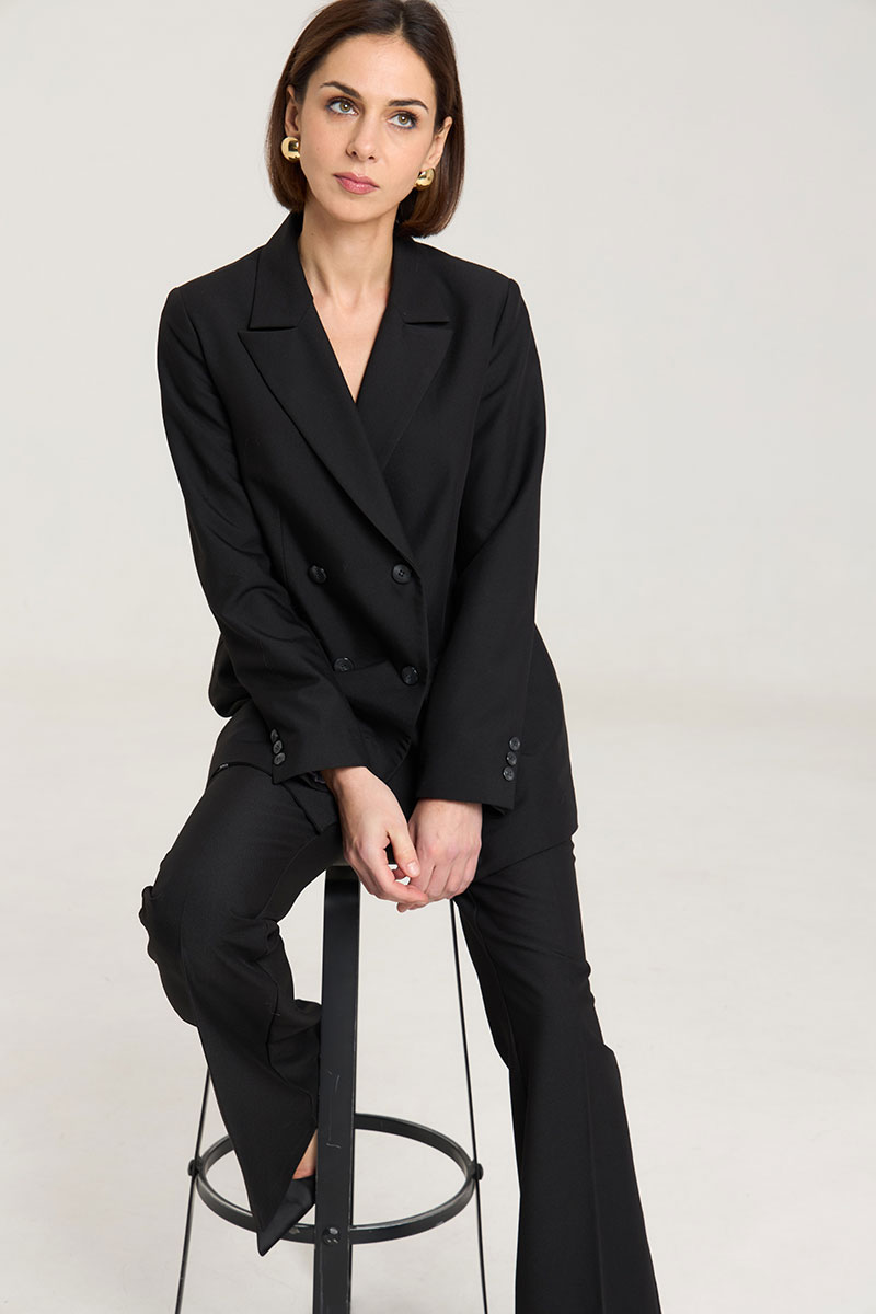 Комплект двухпредметный из жакета и брюкЖакет двубортный, с нагрудными выточками, прорезные карманы в рамку с клапанами, застежка на петли и пуговицы, спинка со средним швом, втачные двухшовные рукава, с тремя отделочными пуговицами,жакет на подкладке. Выполнен из премиальной ткани костюмной группы.Классические расклешенные брюки полупрелегающегоьсилуэта с высокрй посадкой, пояс притачной со шлевками, застежка на молнию и петлю-пуговицу, брюки без карманов. Выполнены из премиальной ткани костюмной группы.