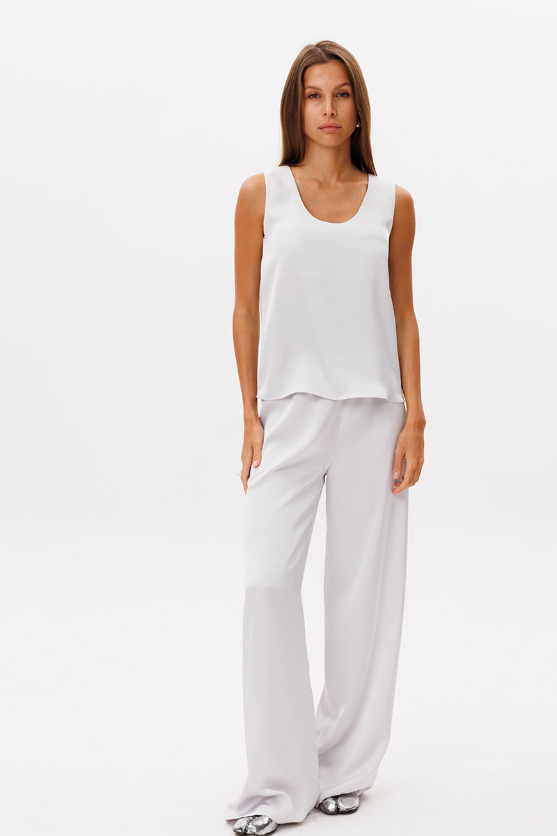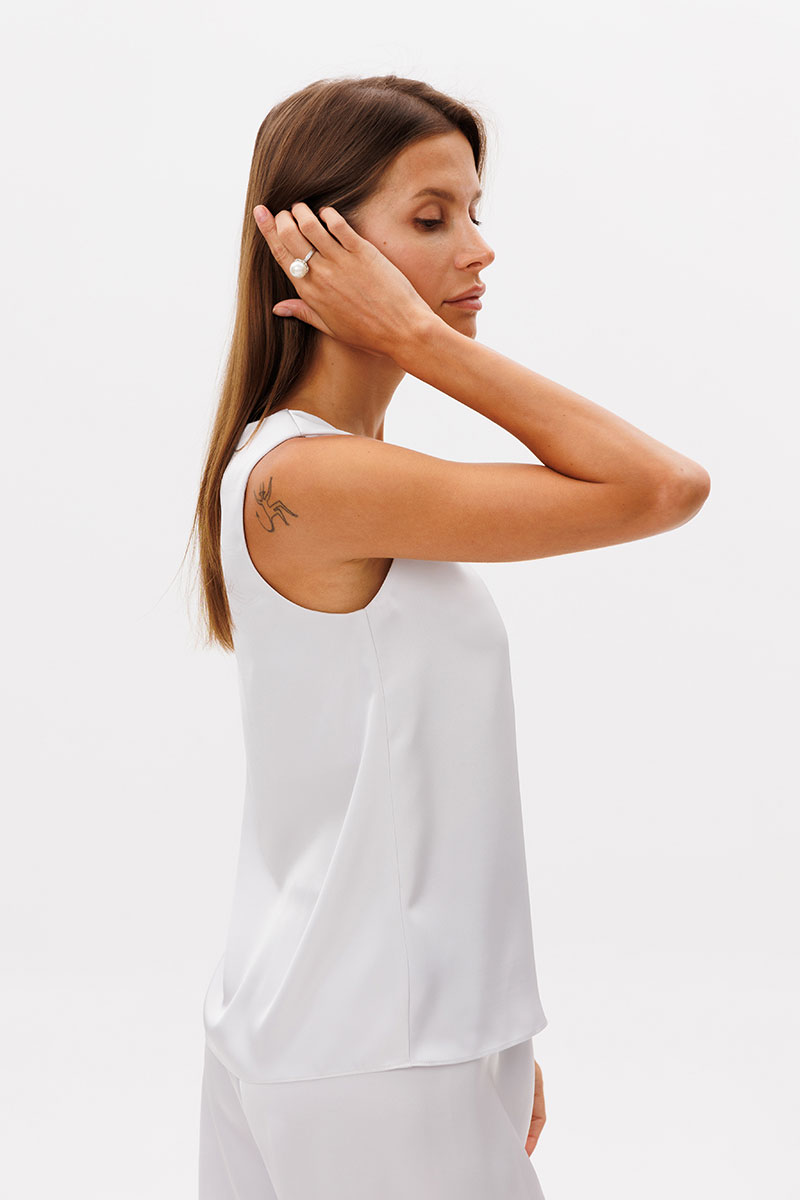Базовый топ прямого кроя без рукава на обтачке по переду и спинке. Выполнен из атласной ткани , подойдет как база под жакет, рубашку, для повседневного или офисного стиля.