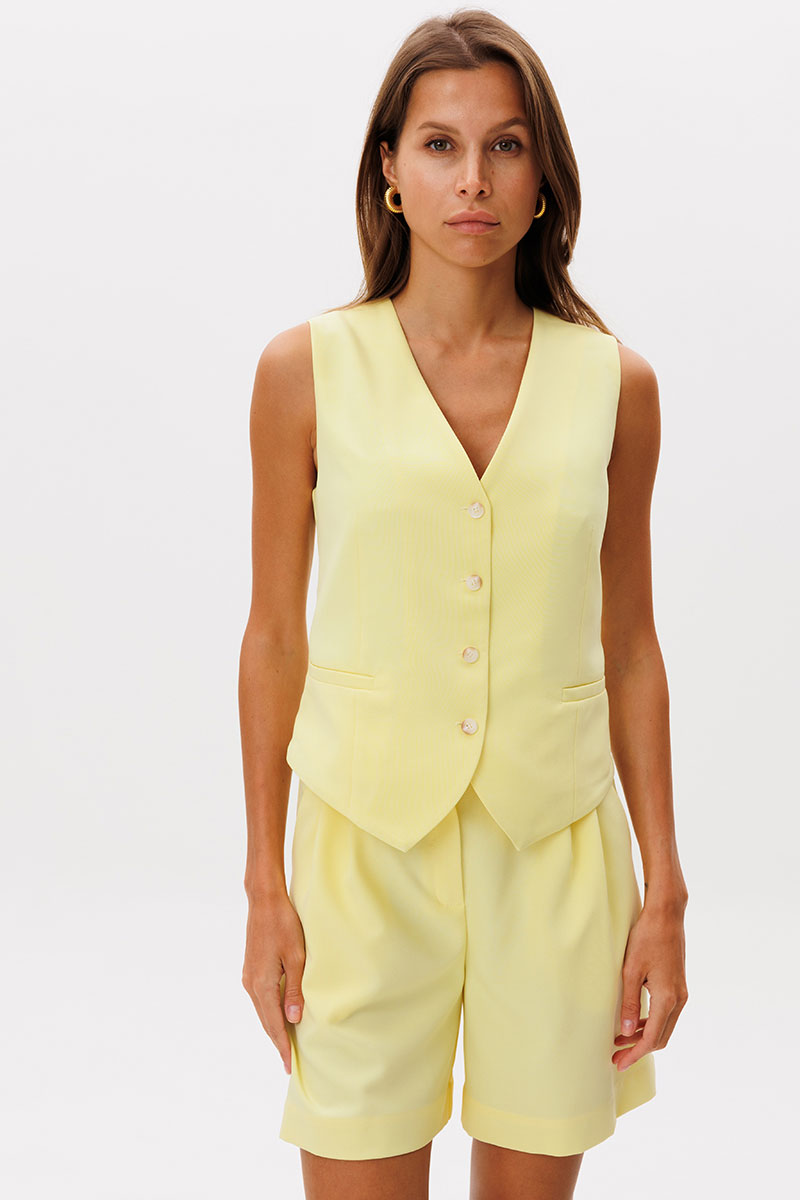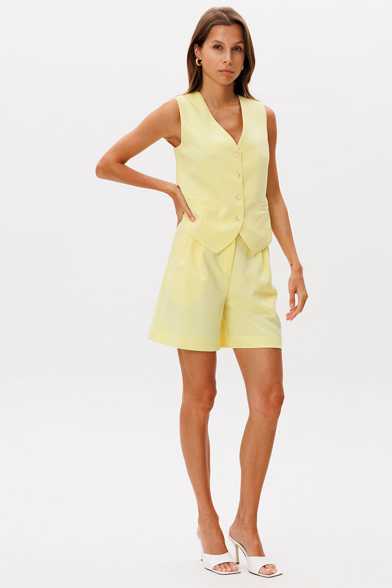 Шорты без подкладки, притачной пояс со шлевками, застежка на петлю-пуговицу и молнию, По переду защипы, высокая посадка, карманы боковые.