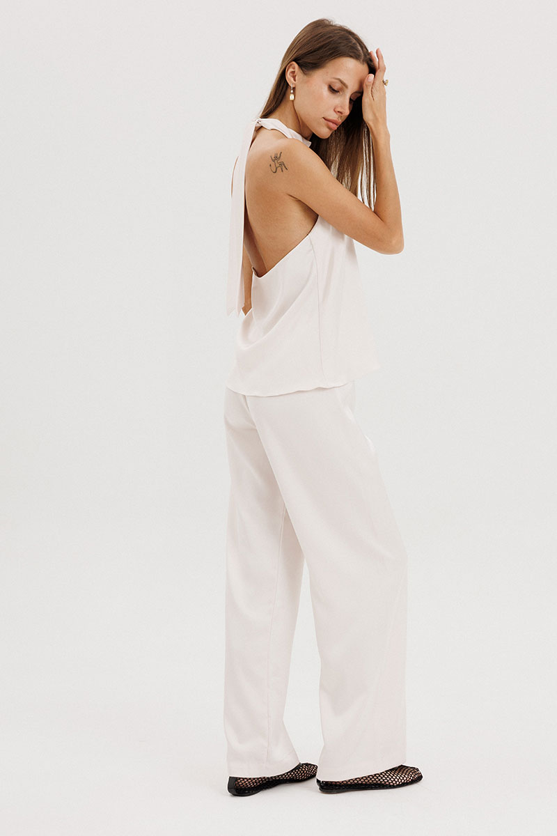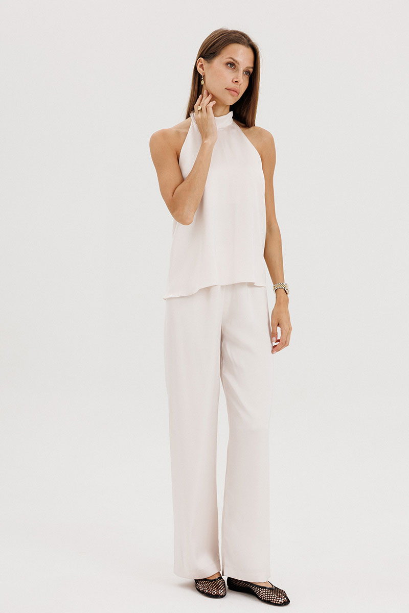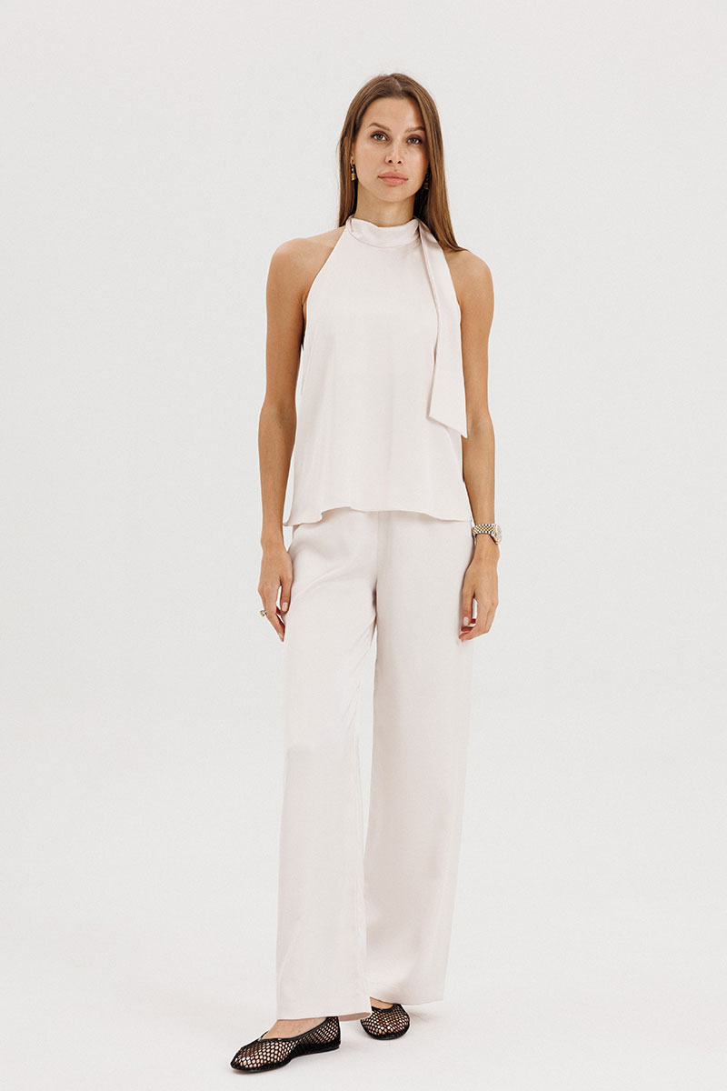 Комплект двухпредметный из топа и брюк. Прямые брюки из струящегося плотного атласа. Талия высокая, на резинке, длина по боковому шву 110 см. Топ свободного кроя выполнен из плотной атласной ткани, топ на обтачке, спинка провисает для эффектности. Топ можно нсить под люой жакет, либо с классическими брюками. Подойдет в качестве праздничного варианта. Завязывается на спине. Рост модели на фото 178 см.